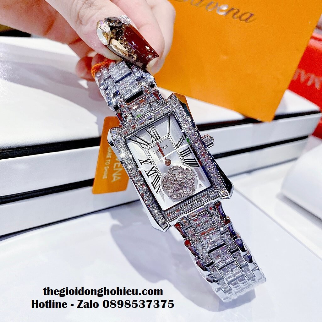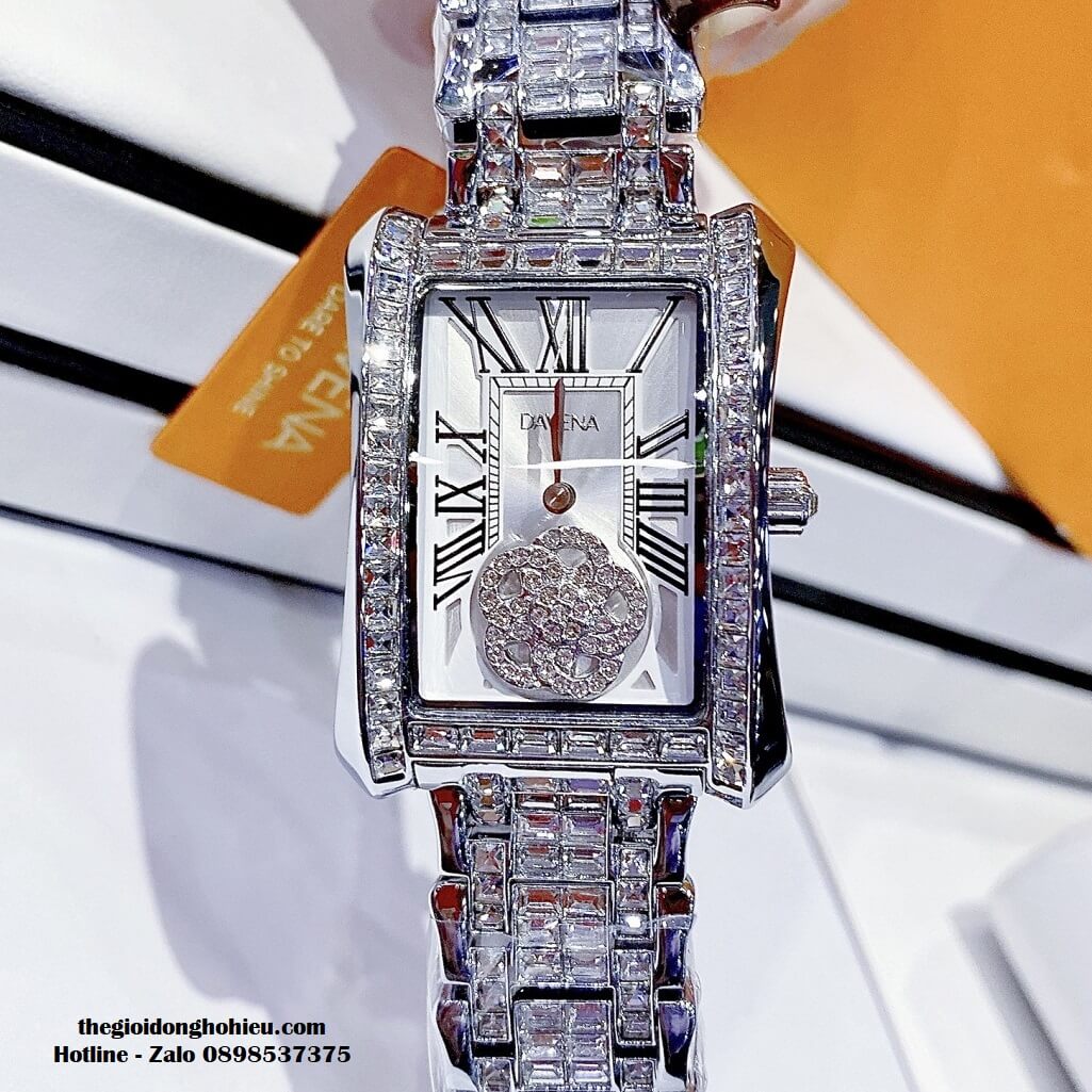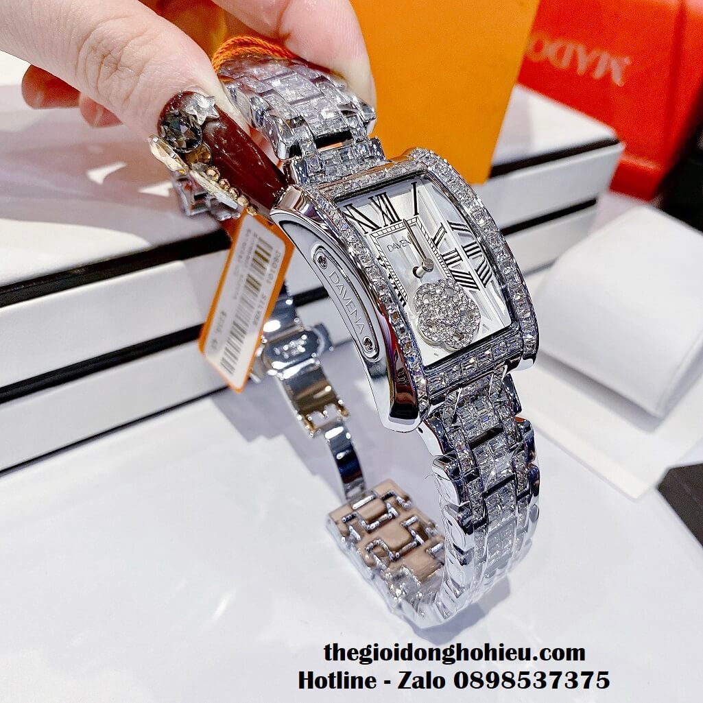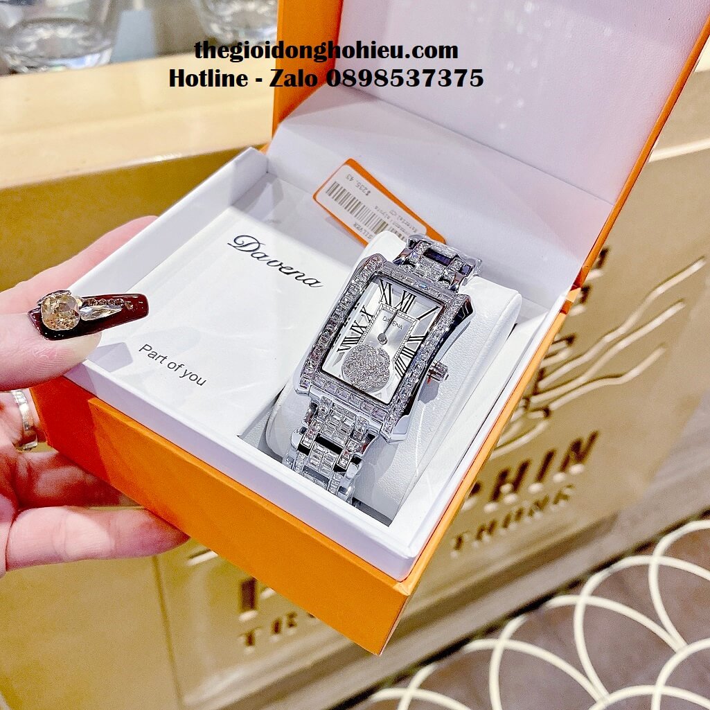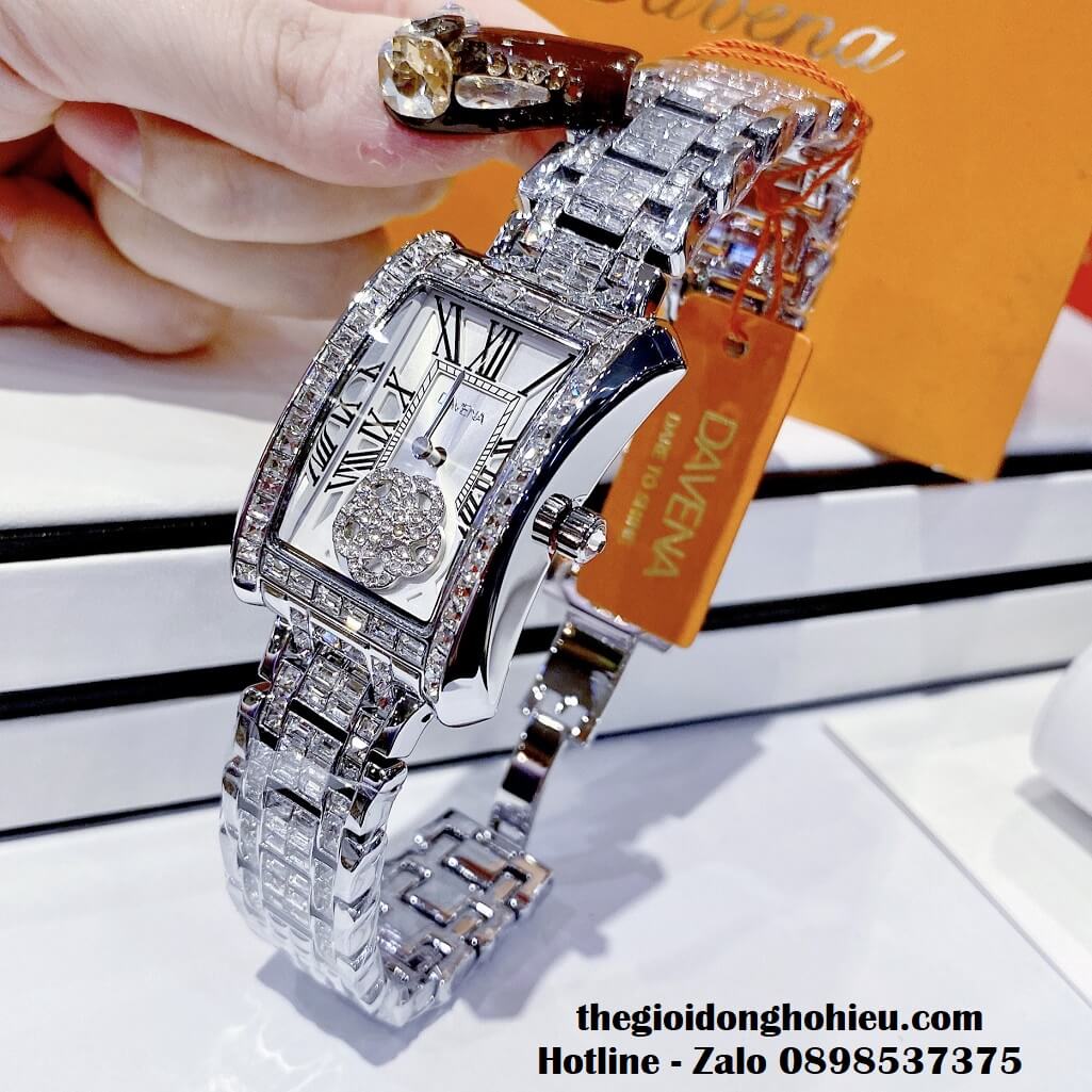 Hình ảnh đồng hồ Davena nữ chính hãng, đồng hồ mặt hình chữ nhật đính đá màu bạc sang trọng dành cho nữ, kiểu dáng đồng hồ Patek Philippe tiền tỷ