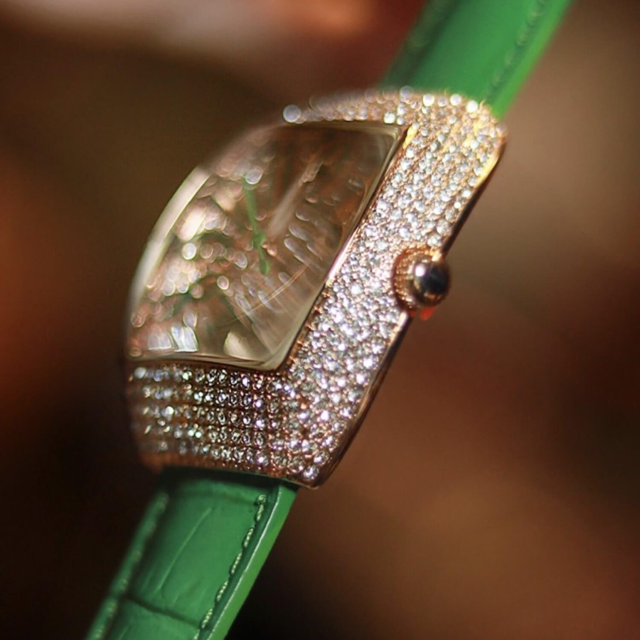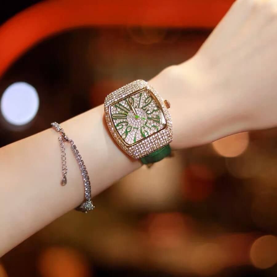 Toàn bộ mặt đồng hồ được đính đá swarovski quanh mặt lấp lánh