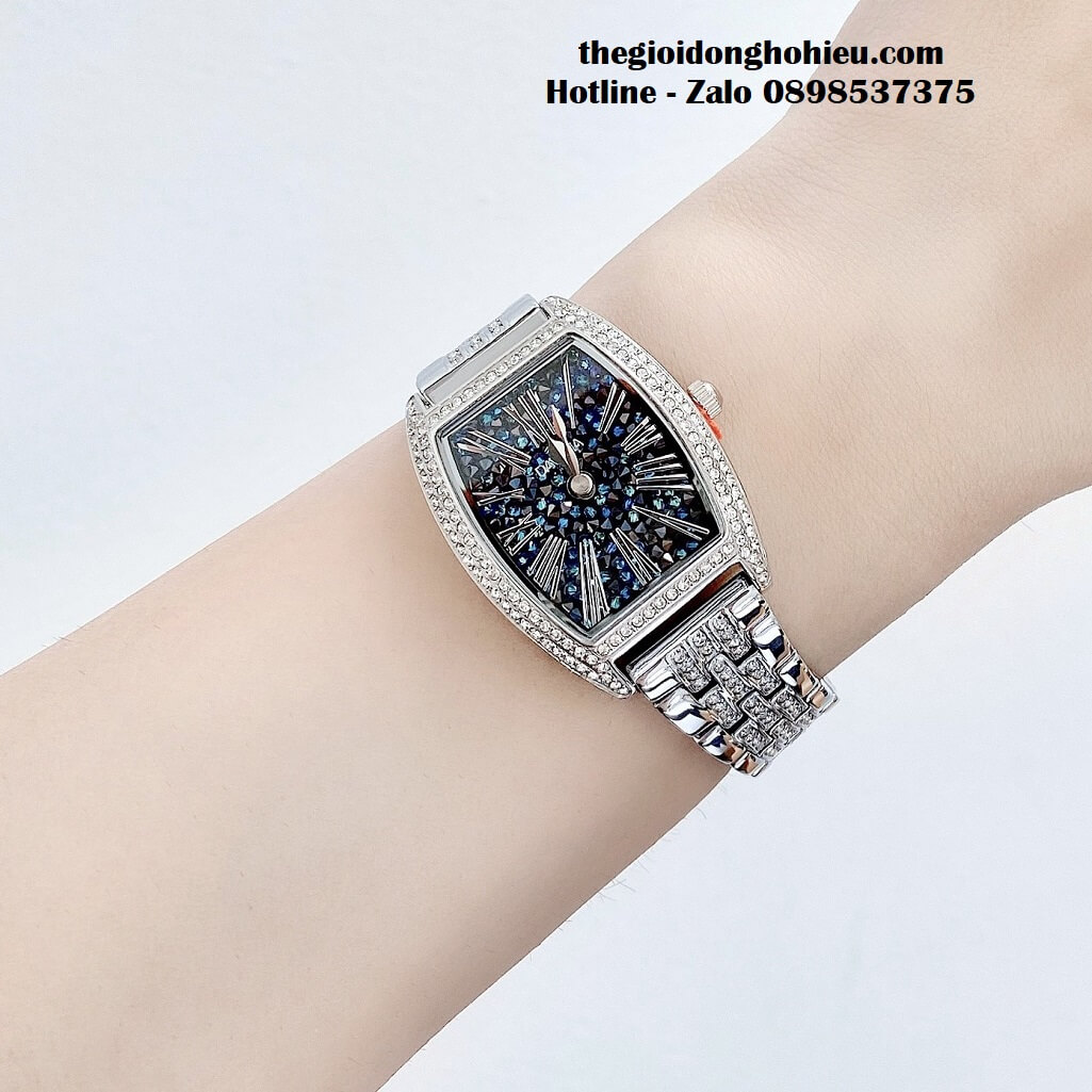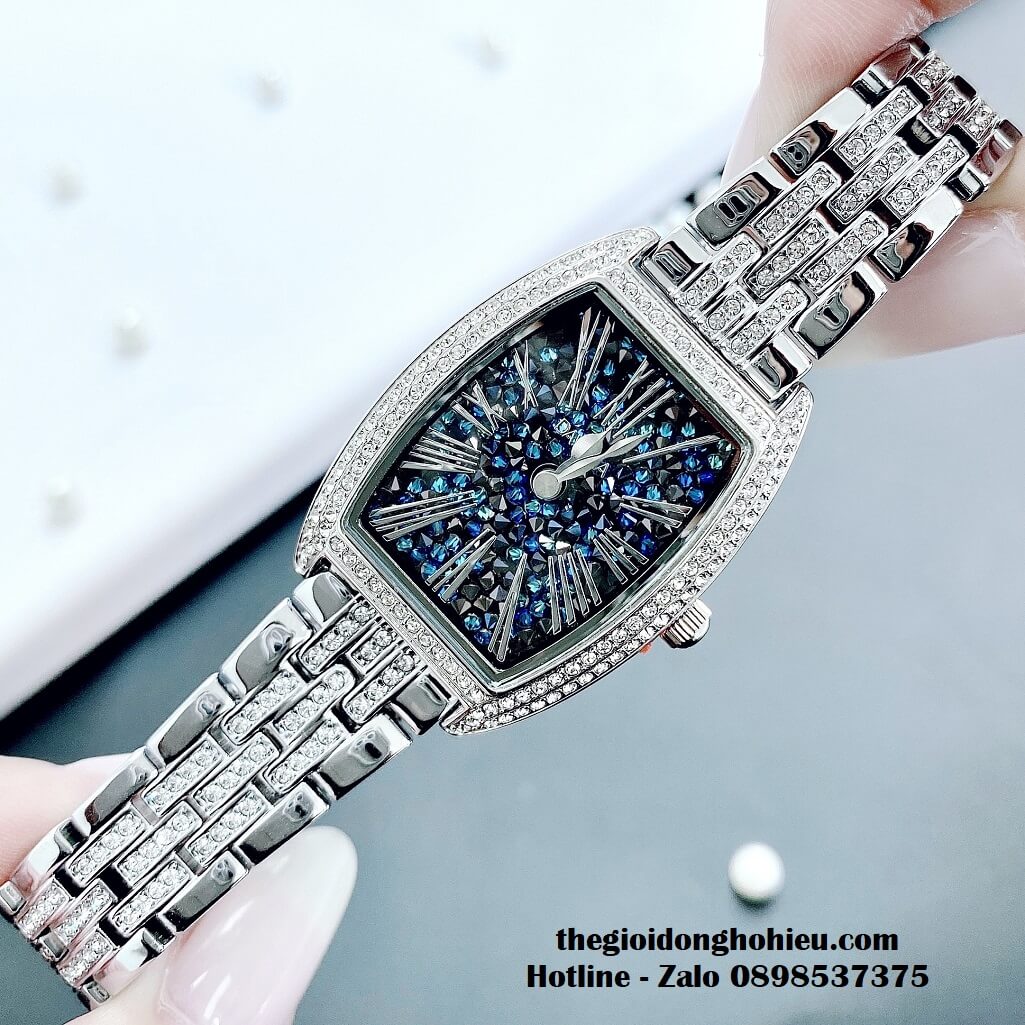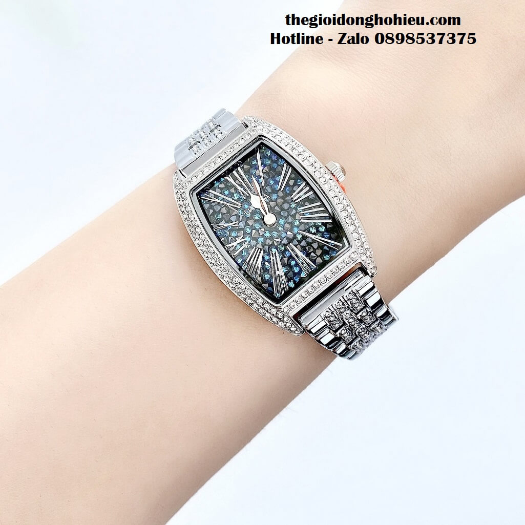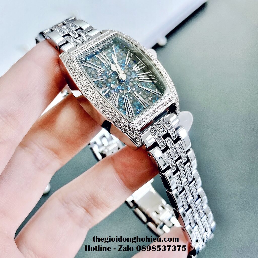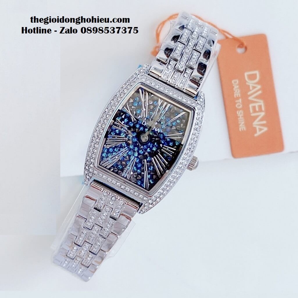 Đồng hồ Davena nữ chính hãng mặt chữ nhật được đính đá nhũ xanh mix đen, vỏ màu bạc - silver
