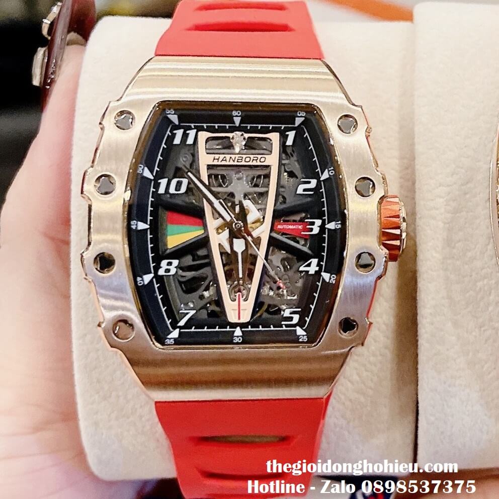 Hình Ảnh Đồng Hồ Hanboro Nam Tự Động Dây Silicone Đỏ Vỏ Rose 40x48mm 983