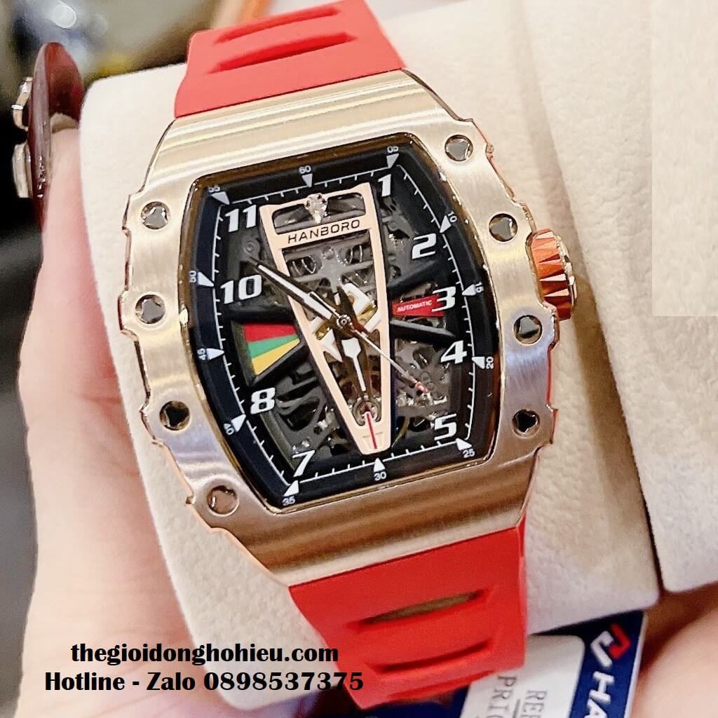 Đồng Hồ Hanboro Nam Tự Động Dây Silicone Đỏ Vỏ Rose 40x48mm 983