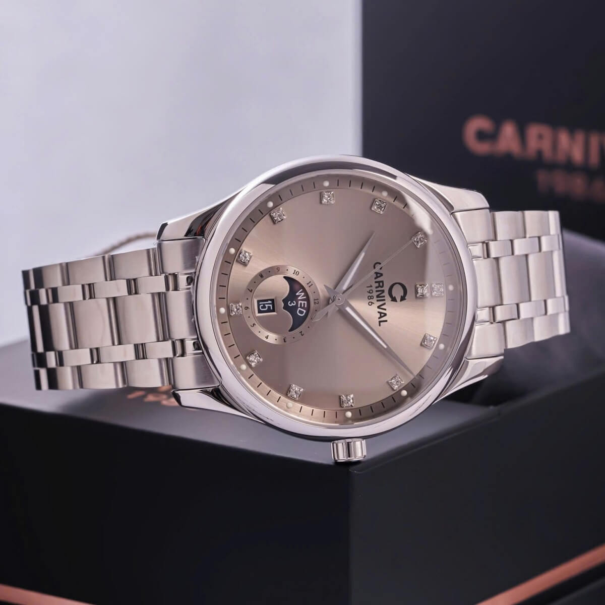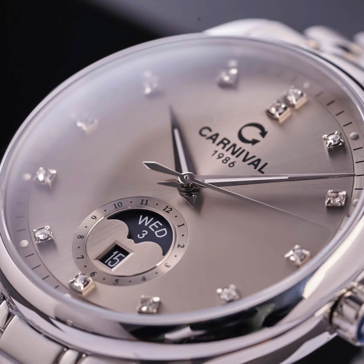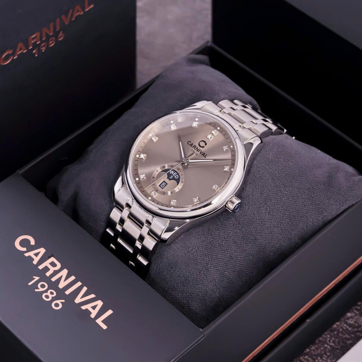 Carnival 8105G Tự Động Mặt Xám Vỏ Silver 40mm mang phong cách tối giản hiện đại, hướng đến sự thanh lịch và tinh tế. Mặt số xám đậm chất nam tính, kết hợp với vỏ thép không gỉ silver sáng bóng, tạo nên một thiết kế sang trọng nhưng vẫn dễ phối cùng nhiều loại trang phục khác nhau.