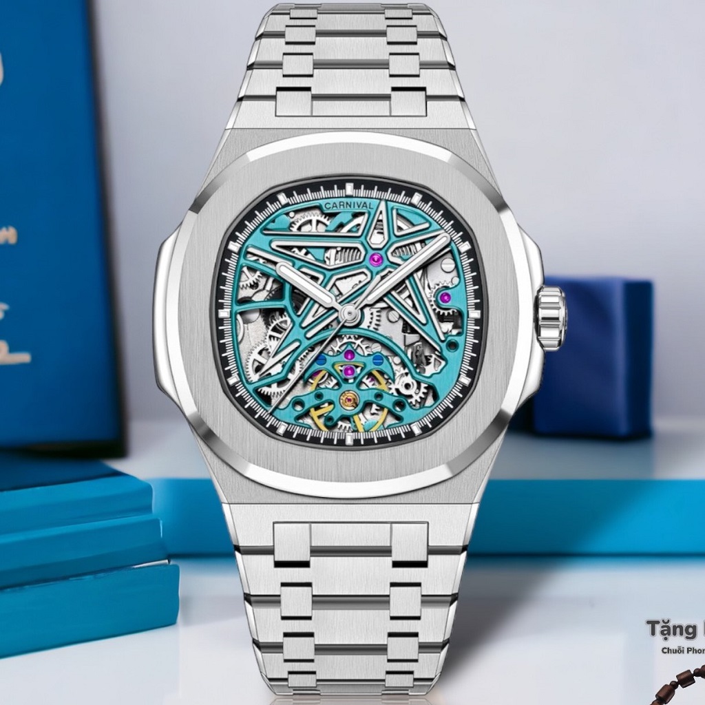 Kiểu dáng Patek Philippe Nautilus hở máy độc đáo. Dây inox lấp lánh bền bỉ ôm tay