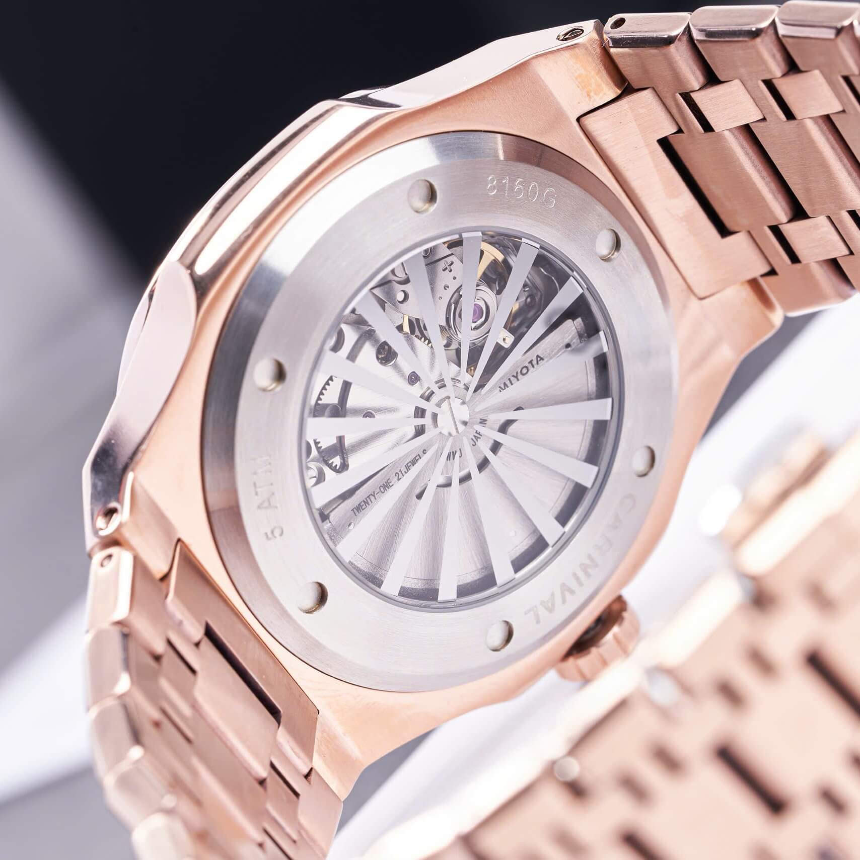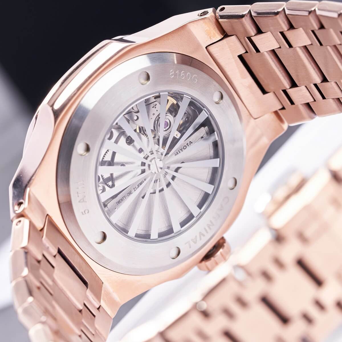Carnival 8160G được trang bị bộ máy cơ automatic, hoạt động bền bỉ, không cần thay pin. Máy cơ tượng trưng cho sự tỉ mỉ và kỹ thuật chế tác đỉnh cao – phù hợp với những người đàn ông yêu thích giá trị lâu dài, sự chính xác và cơ khí truyền thống.