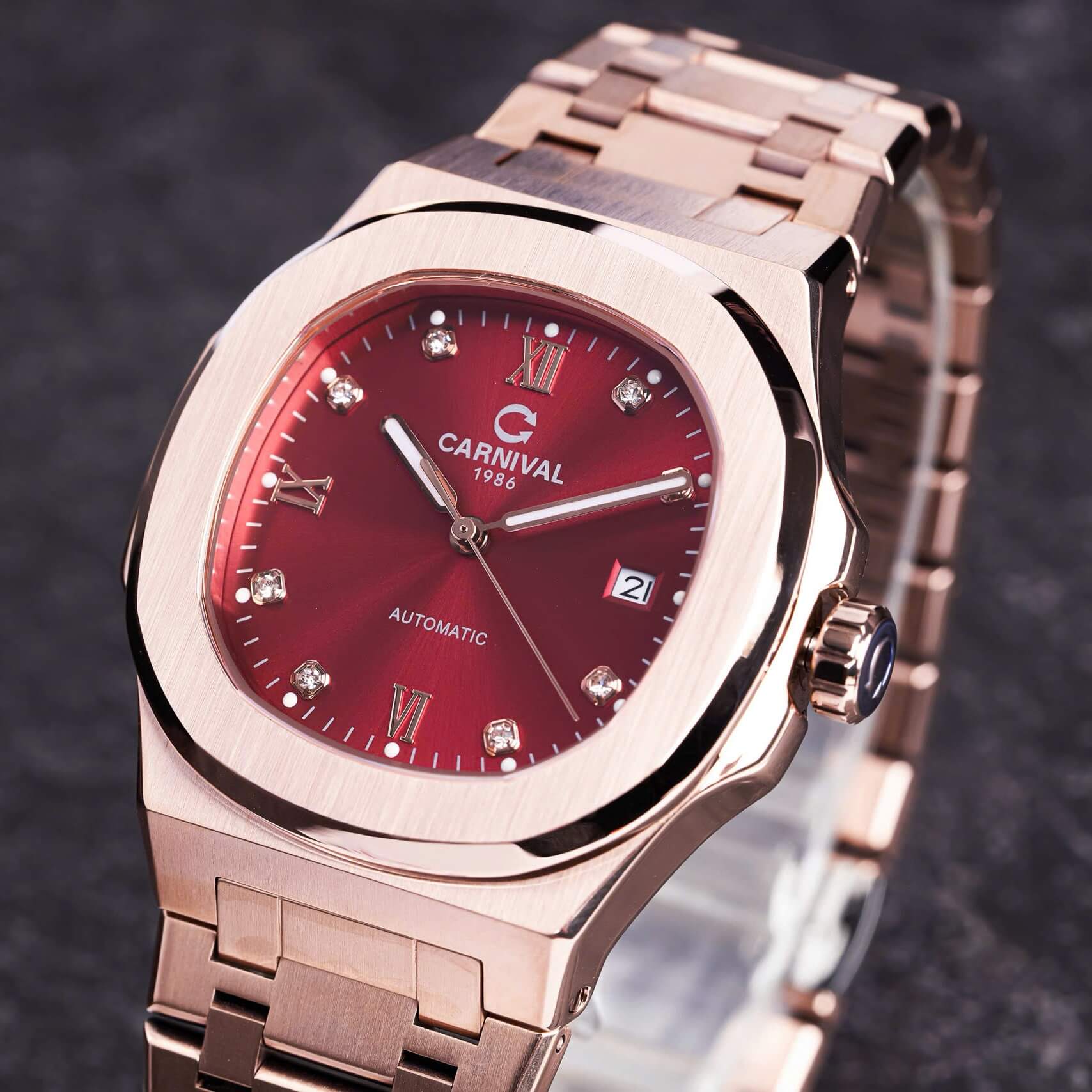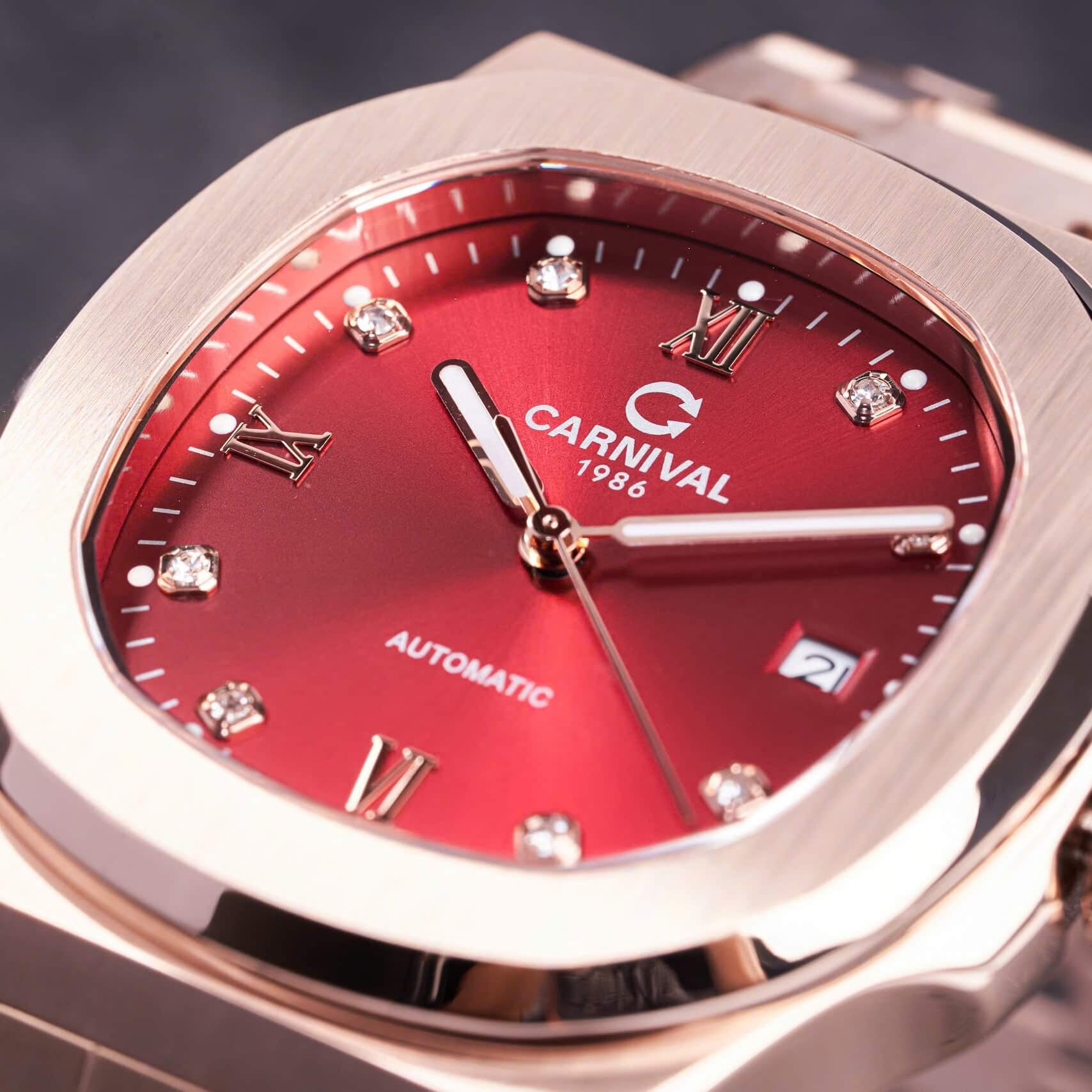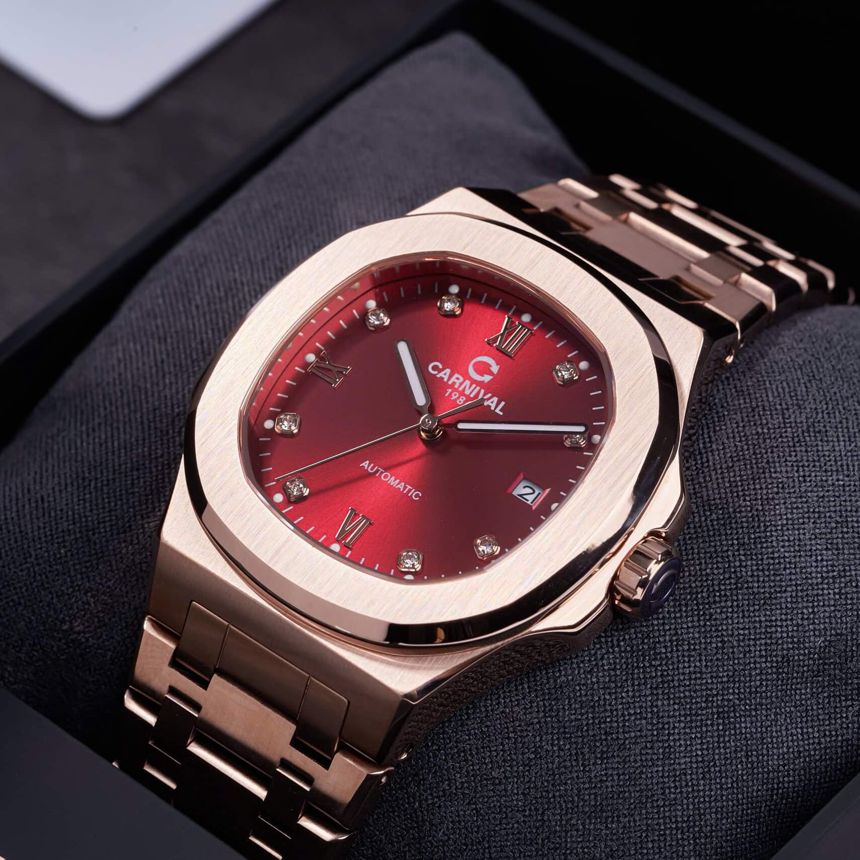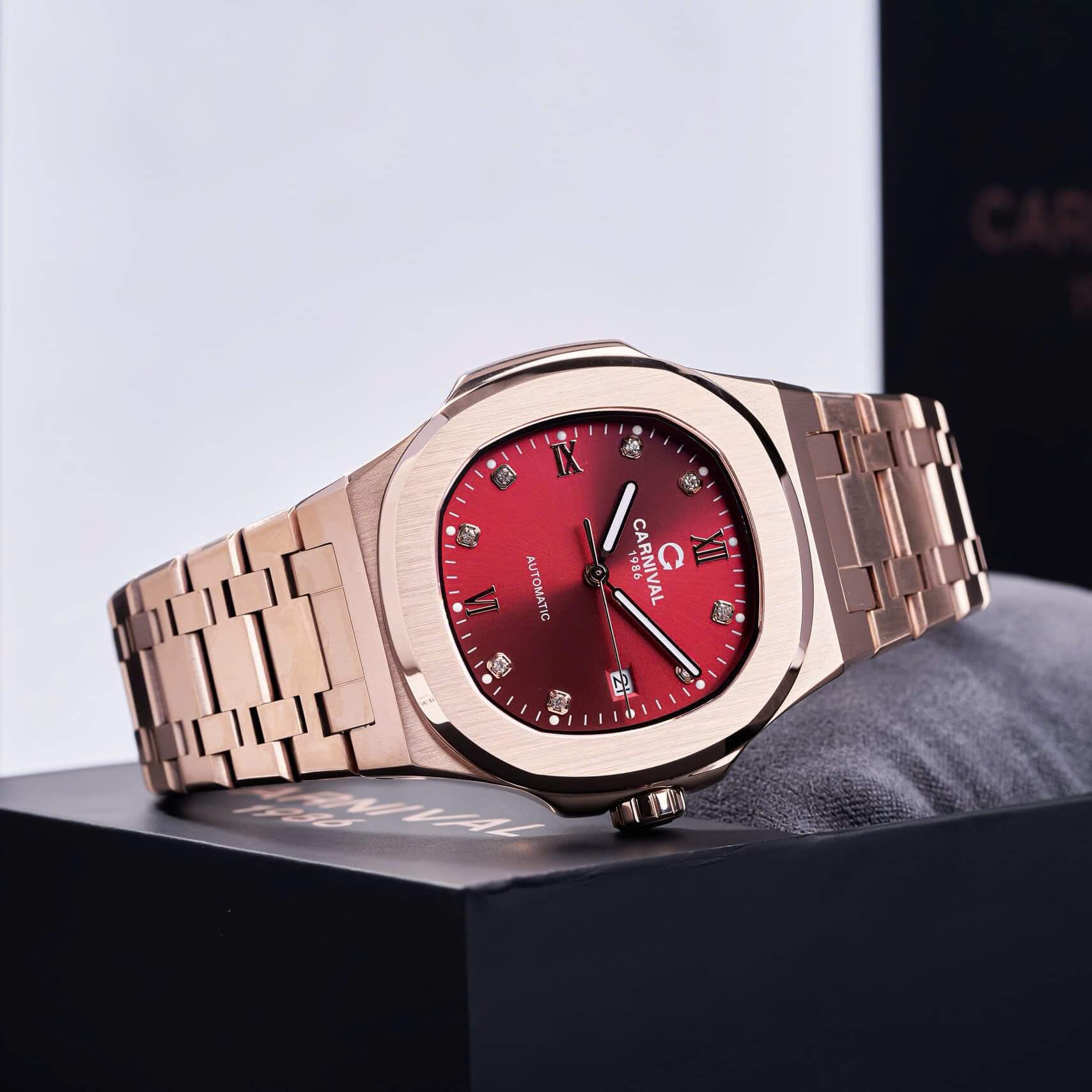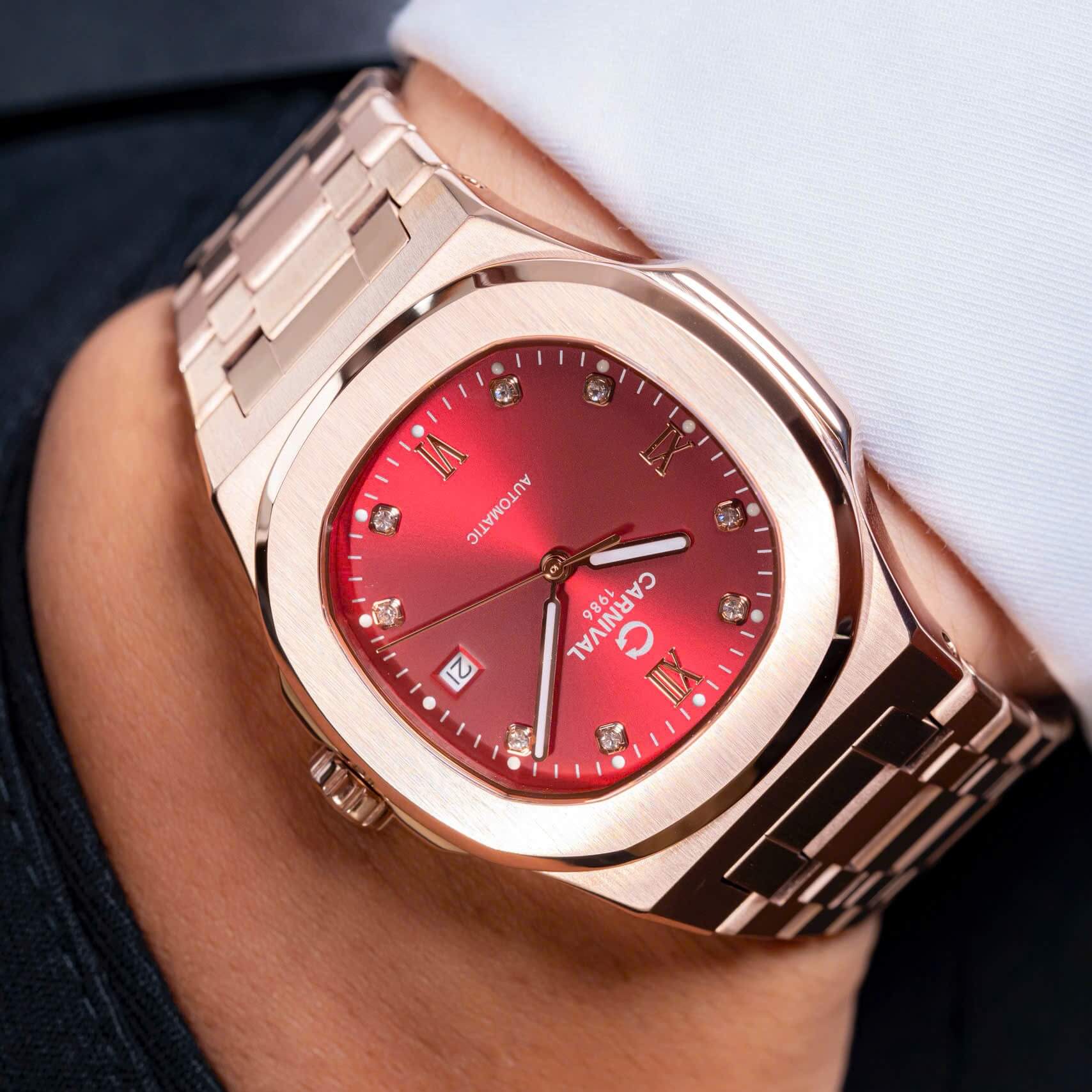 Mang trong mình vẻ đẹp mạnh mẽ của thiết kế cổ điển pha lẫn hiện đại, Carnival 8160G mặt đỏ dây kim loại vàng hồng size 41mm là mẫu đồng hồ cơ nam đáng sở hữu dành cho quý ông yêu thích sự khác biệt, sang trọng và đẳng cấp. Đây không chỉ là cỗ máy thời gian mà còn là tuyên ngôn về phong cách sống.