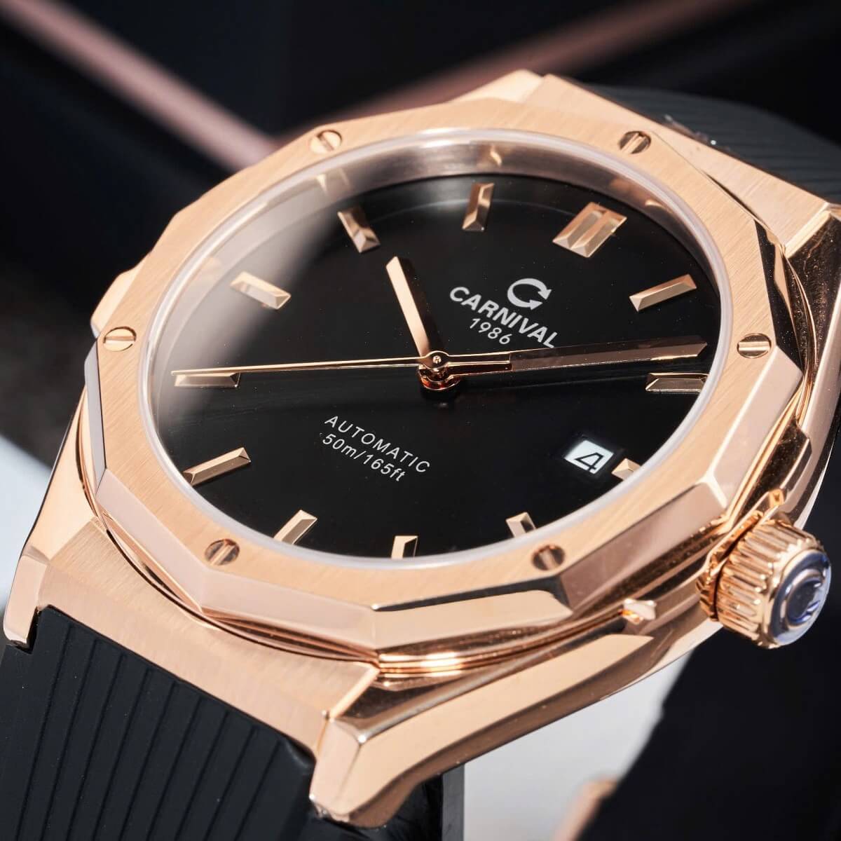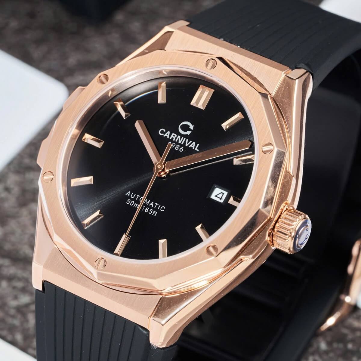 Carnival 8168G Tự Động Mặt Đen Dây Cao Su Đen Vỏ Vàng Hồng 42mm là mẫu đồng hồ cao cấp dành cho nam giới yêu thích sự mạnh mẽ, nam tính nhưng không kém phần tinh tế. Với thiết kế hiện đại, gam màu tương phản đen – vàng hồng cuốn hút, sản phẩm nhanh chóng trở thành lựa chọn hàng đầu cho doanh nhân, dân văn phòng, người yêu đồng hồ cơ.