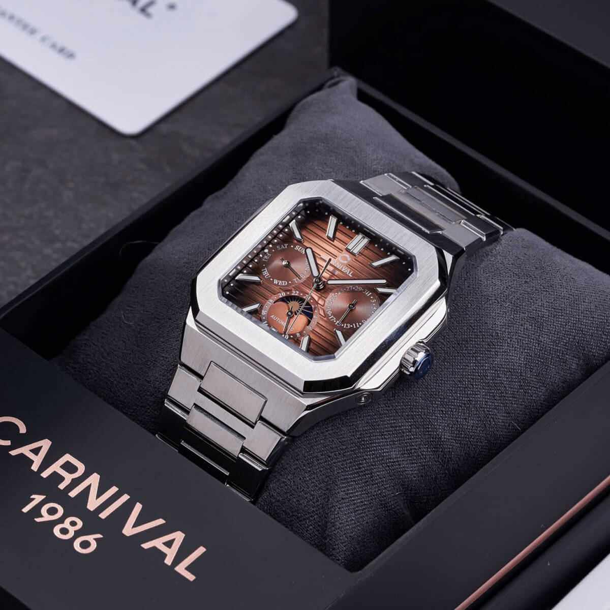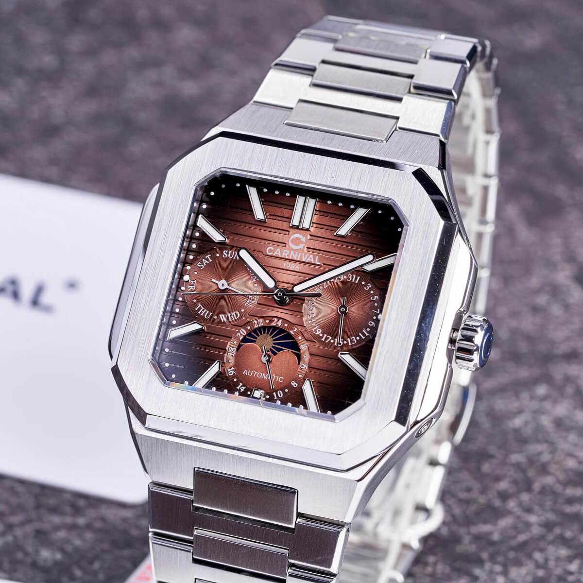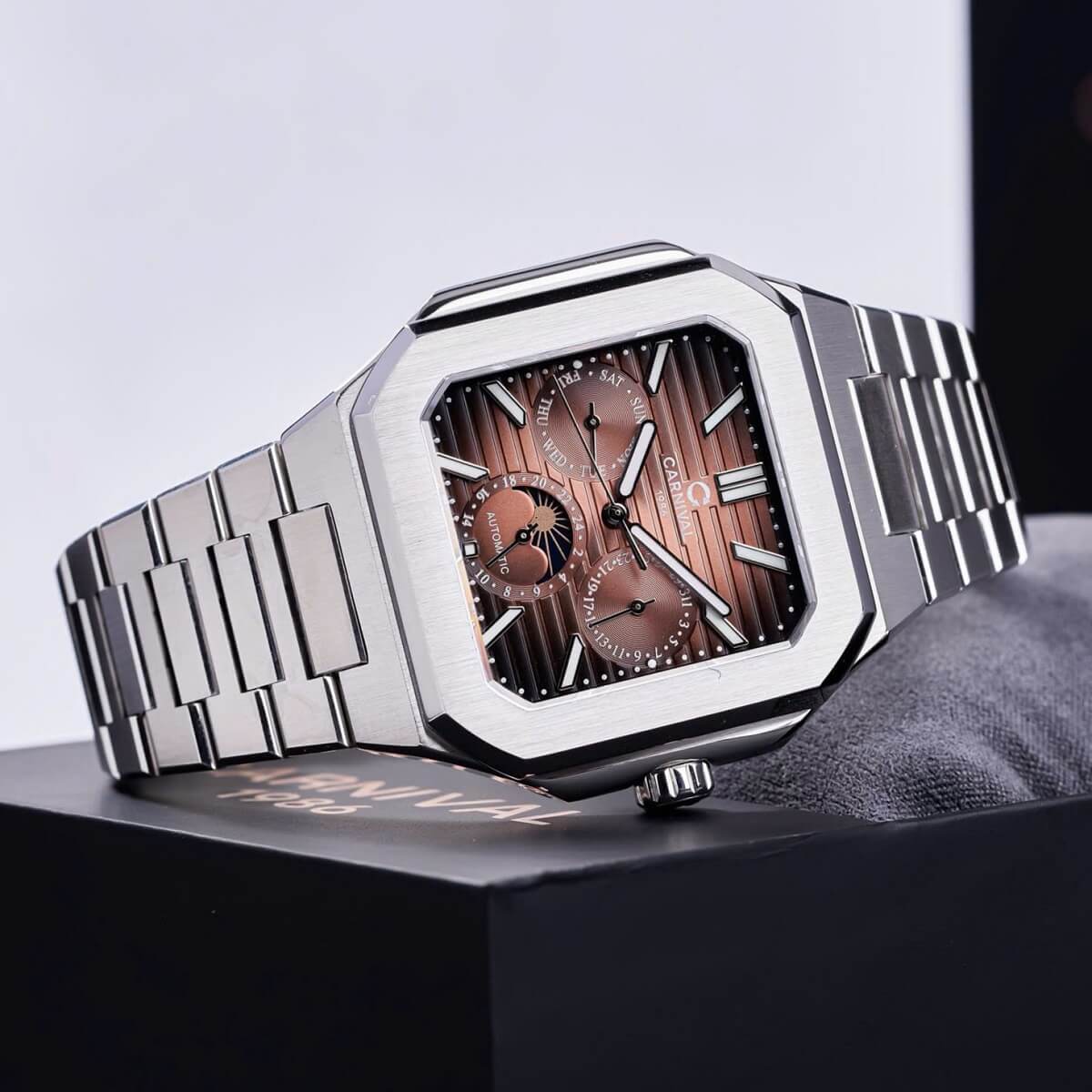 Carnival 8187G sở hữu mặt đồng hồ tròn với màu nâu cà phê nam tính, kết hợp dây kim loại silver sáng bóng, tạo nên tổng thể hài hòa, lịch lãm. Thiết kế 6 kim giúp hiển thị đa chức năng, từ giờ – phút – giây đến lịch ngày, thứ và 24 giờ.