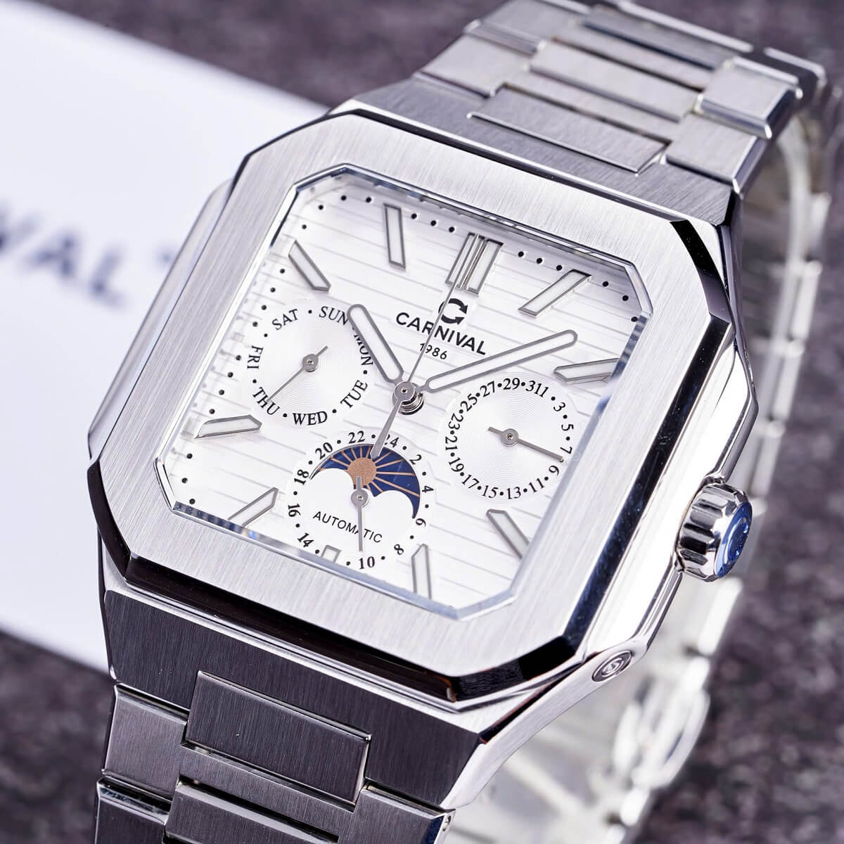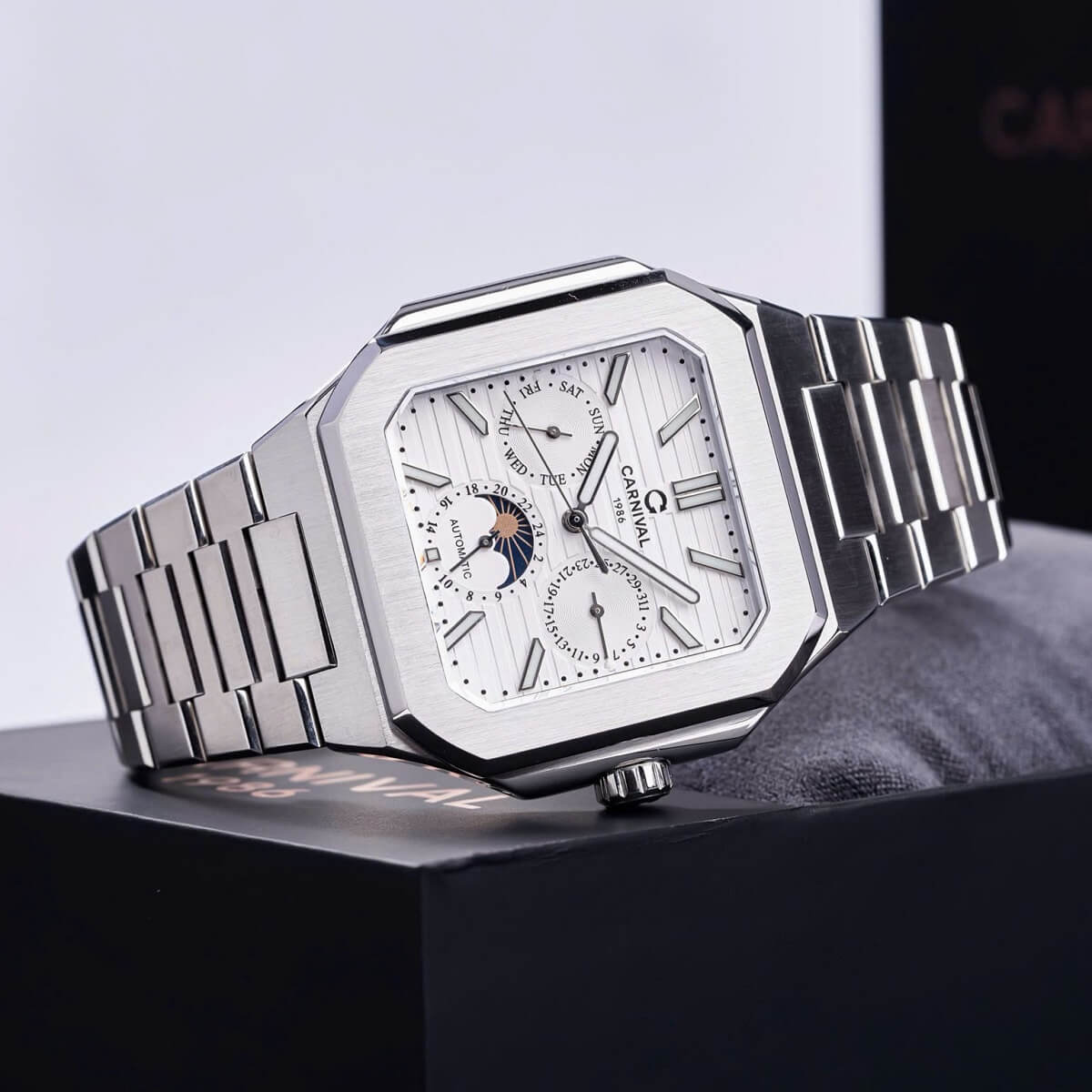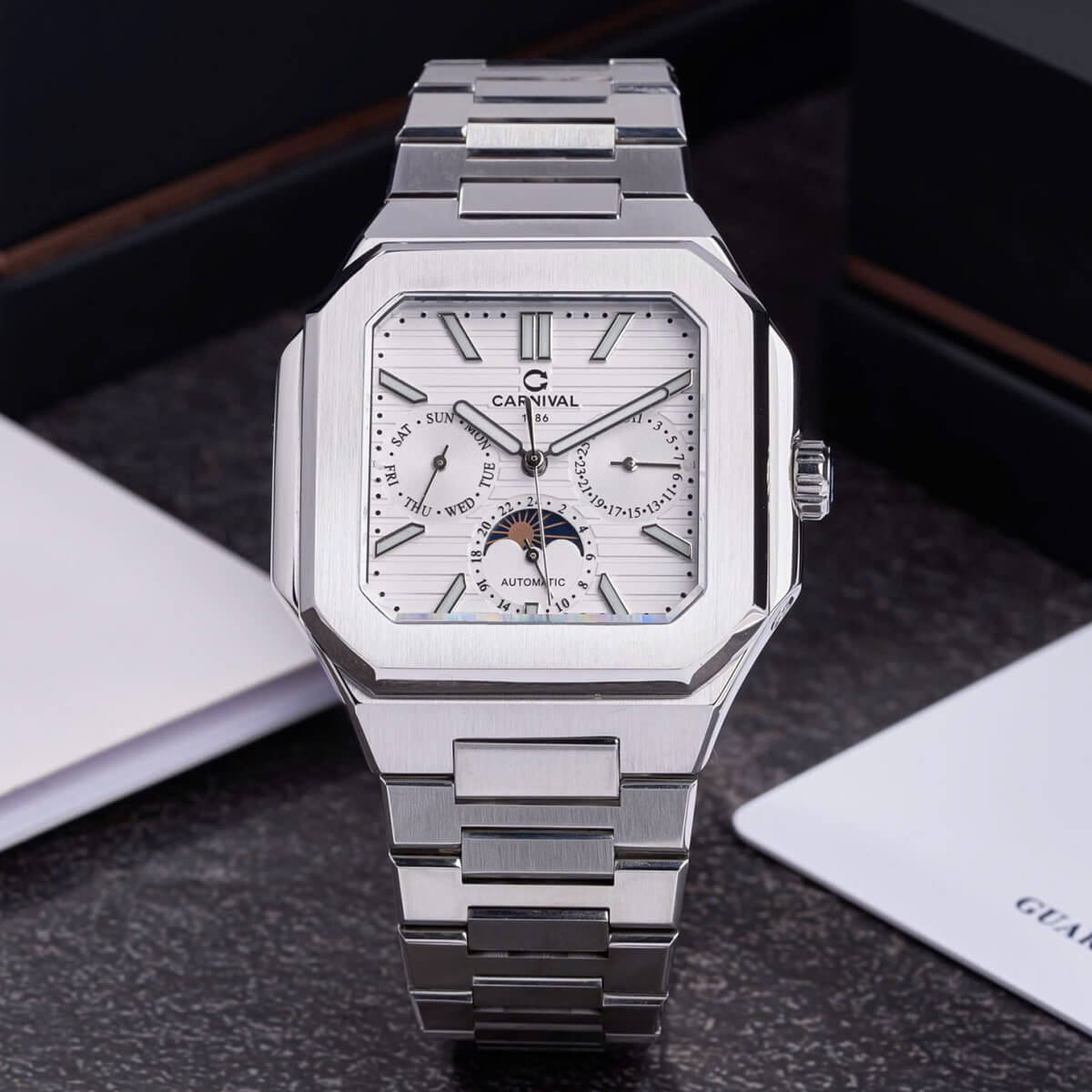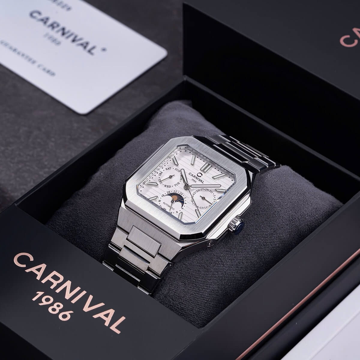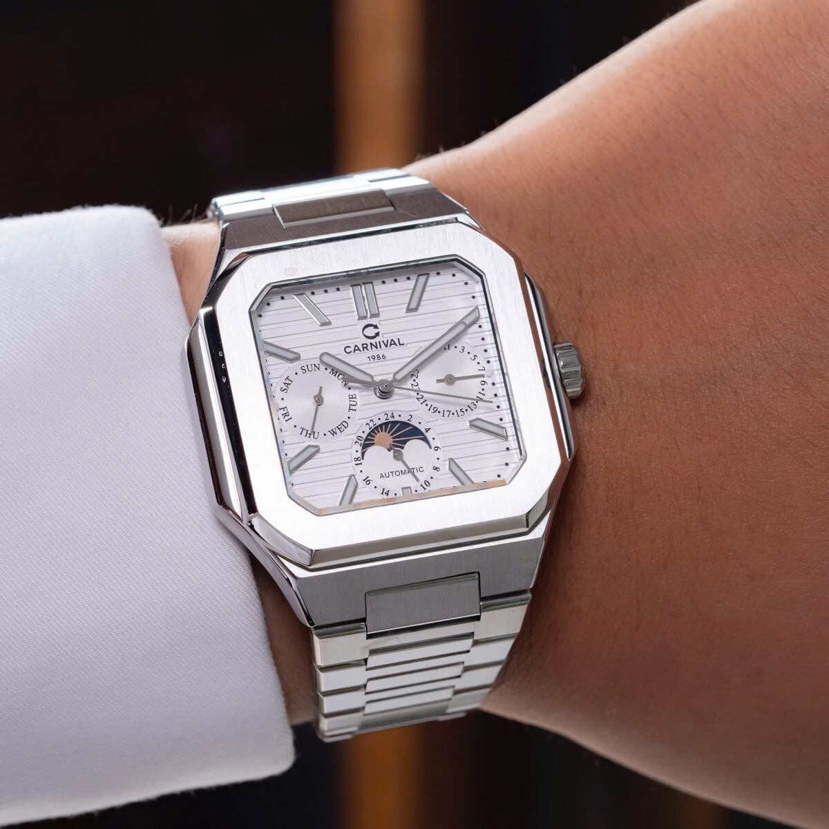 Carnival 8187G sử dụng bộ máy cơ automatic cao cấp, vận hành êm ái, không cần dùng pin. Mỗi chuyển động cổ tay đều giúp đồng hồ tự lên dây cót. Phiên bản 6 kim thể hiện độ phức tạp và đẳng cấp trong chế tác – xứng đáng là lựa chọn của những quý ông hiểu giá trị của thời gian.