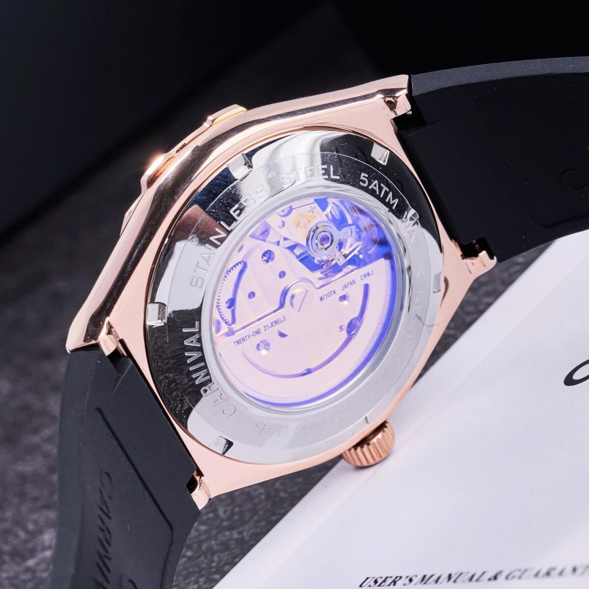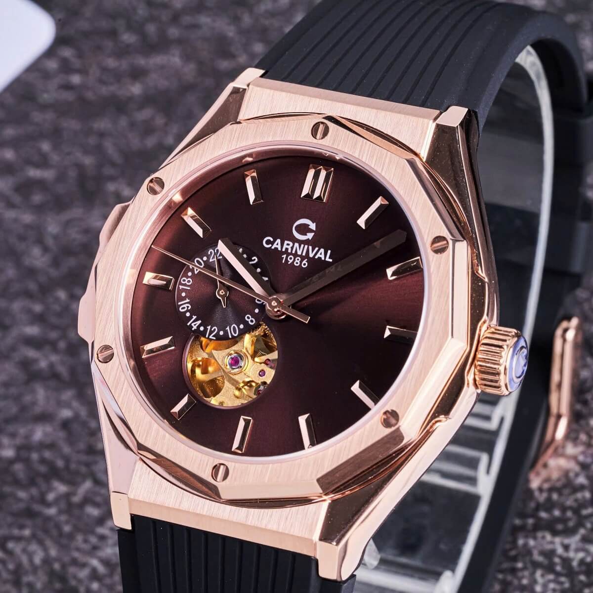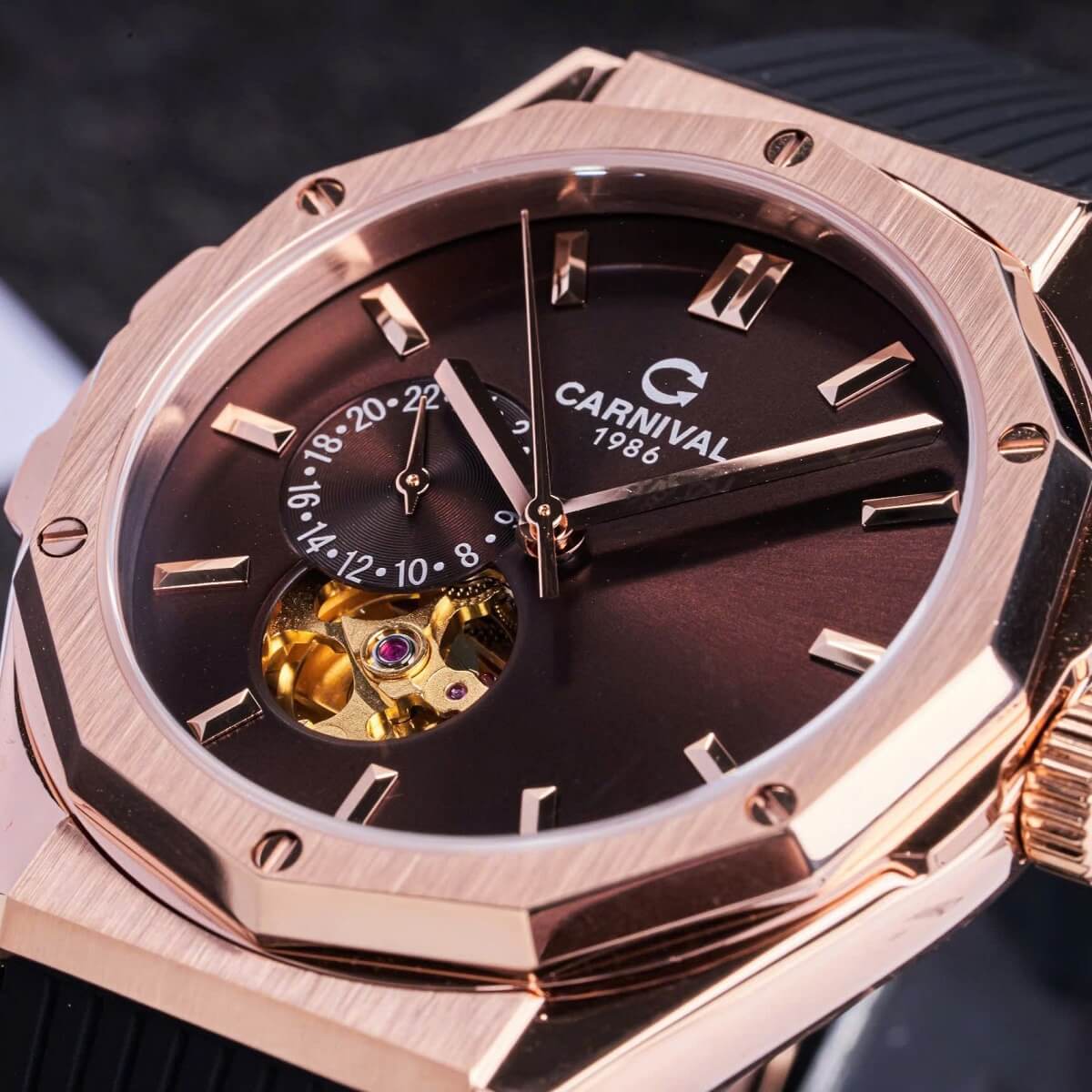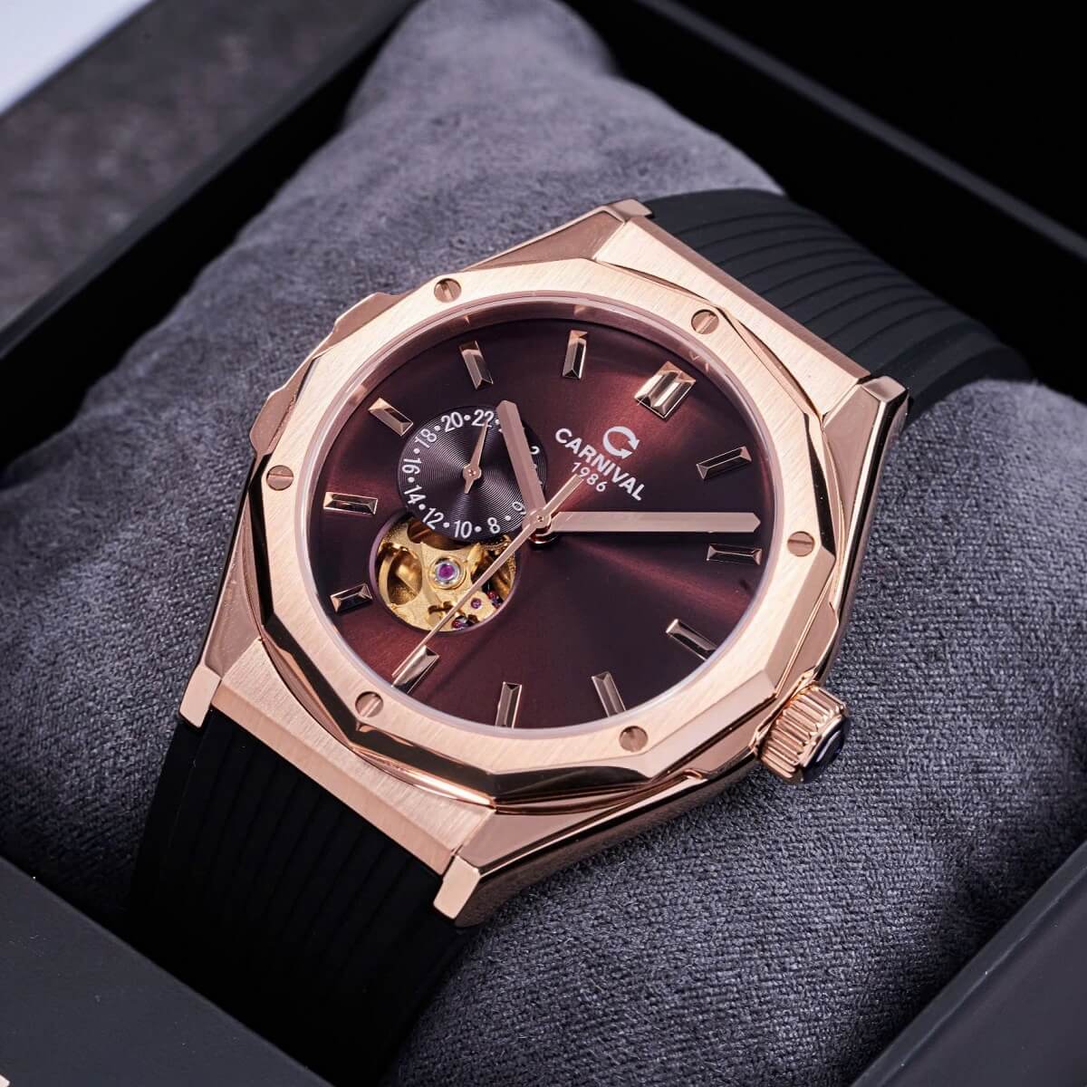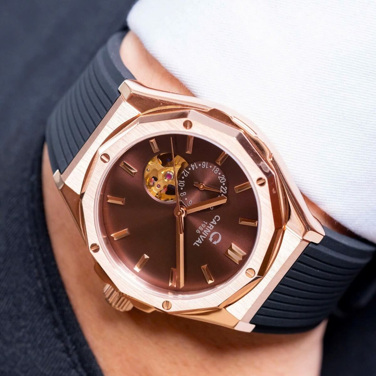 Phong cách thể thao – lịch lãm: Carnival 8189G kết hợp mặt nâu hiện đại, dây cao su đen năng động cùng vỏ vàng hồng sang trọng, phù hợp với nhiều phong cách thời trang khác nhau.