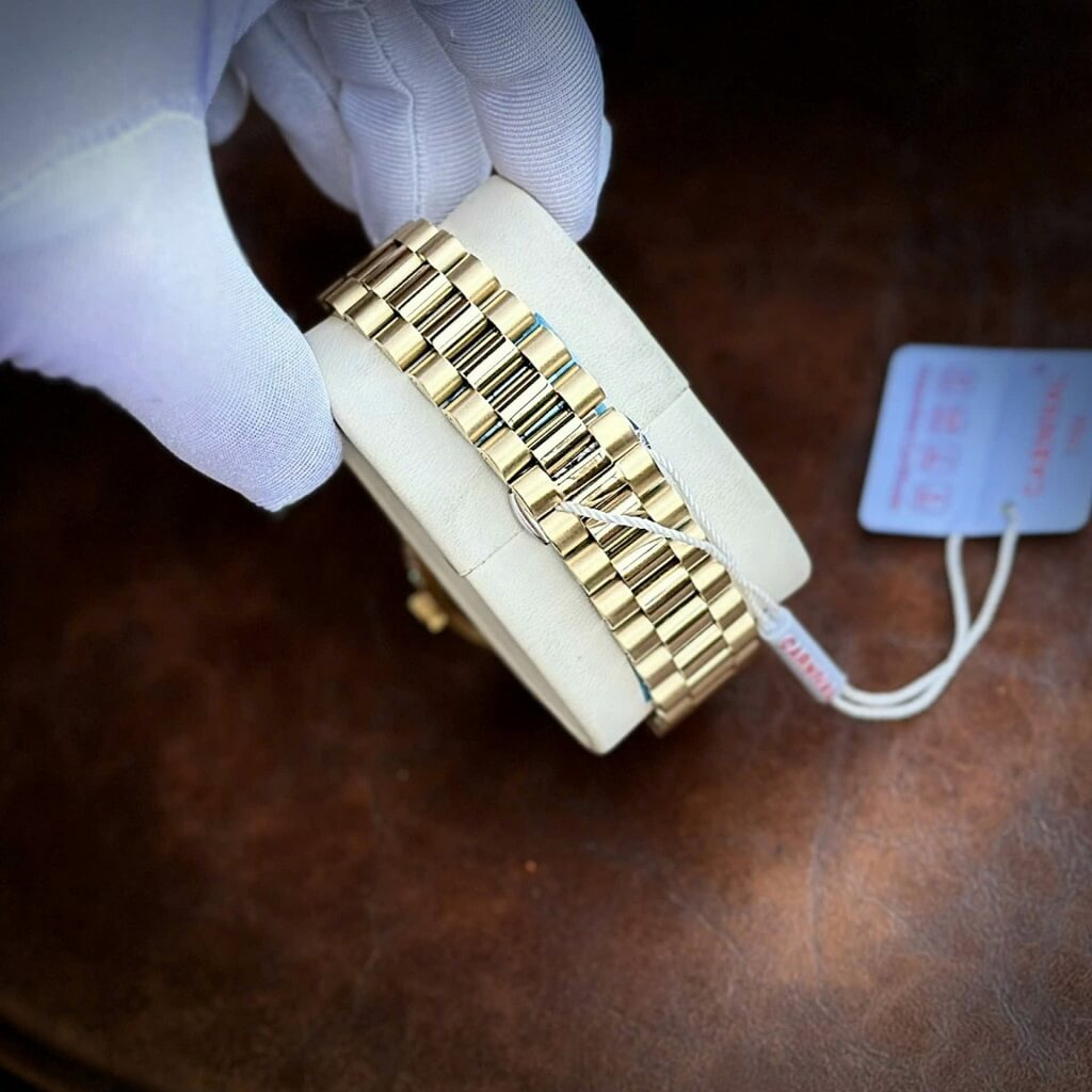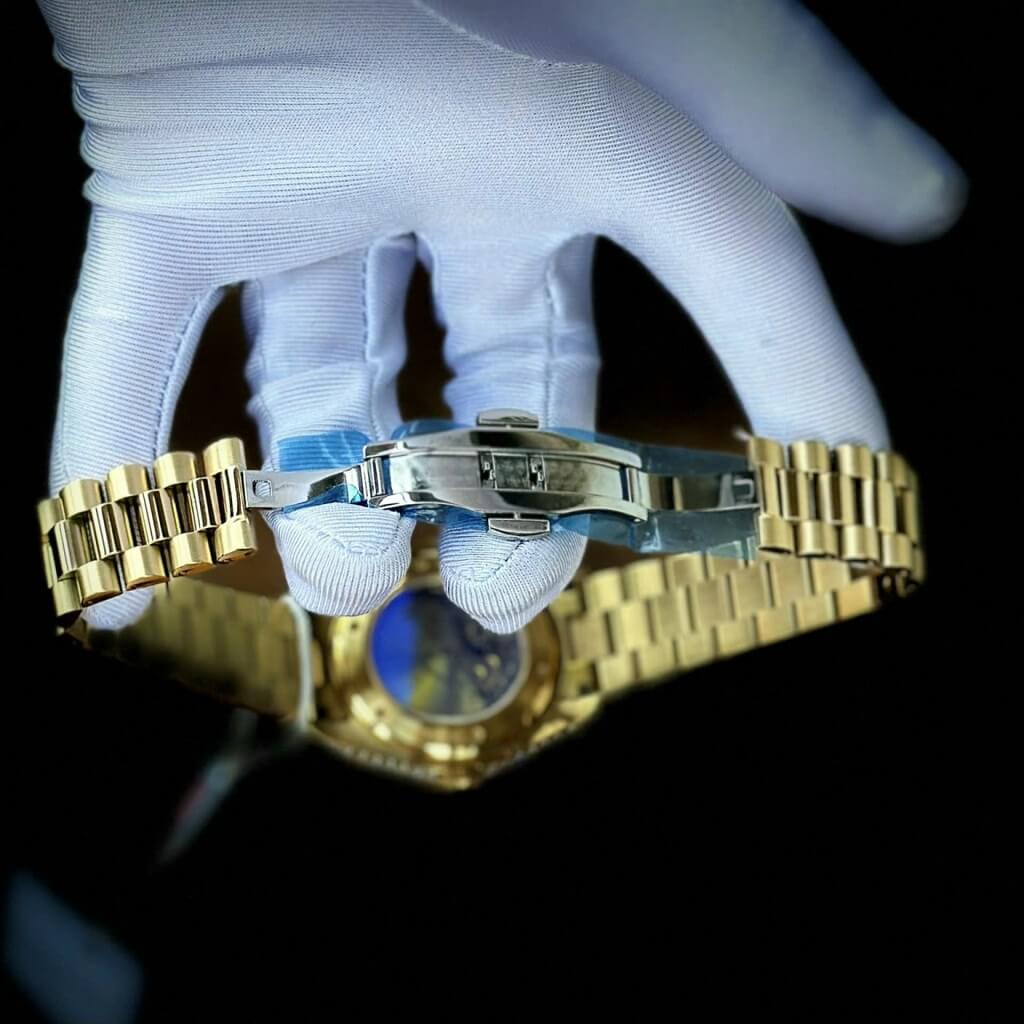 Sở hữu vẻ sang trọng và lịch lãm của chiếc đồng hồ Rolex Date Just huyền thoại. Tông màu full gold, viền đính đá cực kì nổi bật