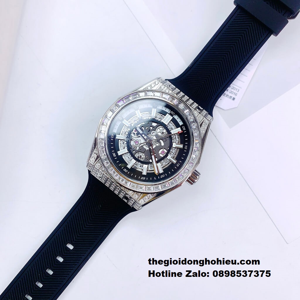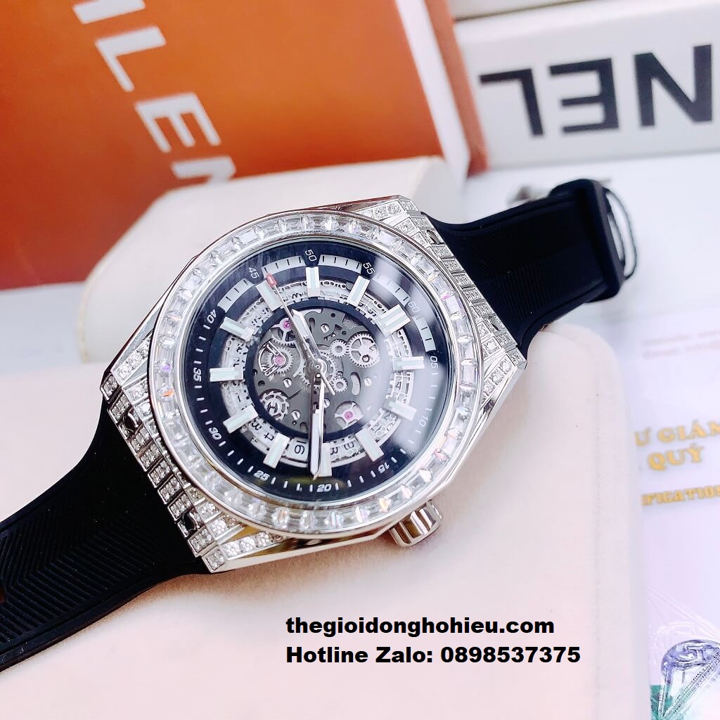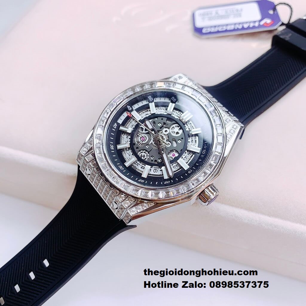 Hình Ảnh Đồng Hồ Nam Hanboro 9009 Đính Đá Máy Tự Động Dây Cao Su Đen 42mm