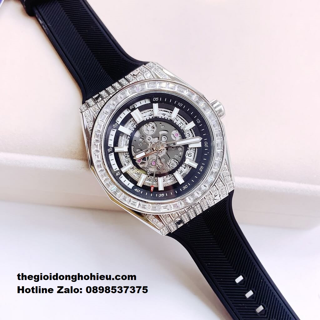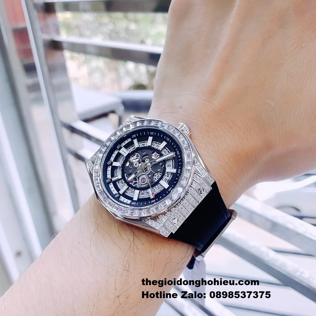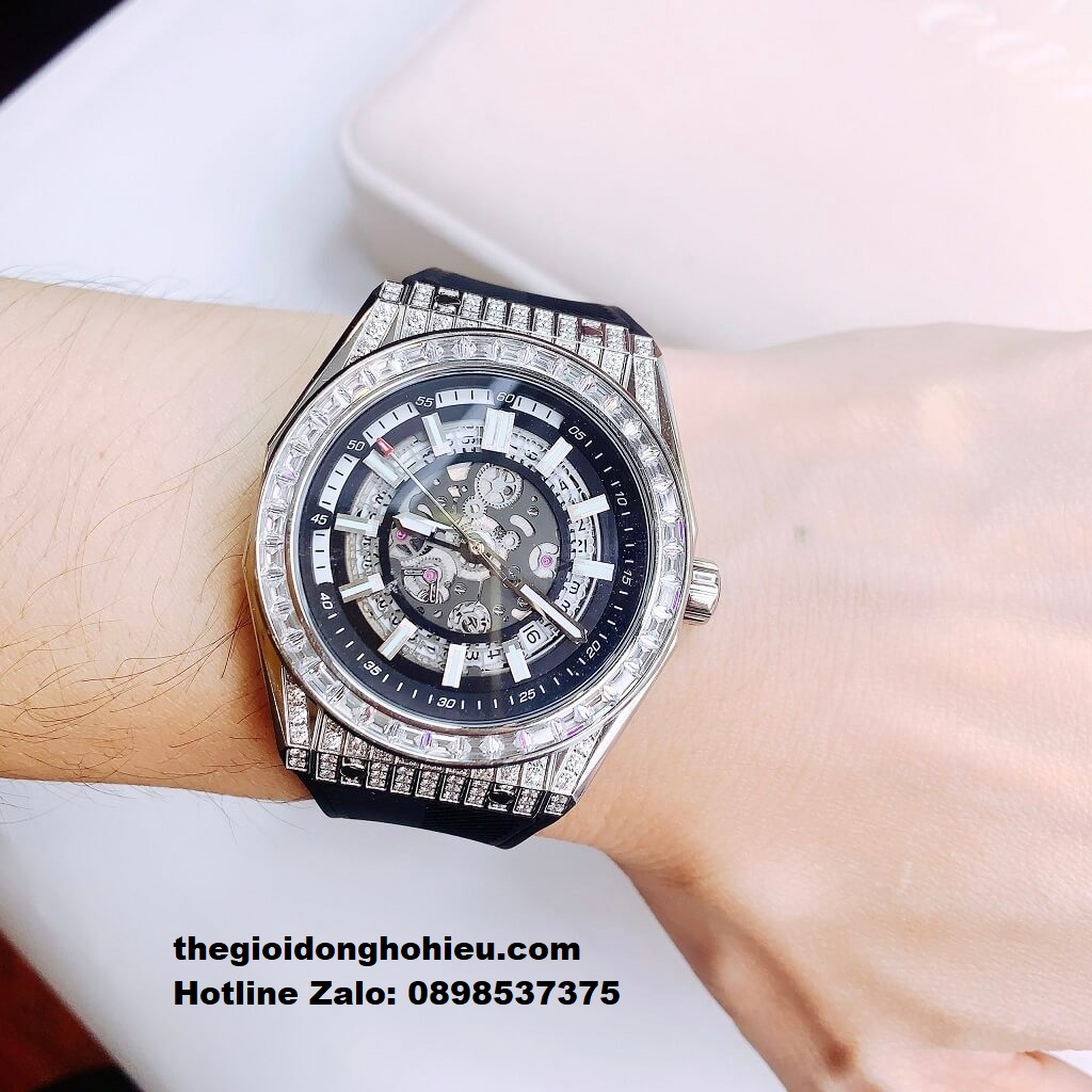 Hình Ảnh Đồng Hồ Nam Hanboro 9009 Đính Đá Máy Tự Động Dây Cao Su Đen 42mm