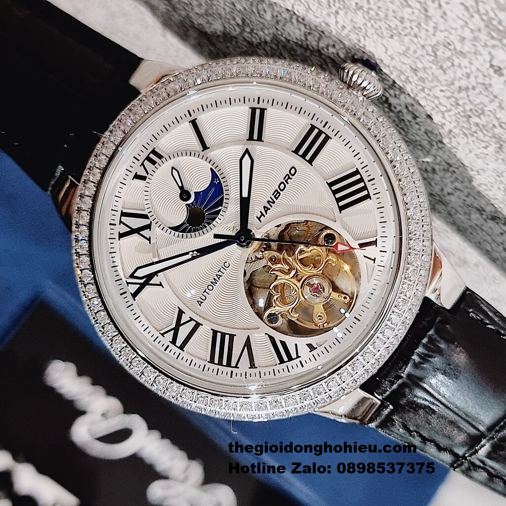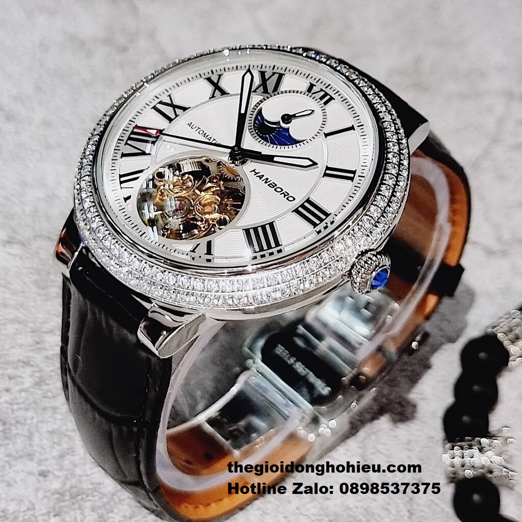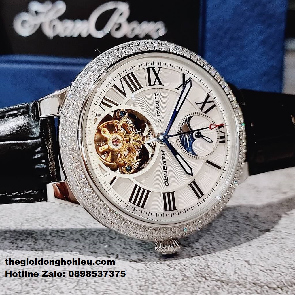 - Hanboro Automatic mang hơi hướng của Cartier sang trọng và đẳng cấp. Thiết kế cá tính và đầy phong cách với mặt đồng hồ sắc nét , kết hợp dây da trẻ trung và năng động, viền đá sang trọng