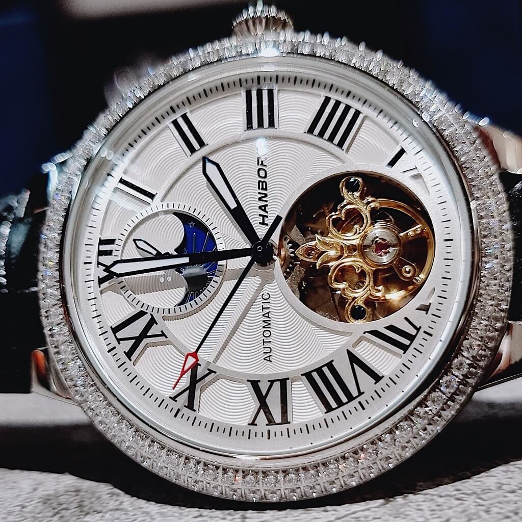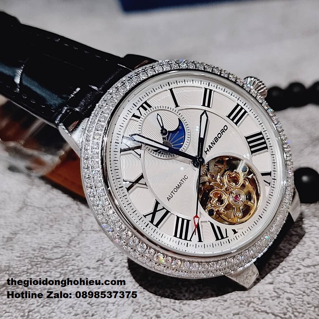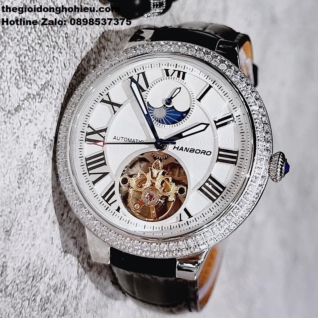 - Hanboro Automatic mang hơi hướng của Cartier sang trọng và đẳng cấp. Thiết kế cá tính và đầy phong cách với mặt đồng hồ sắc nét , kết hợp dây da trẻ trung và năng động, viền đá sang trọng