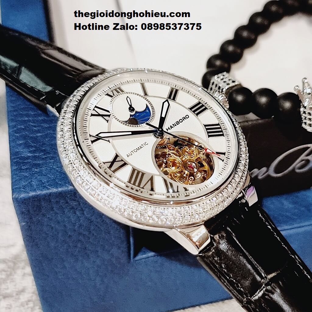 Thông số Đồng Hồ Nam Hanboro Automatic Moonphase Dây Da Đen Vỏ Silver 44mm Chính Hãng