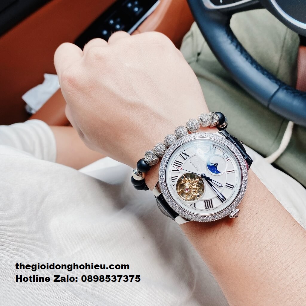 - Dây da màu đen hợp với mặt đồng hồ moonphase siêu đẹp. Kính cứng cong chống va đập và trầy xướt