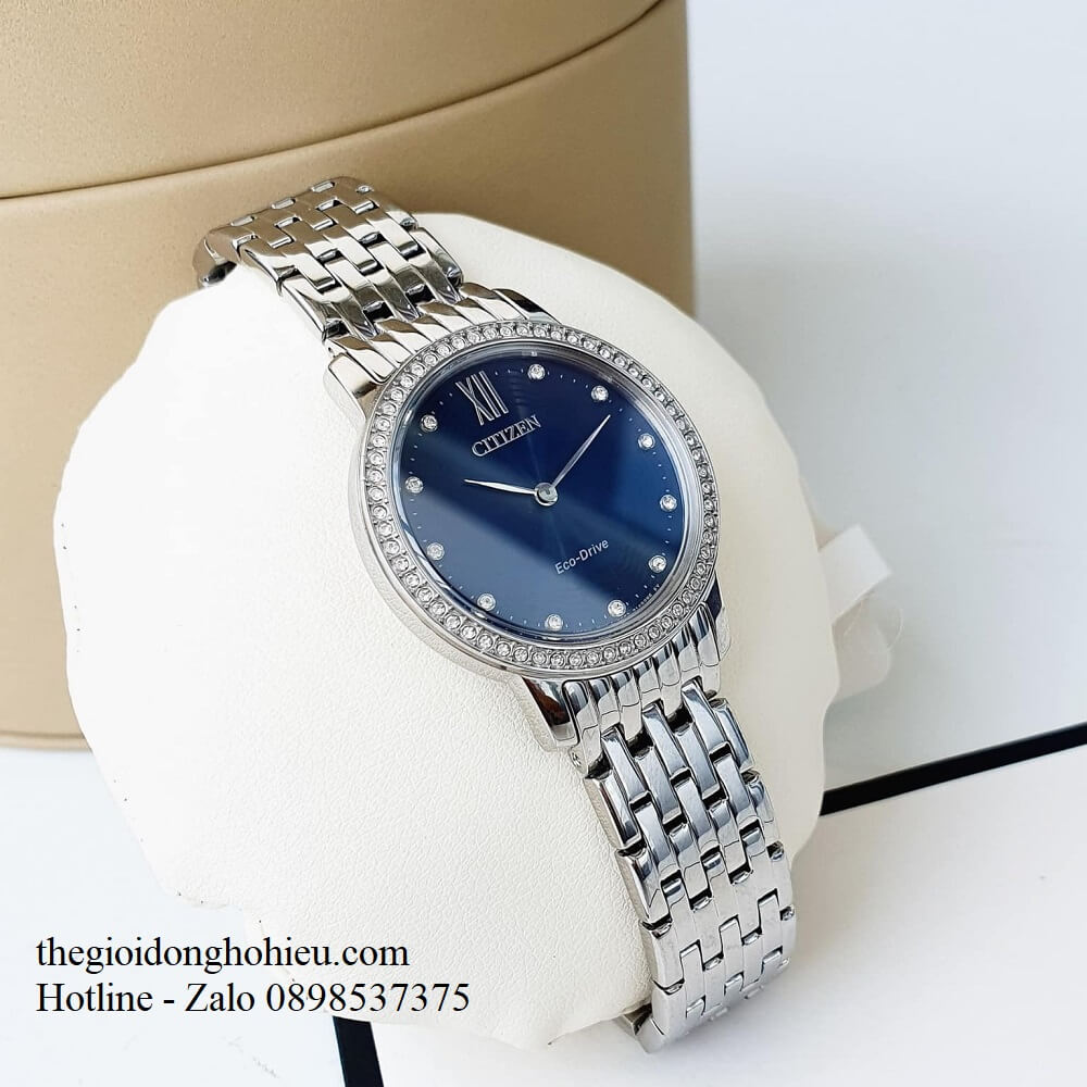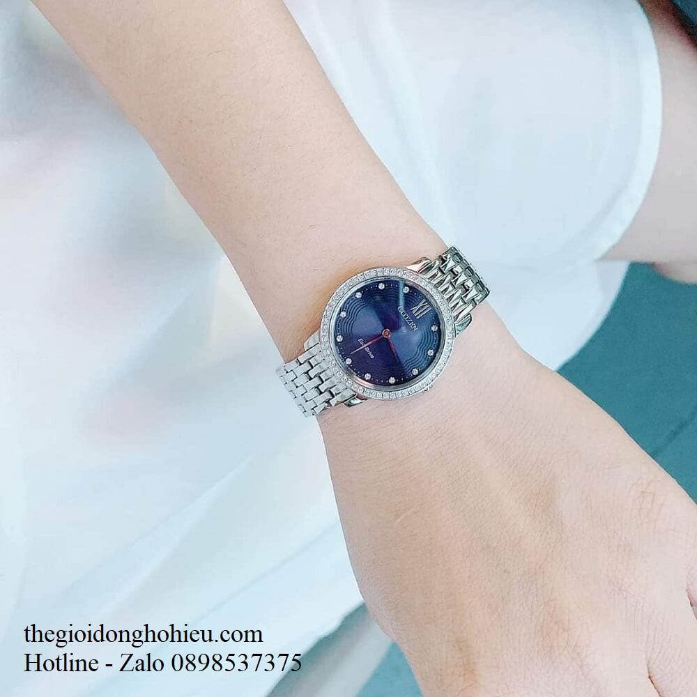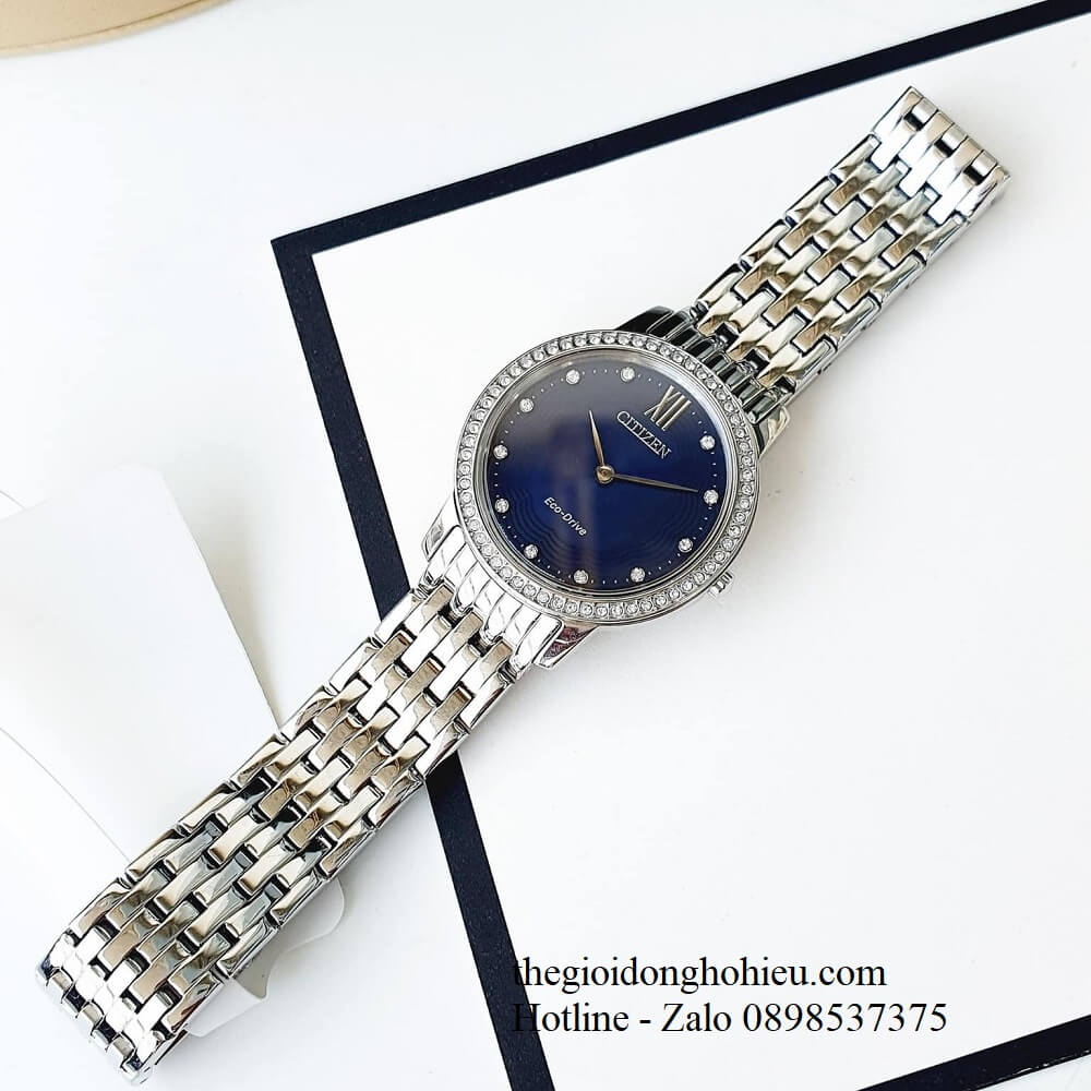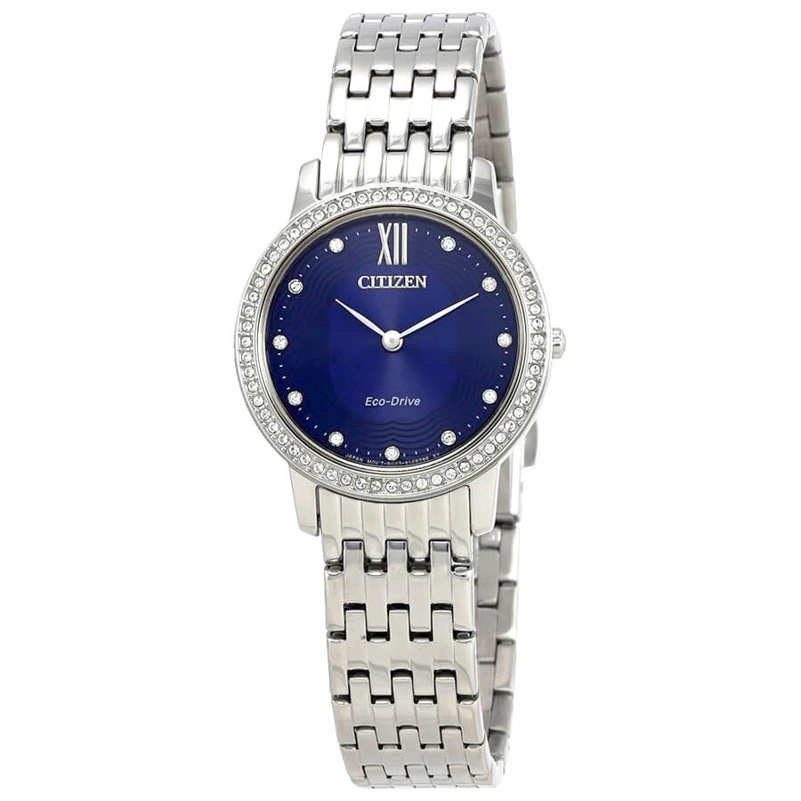 Citizen Eco-drive EX1480-58L - Mặt màu xanh hoàng gia tạo nên một sự tương phản mạnh mẽ với các tinh thể pha lê swarovski chính hãng lấp lánh được sử dụng làm cọc số và cả ở viền đồng hồ.