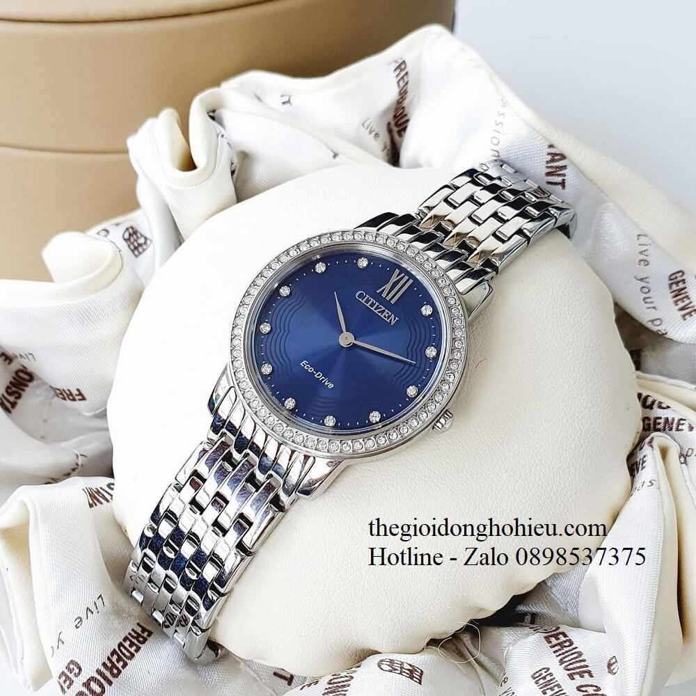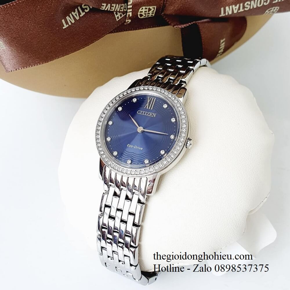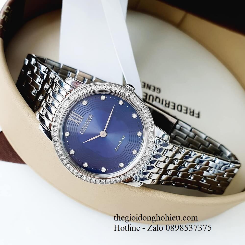 Citizen Eco-drive EX1480-58L - Mặt màu xanh hoàng gia tạo nên một sự tương phản mạnh mẽ với các tinh thể pha lê swarovski chính hãng lấp lánh được sử dụng làm cọc số và cả ở viền đồng hồ.