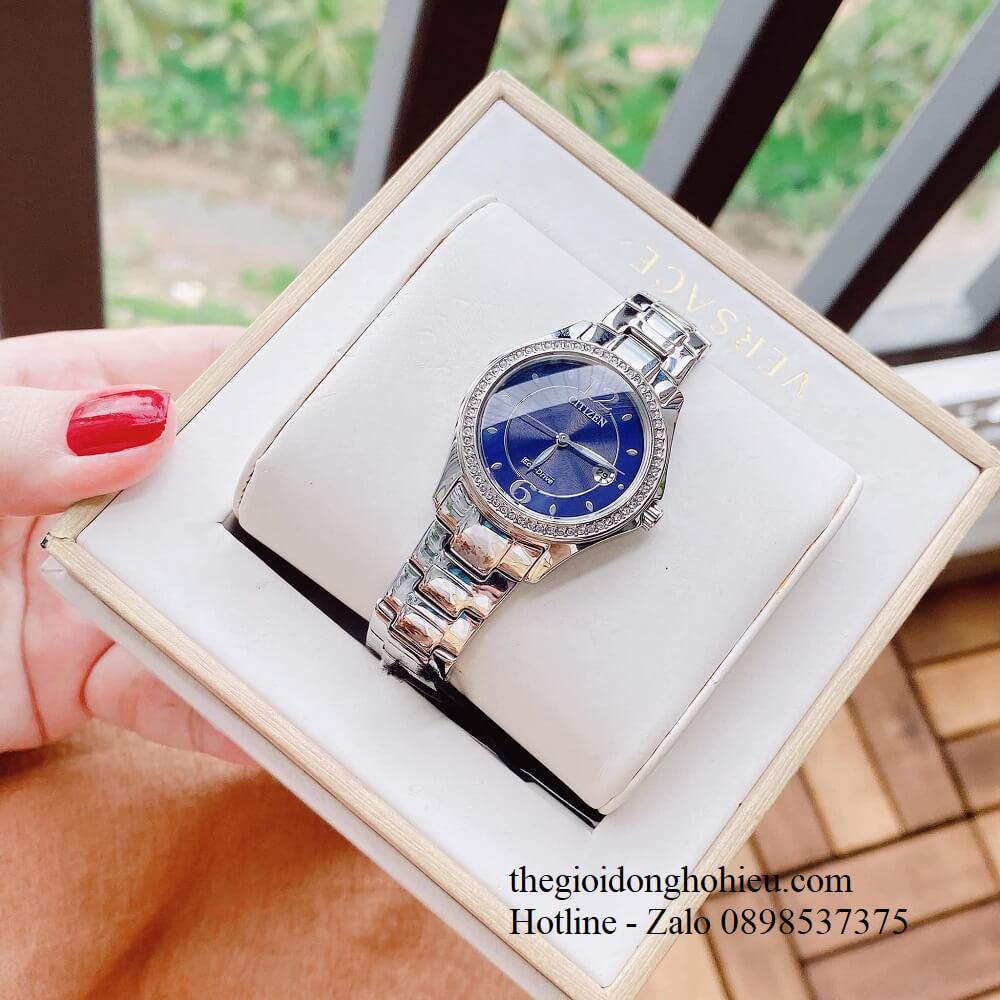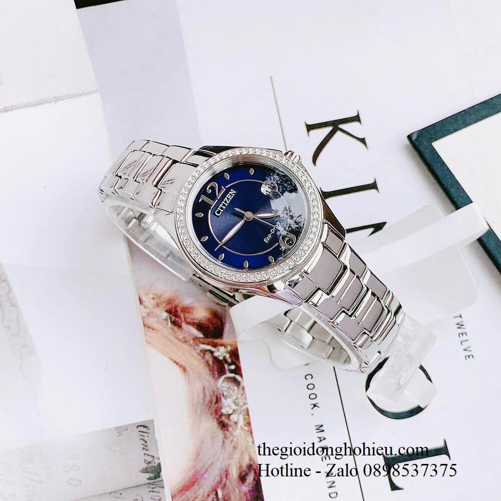 Citizen FE1140-86L sang chảnh với dây silver sáng bóng, dial xanh quyến rũ, nổi bần bật với viền đá Swarovski xung quanh mặt