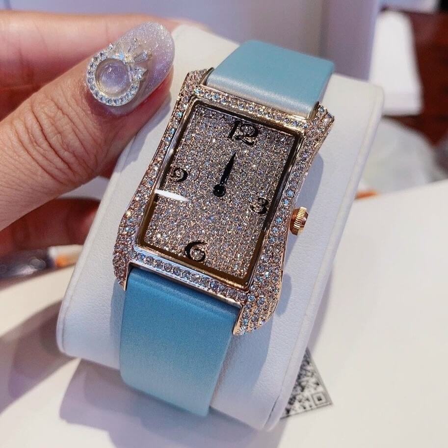 - Mặt full đá sáng lấp lánh kết hợp với quai dây lụa satin mềm mại.