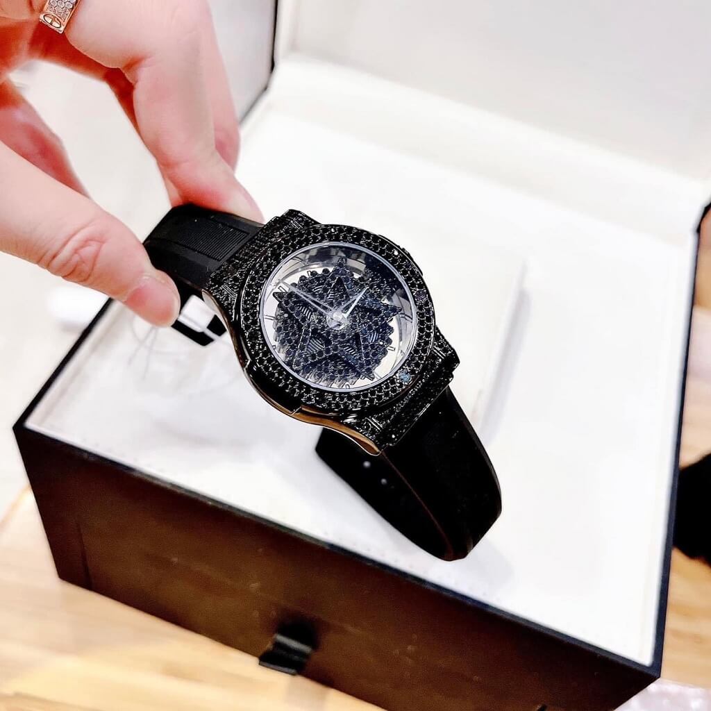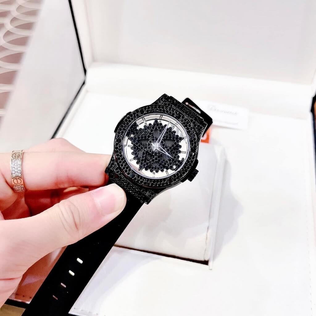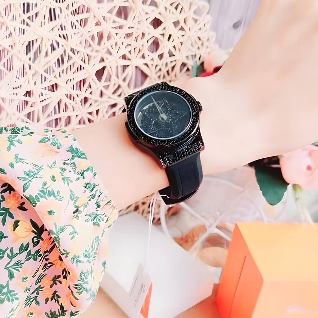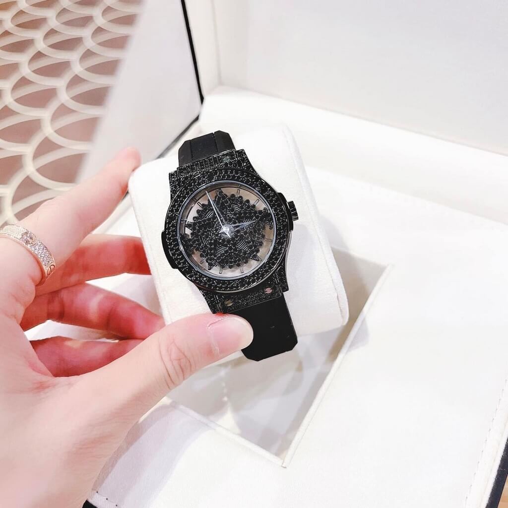 Thiết kế tinh xảo, sử dụng ngôi sao 5 cánh xoay theo chuyển động tay tạo điểm nhấn sinh động và bắt mắt. Mặt đính full đá sáng lấp lánh, dây cao su đen mềm mại ôm tay