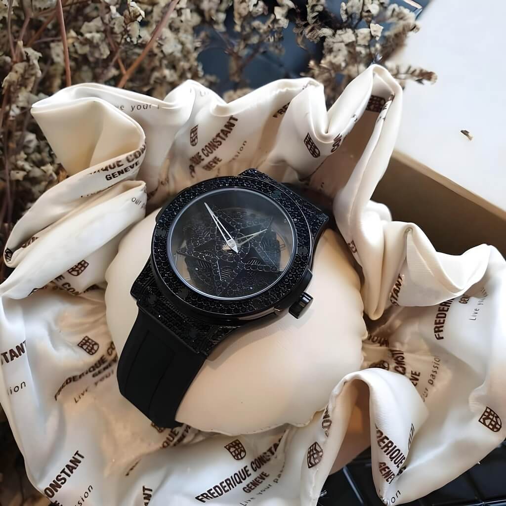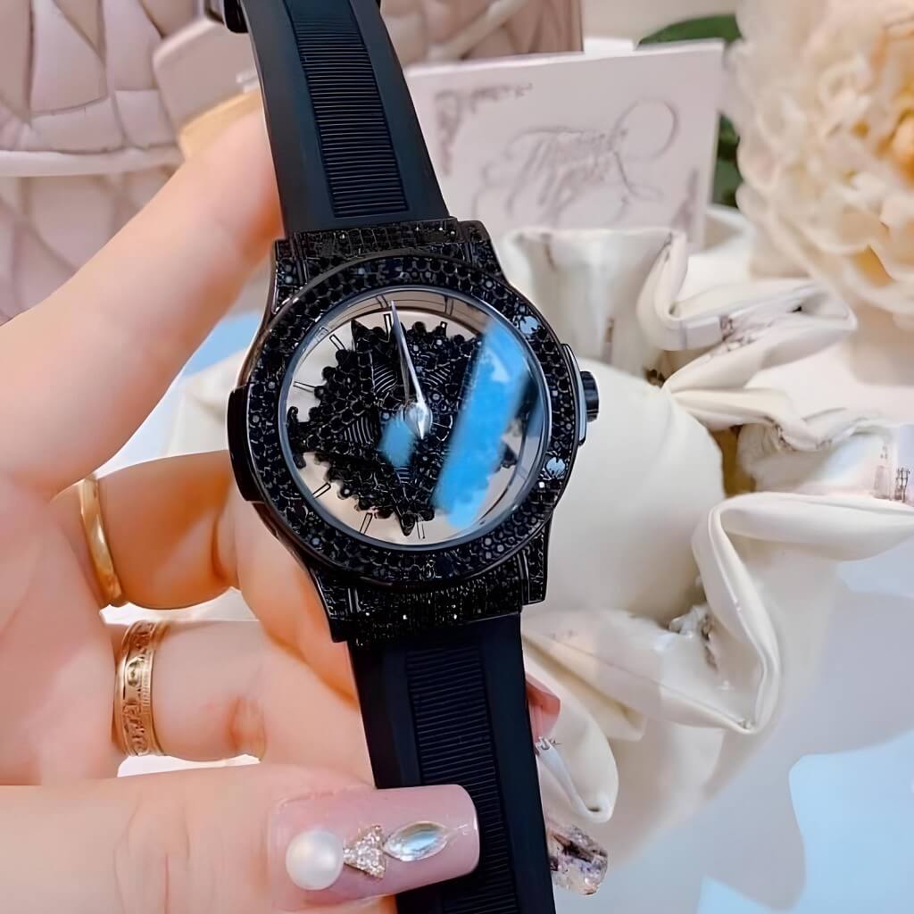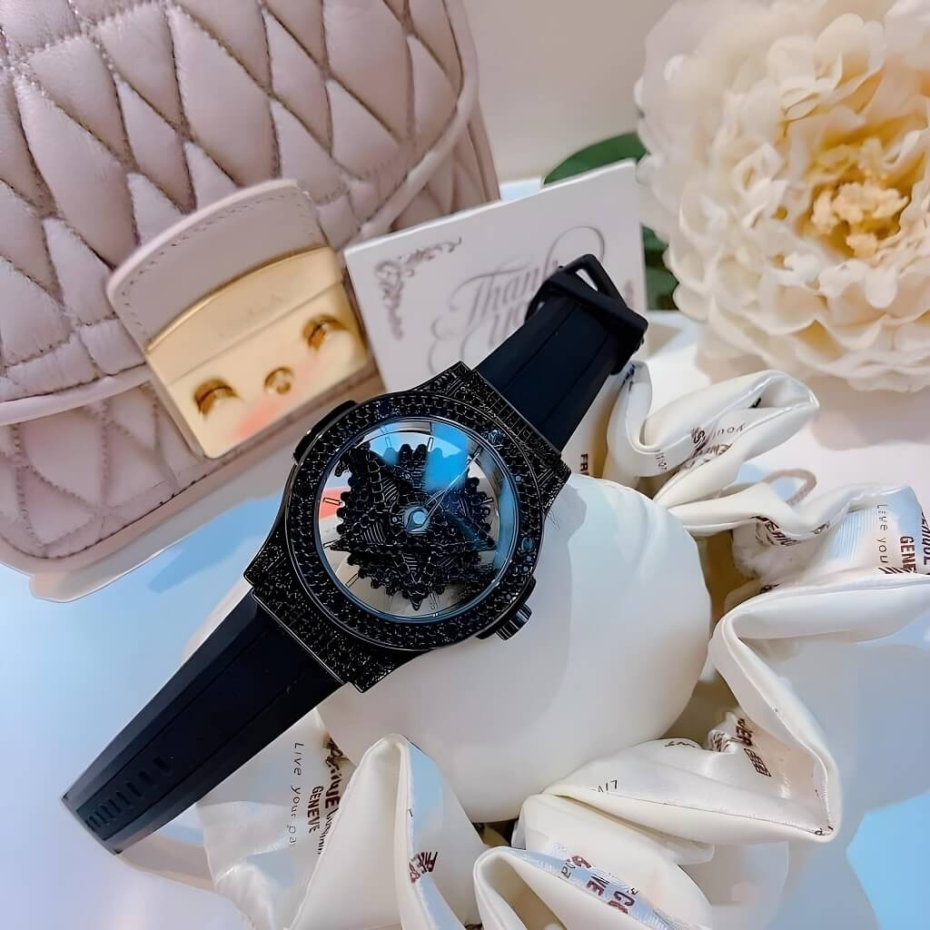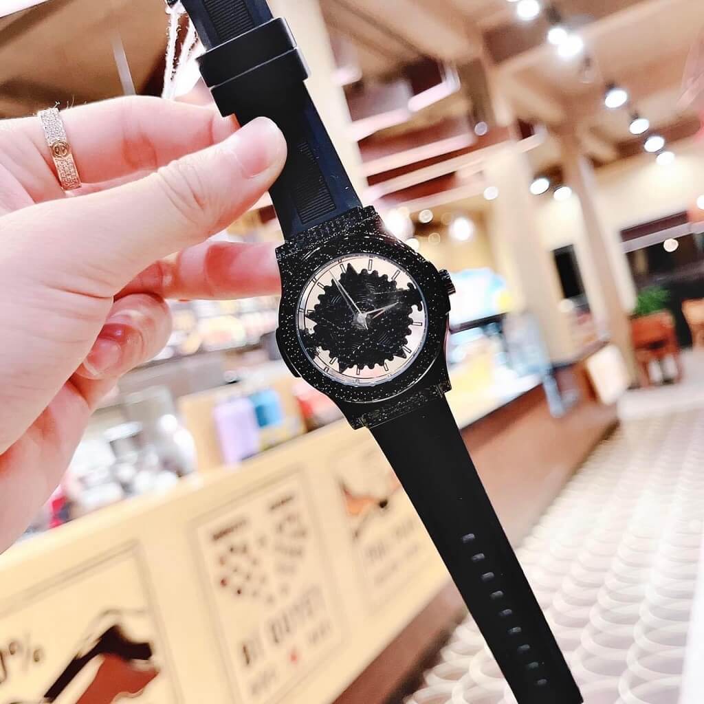 Thiết kế tinh xảo, sử dụng ngôi sao 5 cánh xoay theo chuyển động tay tạo điểm nhấn sinh động và bắt mắt. Mặt đính full đá sáng lấp lánh, dây cao su đen mềm mại ôm tay