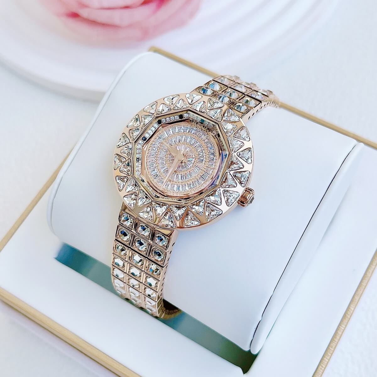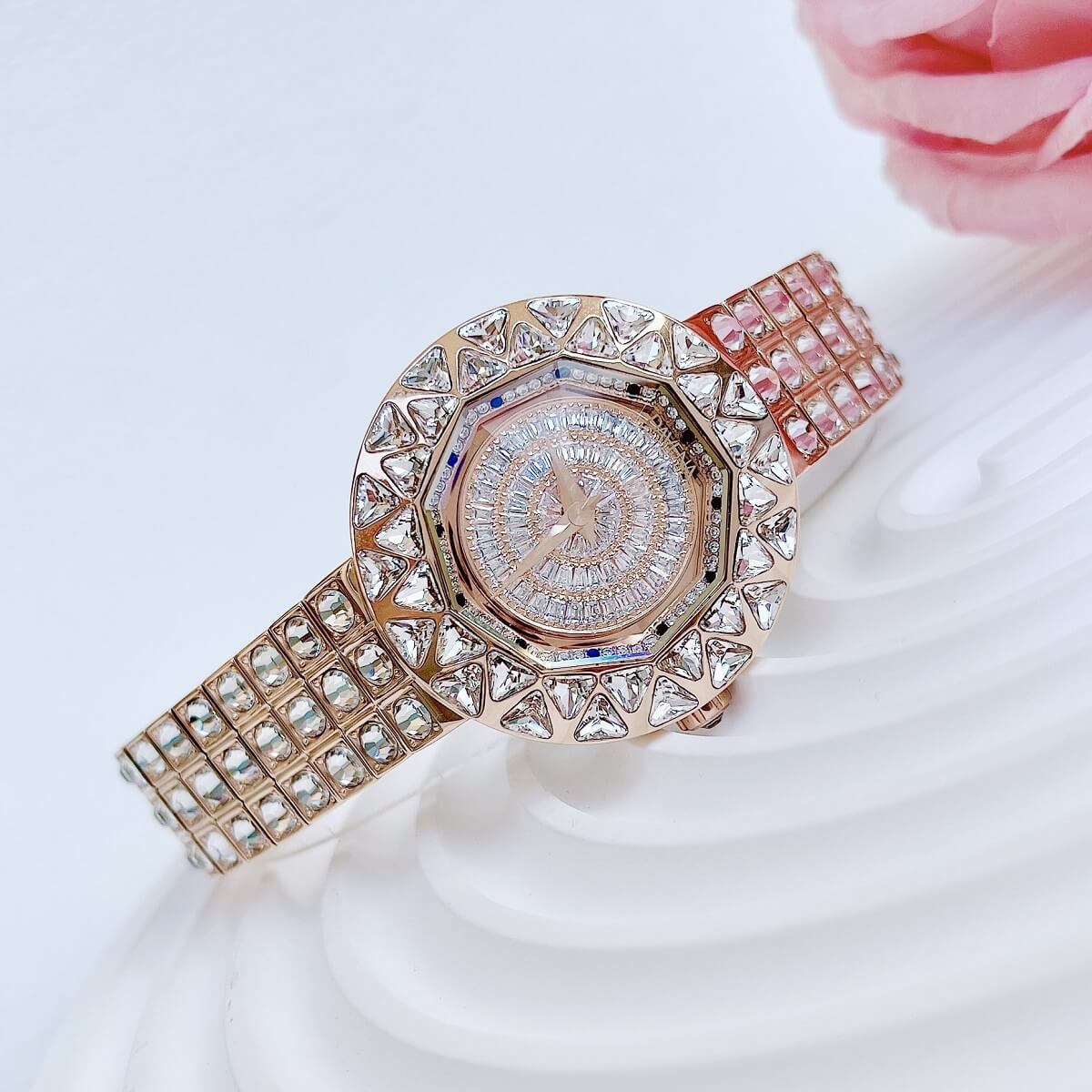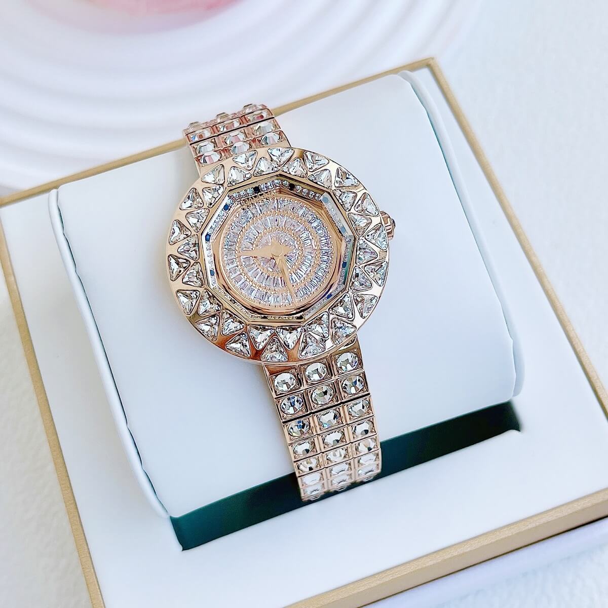 Thiết kế mặt tròn full đá cắt vát cực kỳ sang trọng, lấy chính bản thân người đeo làm tâm điểm. Điểm nhấn máy mặt xoay ở phần trung tâm rất đẹp mắt chỉ cần cử động tay bề mặt chuyển động đẹp mắt
