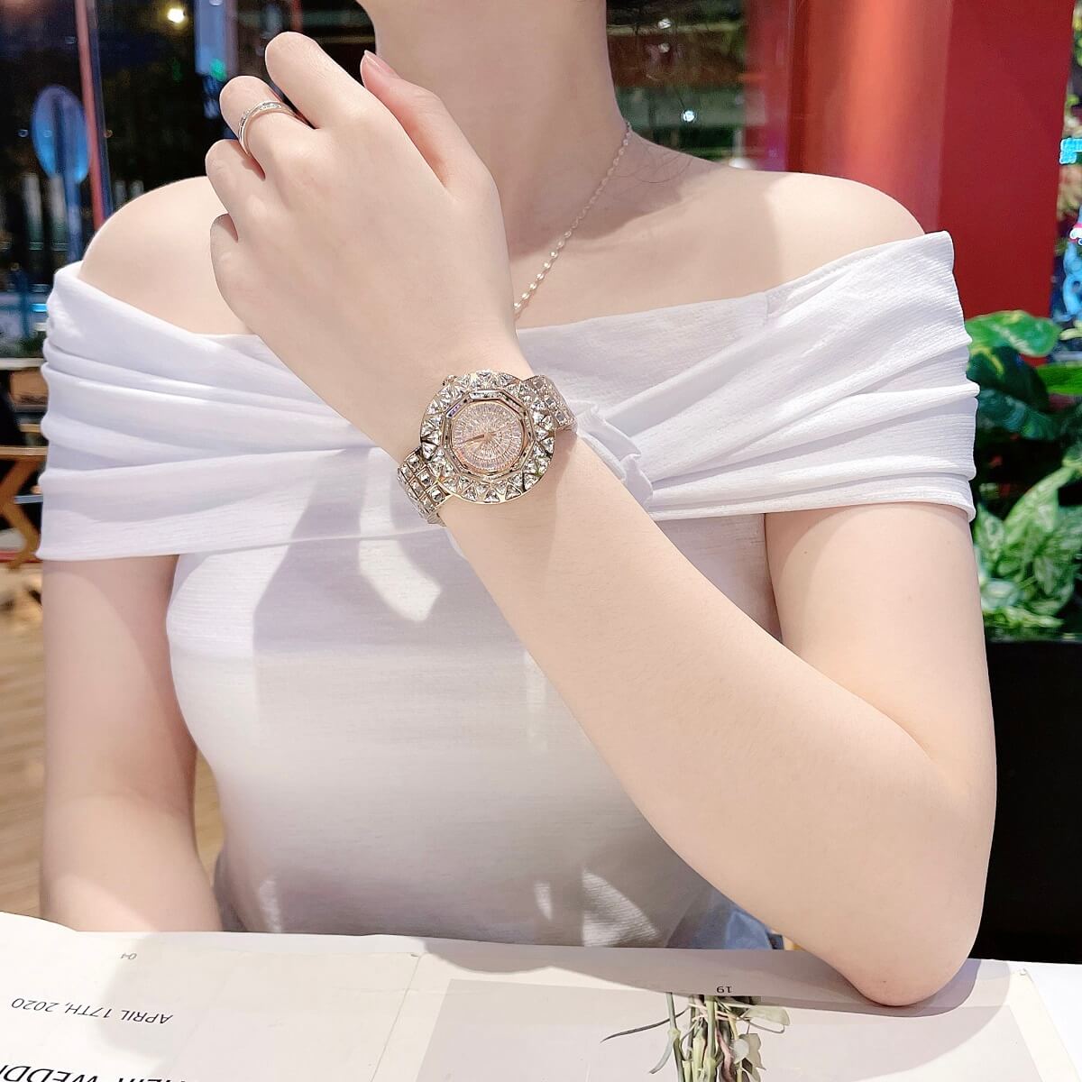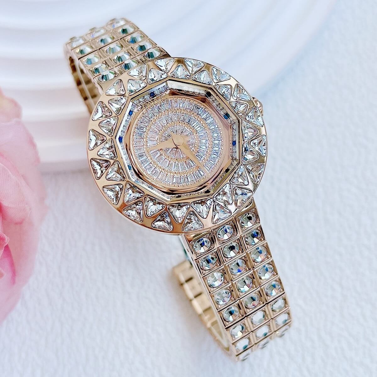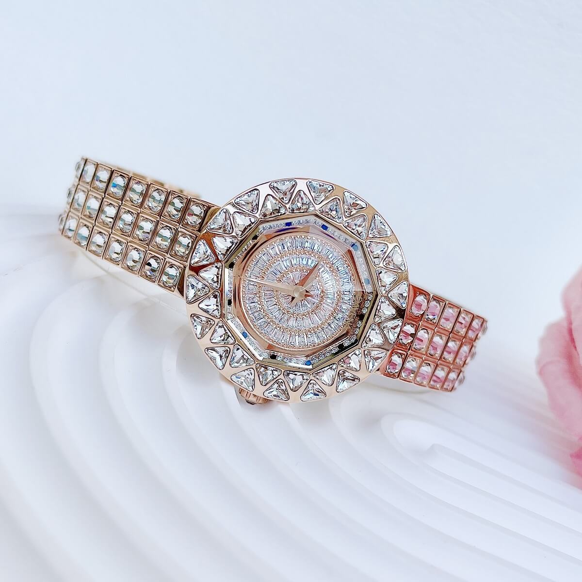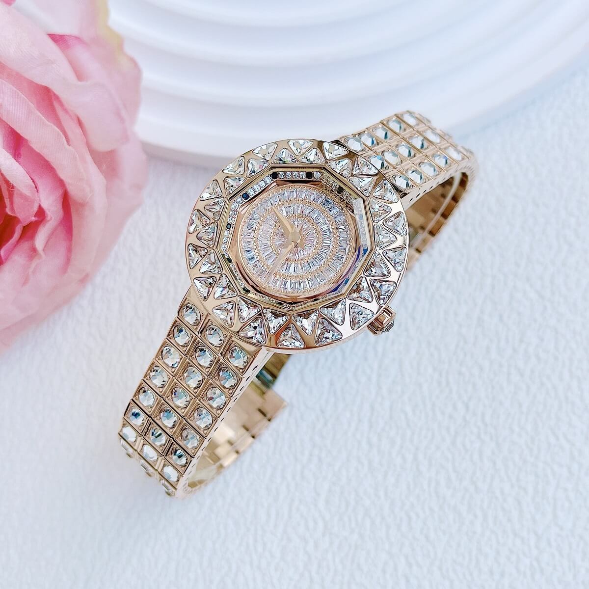 Thiết kế mặt tròn full đá cắt vát cực kỳ sang trọng, lấy chính bản thân người đeo làm tâm điểm. Điểm nhấn máy mặt xoay ở phần trung tâm rất đẹp mắt chỉ cần cử động tay bề mặt chuyển động đẹp mắt