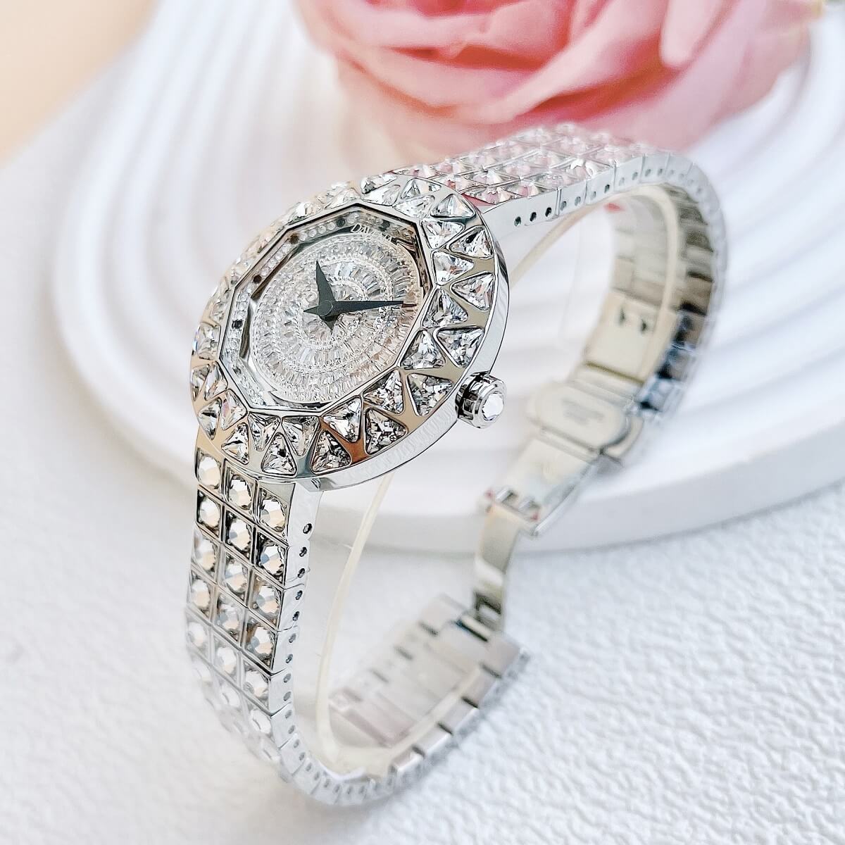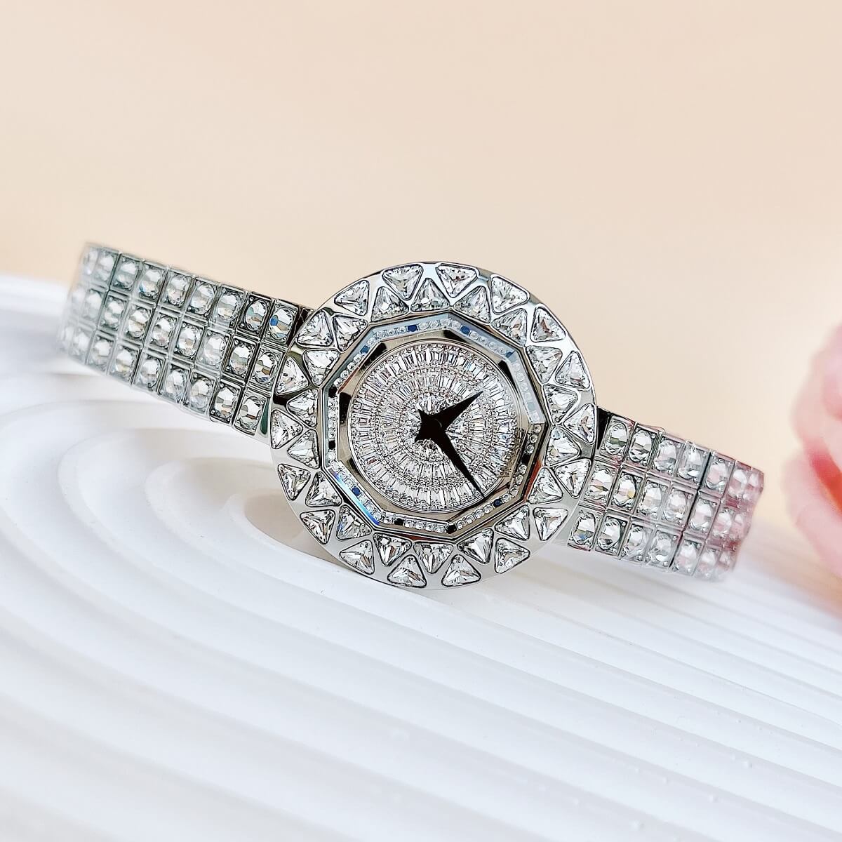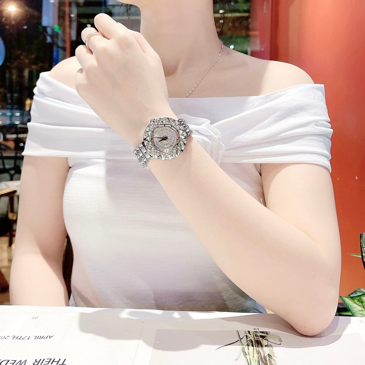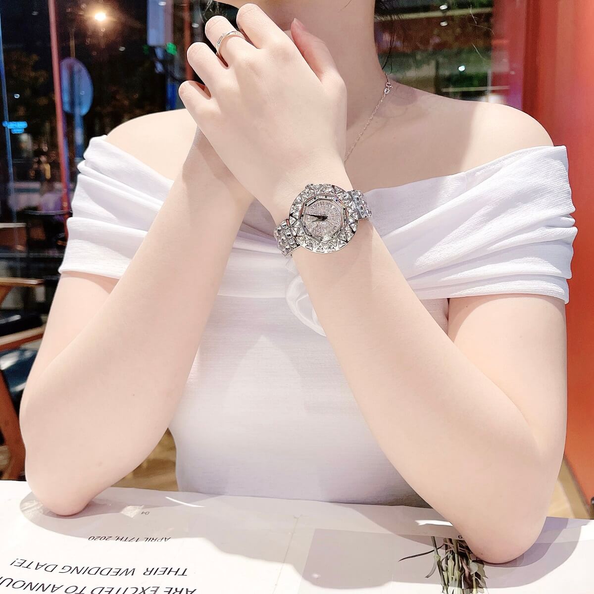 Thiết kế mặt tròn full đá cắt vát cực kỳ sang trọng, lấy chính bản thân người đeo làm tâm điểm. Điểm nhấn máy mặt xoay ở phần trung tâm rất đẹp mắt chỉ cần cử động tay bề mặt chuyển động đẹp mắt