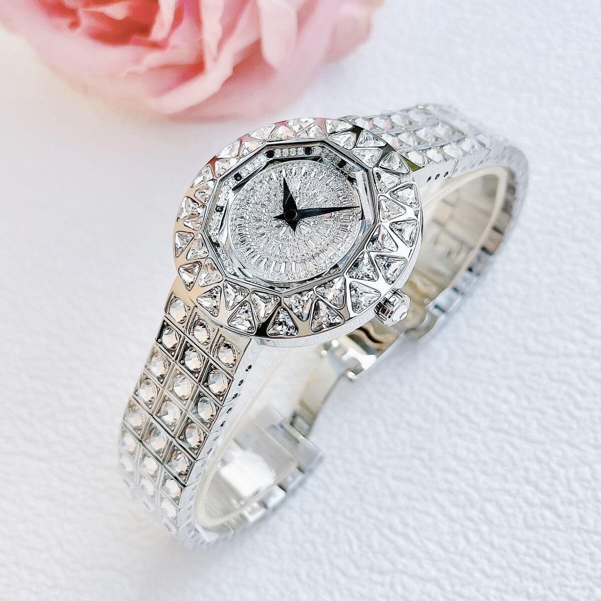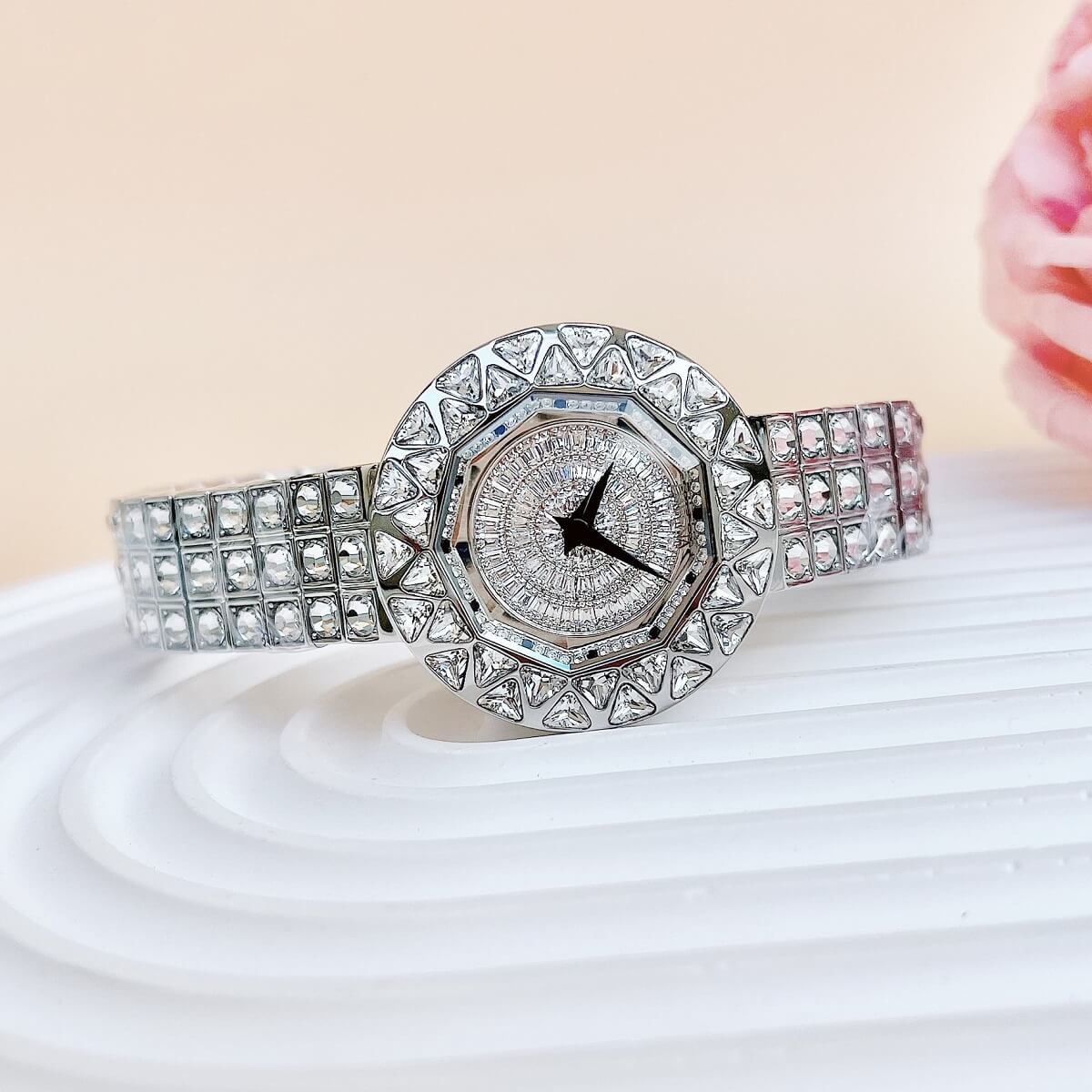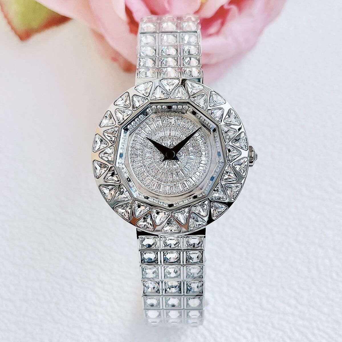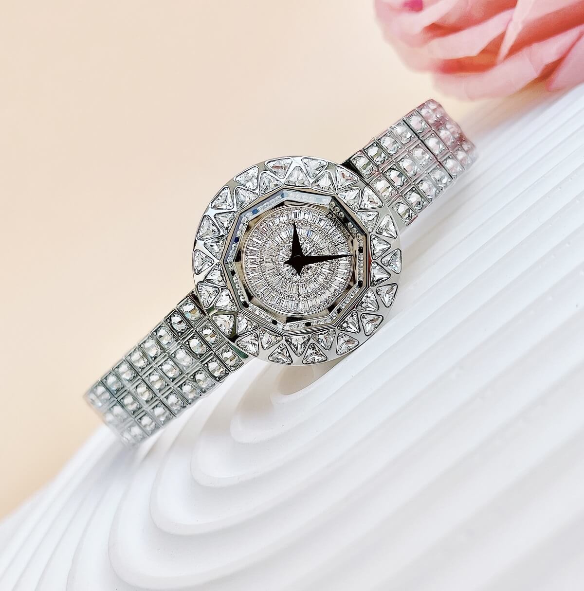 Thiết kế mặt tròn full đá cắt vát cực kỳ sang trọng, lấy chính bản thân người đeo làm tâm điểm. Điểm nhấn máy mặt xoay ở phần trung tâm rất đẹp mắt chỉ cần cử động tay bề mặt chuyển động đẹp mắt