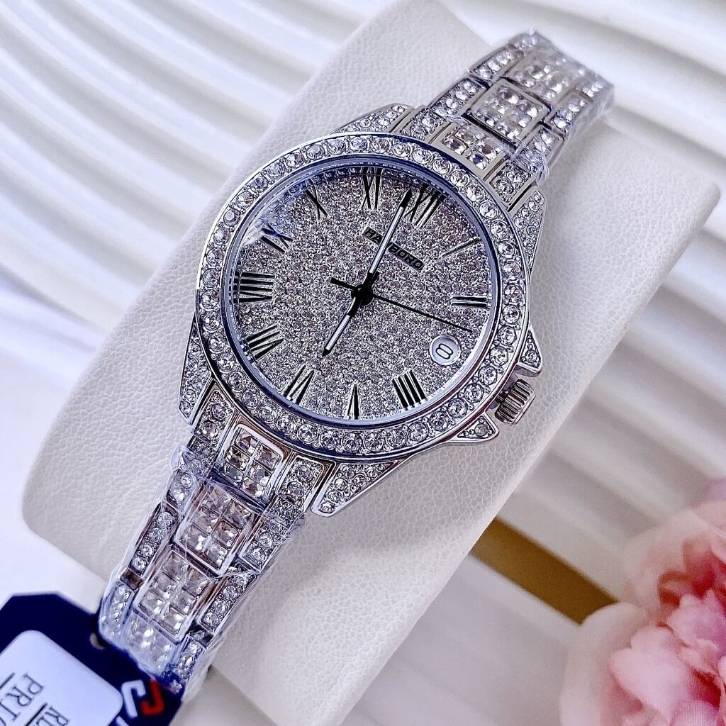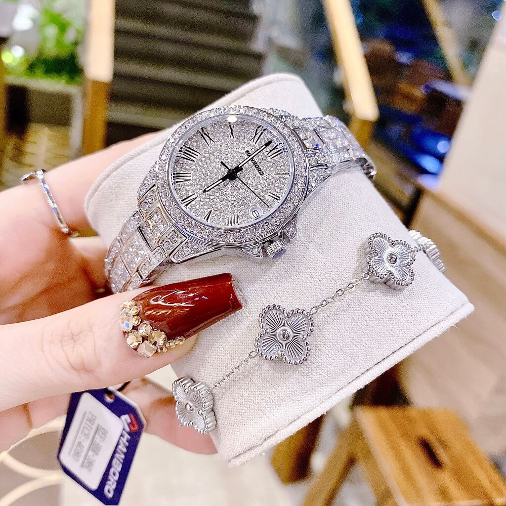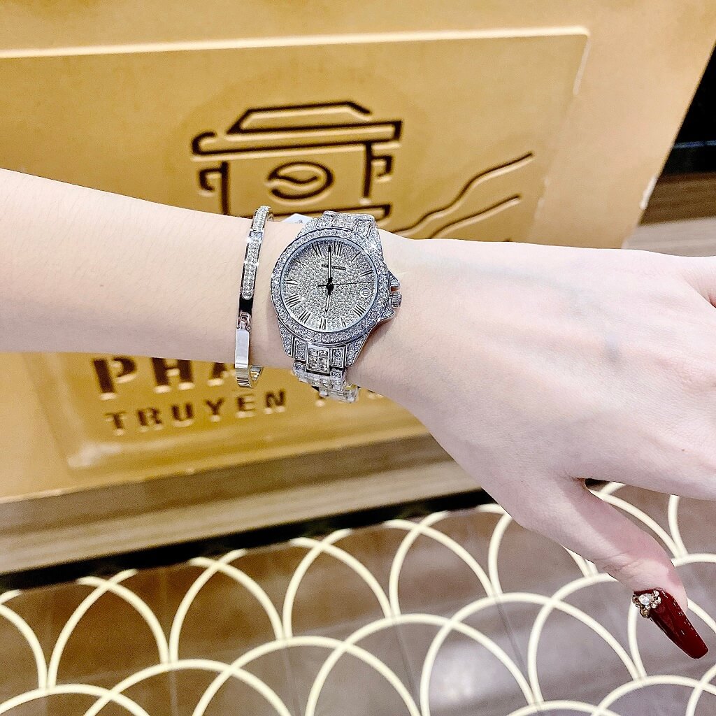 Toàn bộ mặt đồng hồ được đính đá swarovski nổi bật và cá tính