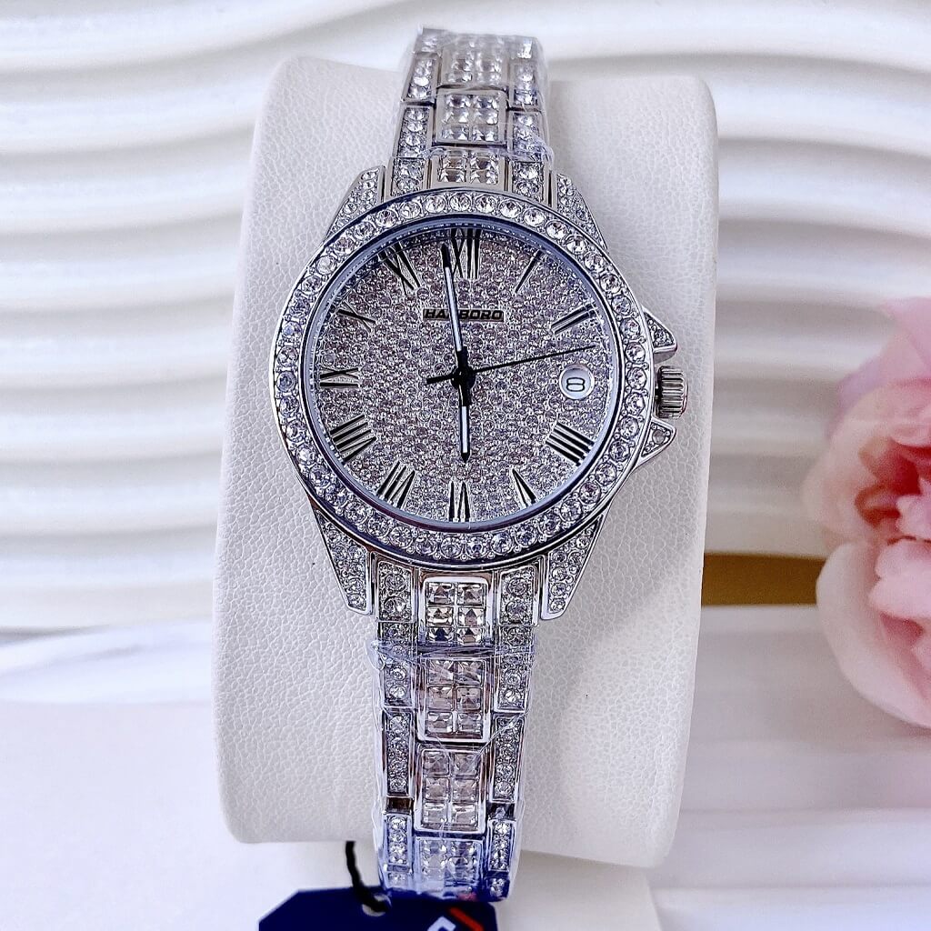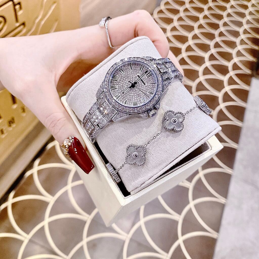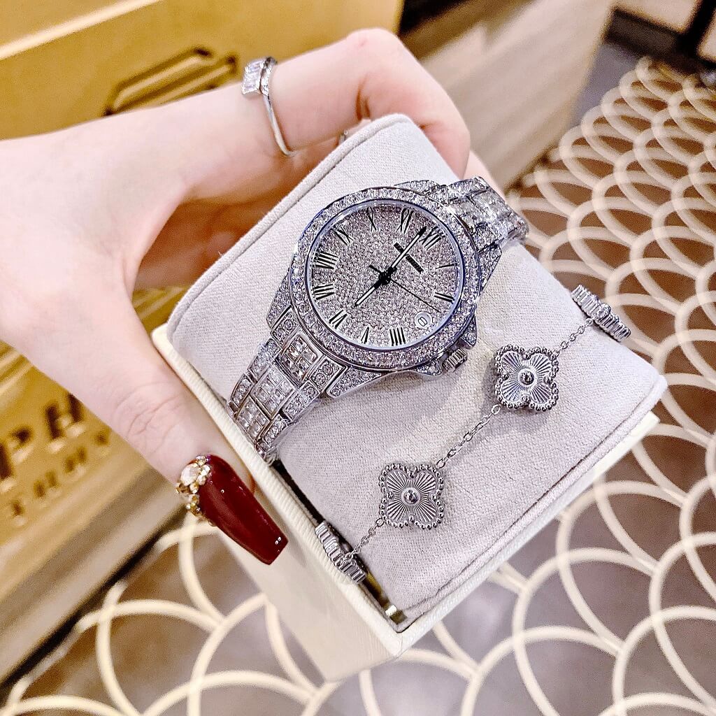 Toàn bộ mặt đồng hồ được đính đá swarovski nổi bật và cá tính