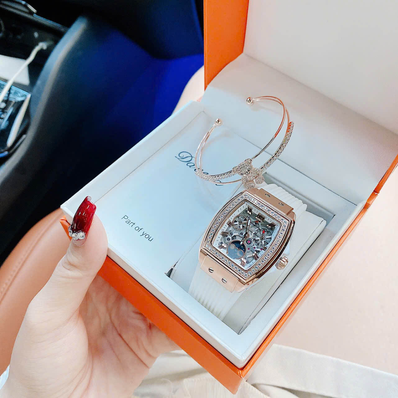 THÔNG TIN SẢN PHẨM: Đồng Hồ Nữ Hanboro Mặt Ovan Đính Đá Dây Cao Su Trắng Vỏ Kim Loại Vàng Hồng Size 36mm