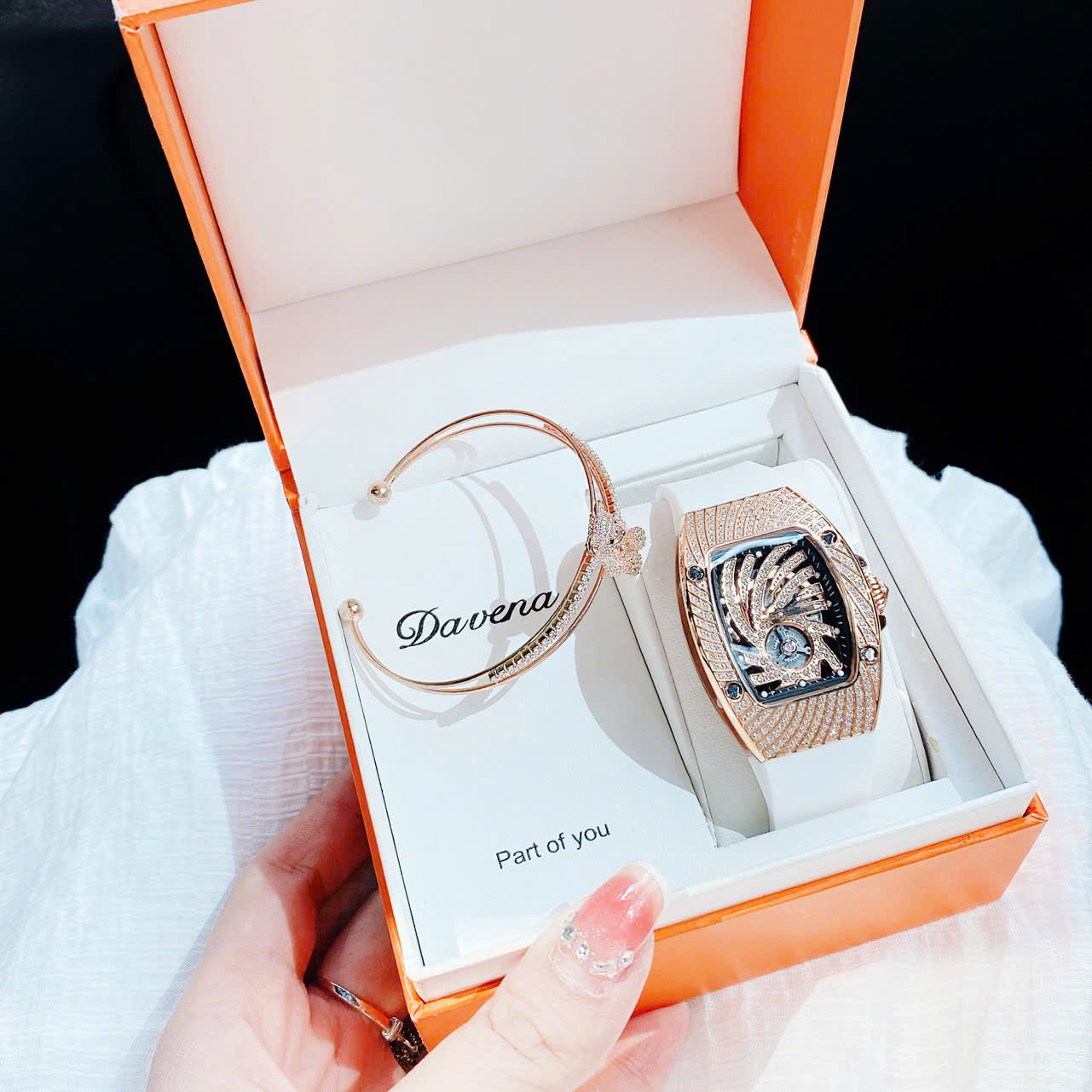 THÔNG TIN SẢN PHẨM: Đồng Hồ Nữ Hanboro Mặt Ovan Xoáy Kim Loại Vàng Hồng Đính Full Đá Dây Cao Su Trắng Size 36mm