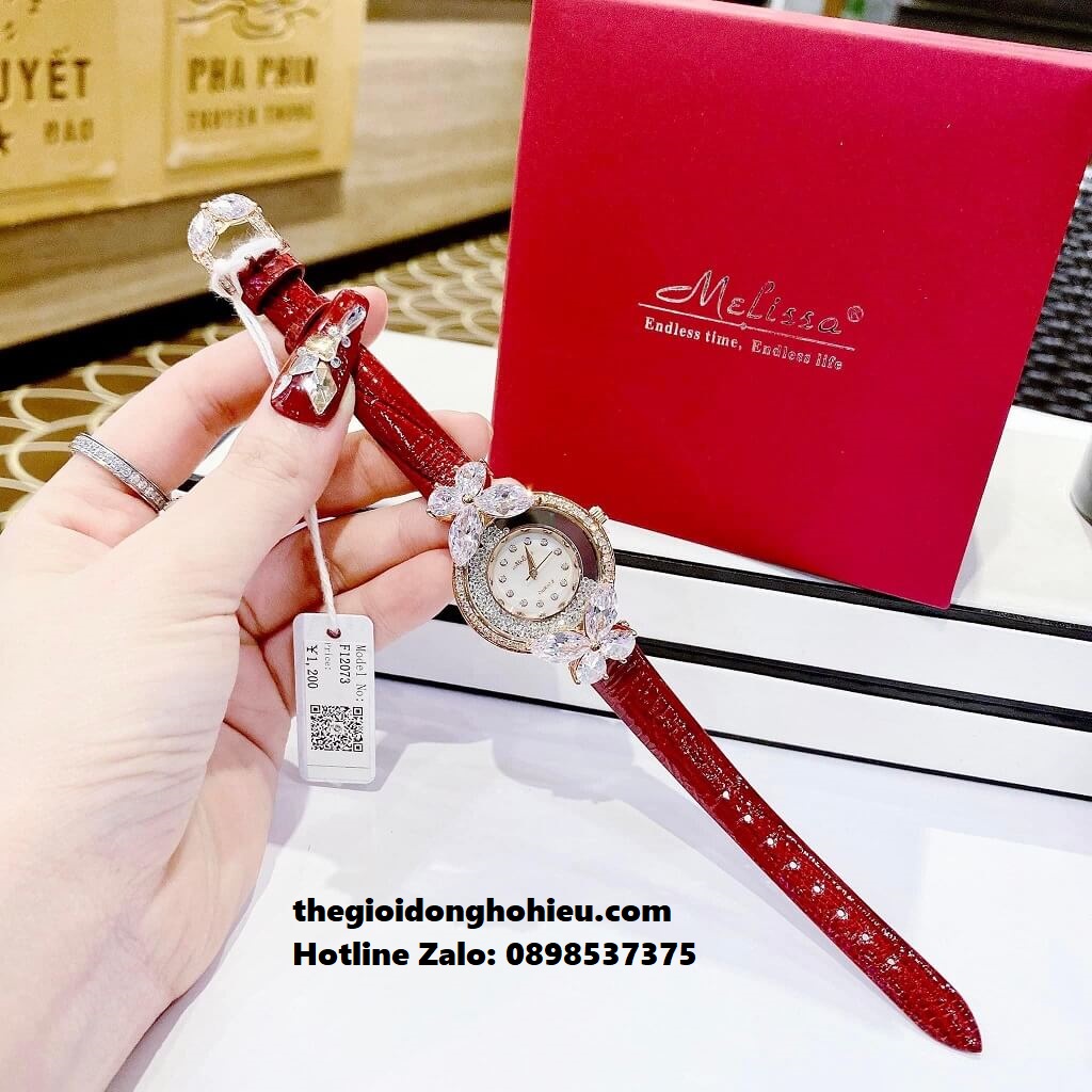 - Sản phẩm Đồng Hồ Nữ Melissa F12073 Dây Da Đỏ Rose Gold 30mm Chính Hãng bao gồm đầy đủ phụ kiện: Hộp + Túi + Thẻ bảo hành