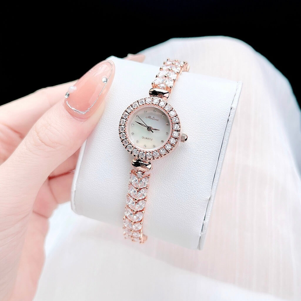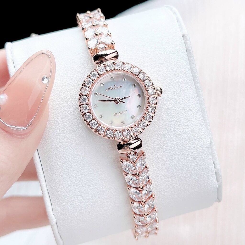 Thanh khiết trong trẻo như nàng Mỹ Nhân Ngư. Melissa lâu lâu lại cho ra mắt một mẫu bé xinh cưng hết nấc, case siêu yêu 26mm dành cho các nàng tay tấm. Mặt đồng hồ khảm trai, đá đính quanh viền, các mốc giờ điểm đá cực dễ nhìn. Điểm nhấn đặc biệt là đá hình chiếc lá xếp đối xứng ở phần quai đẹp dã man