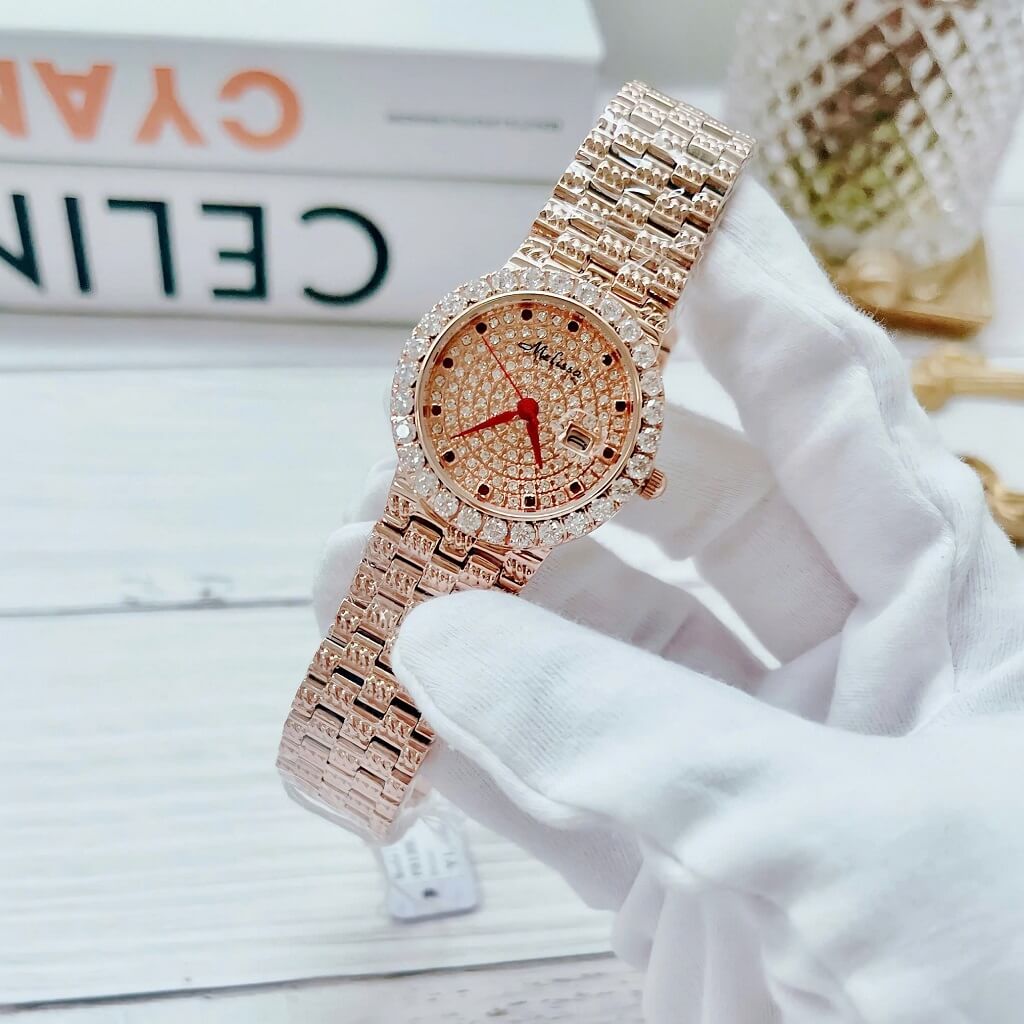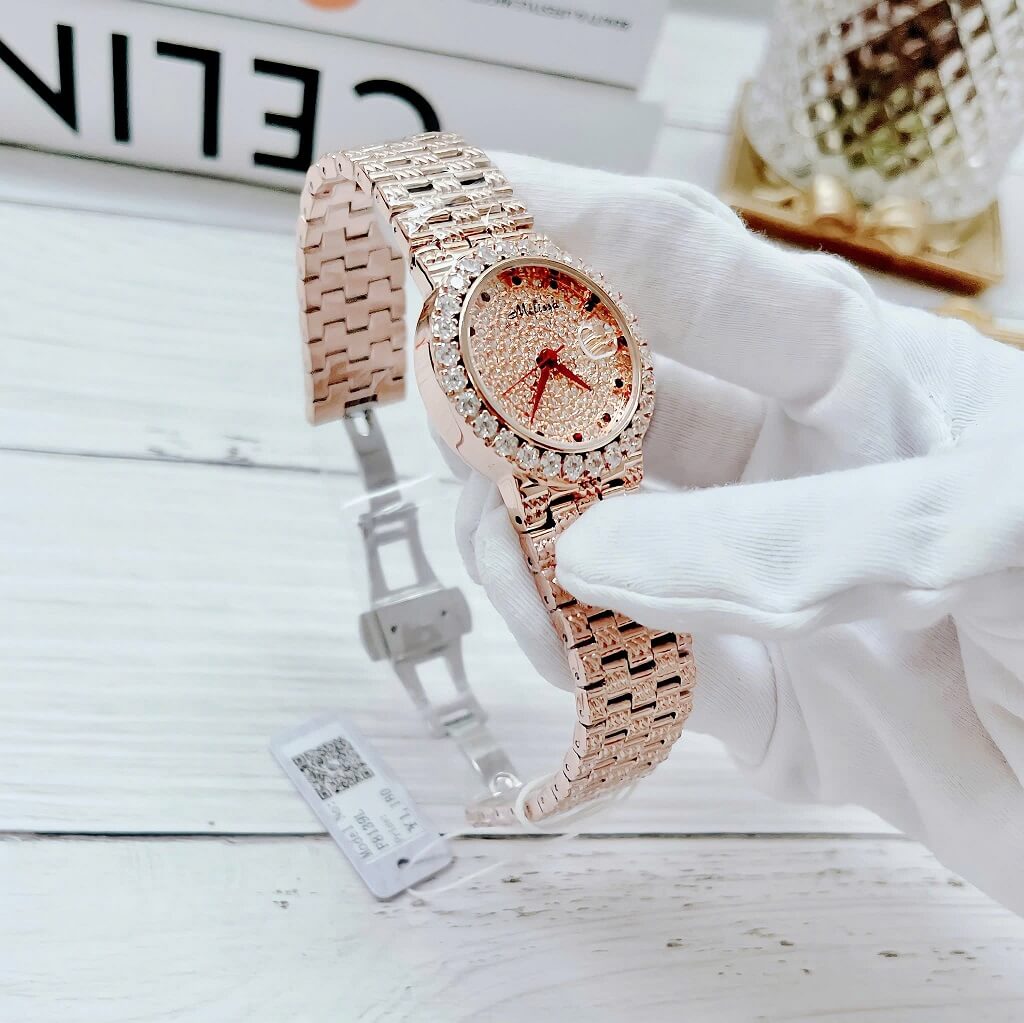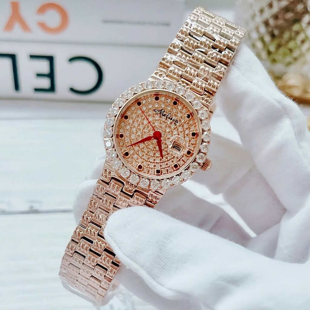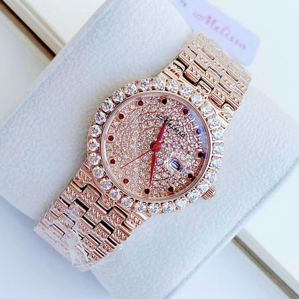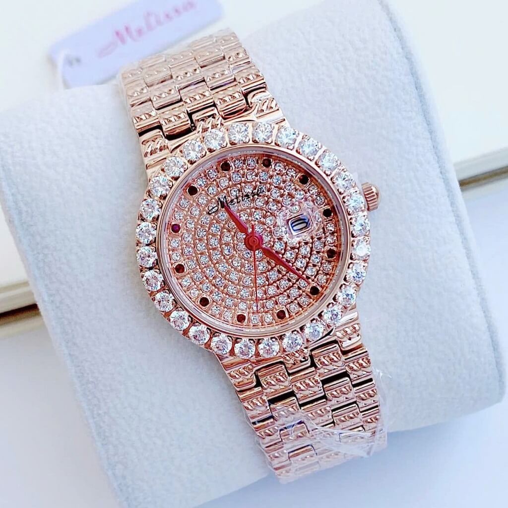Melissa F8139 - tưởng đâu là Piaget tiền tỷ đẳng cấp. Mặt full đá, cọc chia giờ rõ ràng, viền được gắn đá cực sáng. Dây hoa văn sáng lấp lánh