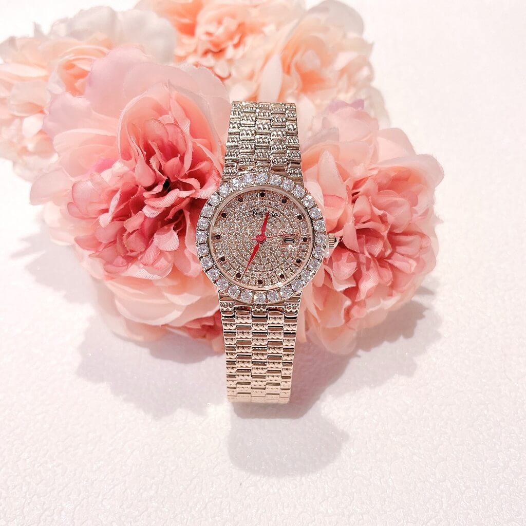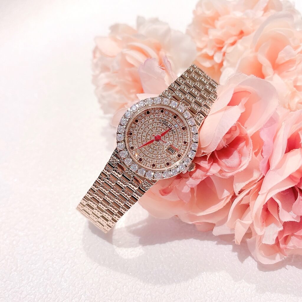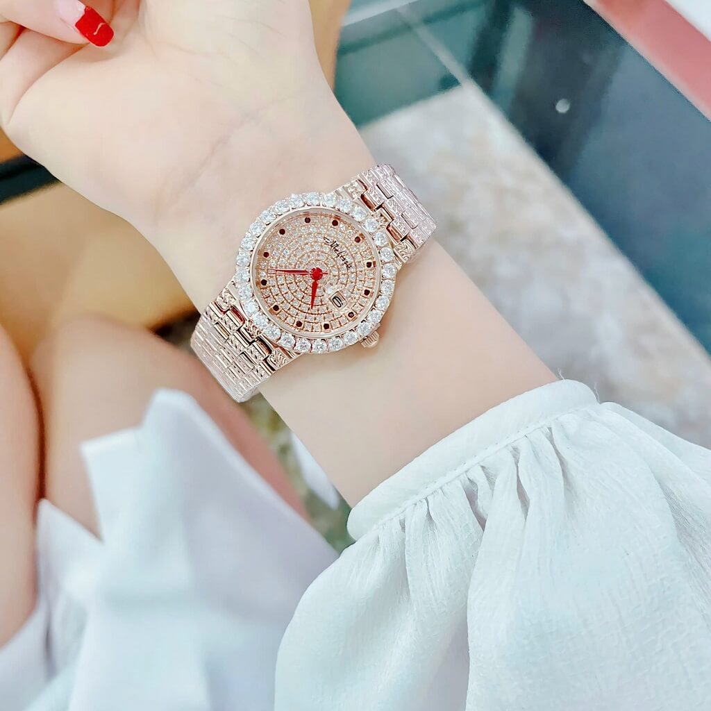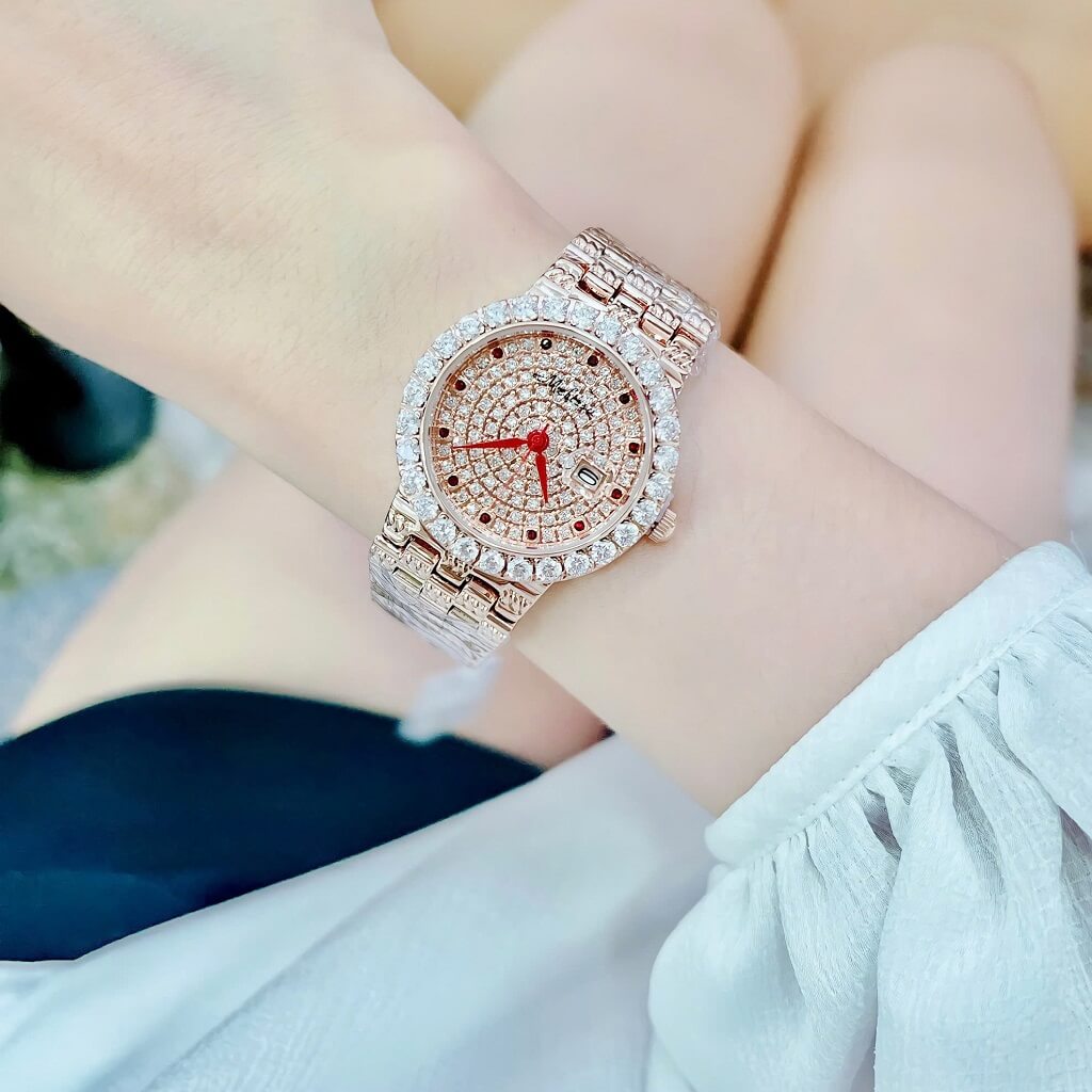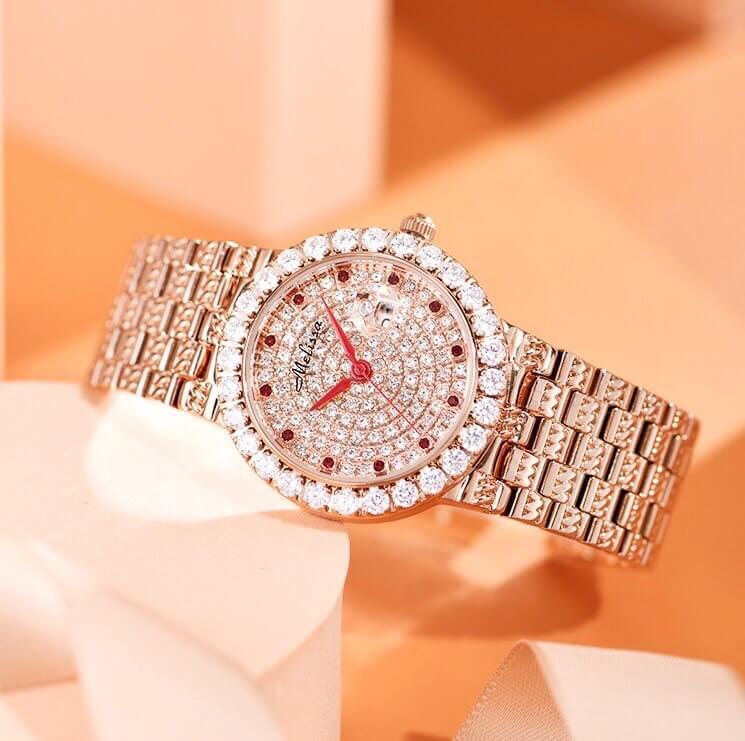 Melissa F8139 - tưởng đâu là Piaget tiền tỷ đẳng cấp. Mặt full đá, cọc chia giờ rõ ràng, viền được gắn đá cực sáng. Dây hoa văn sáng lấp lánh