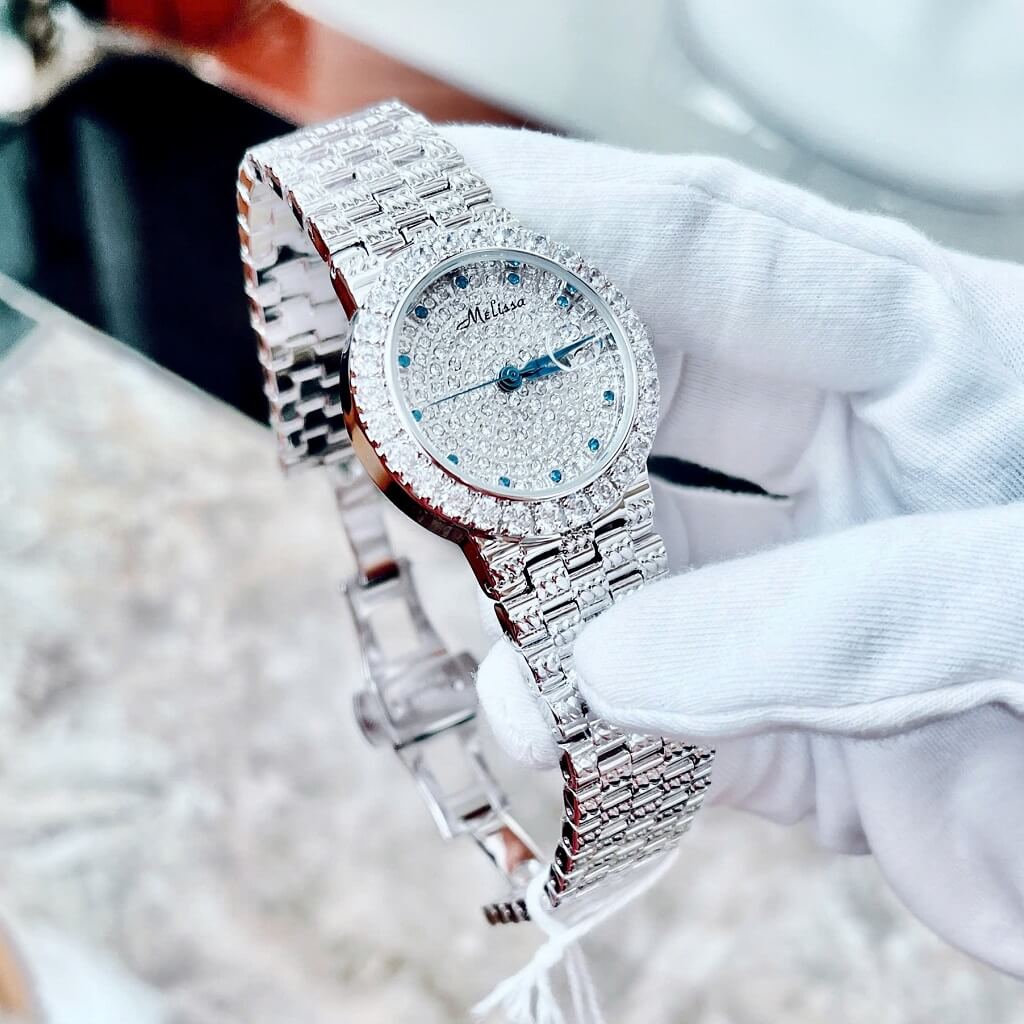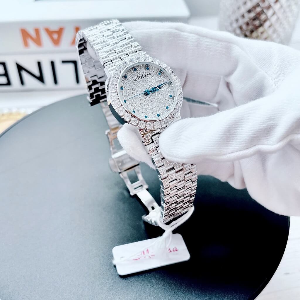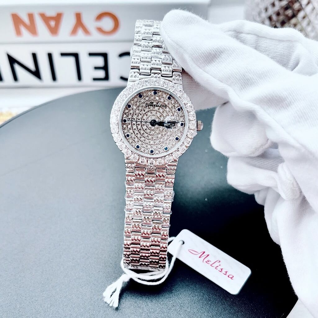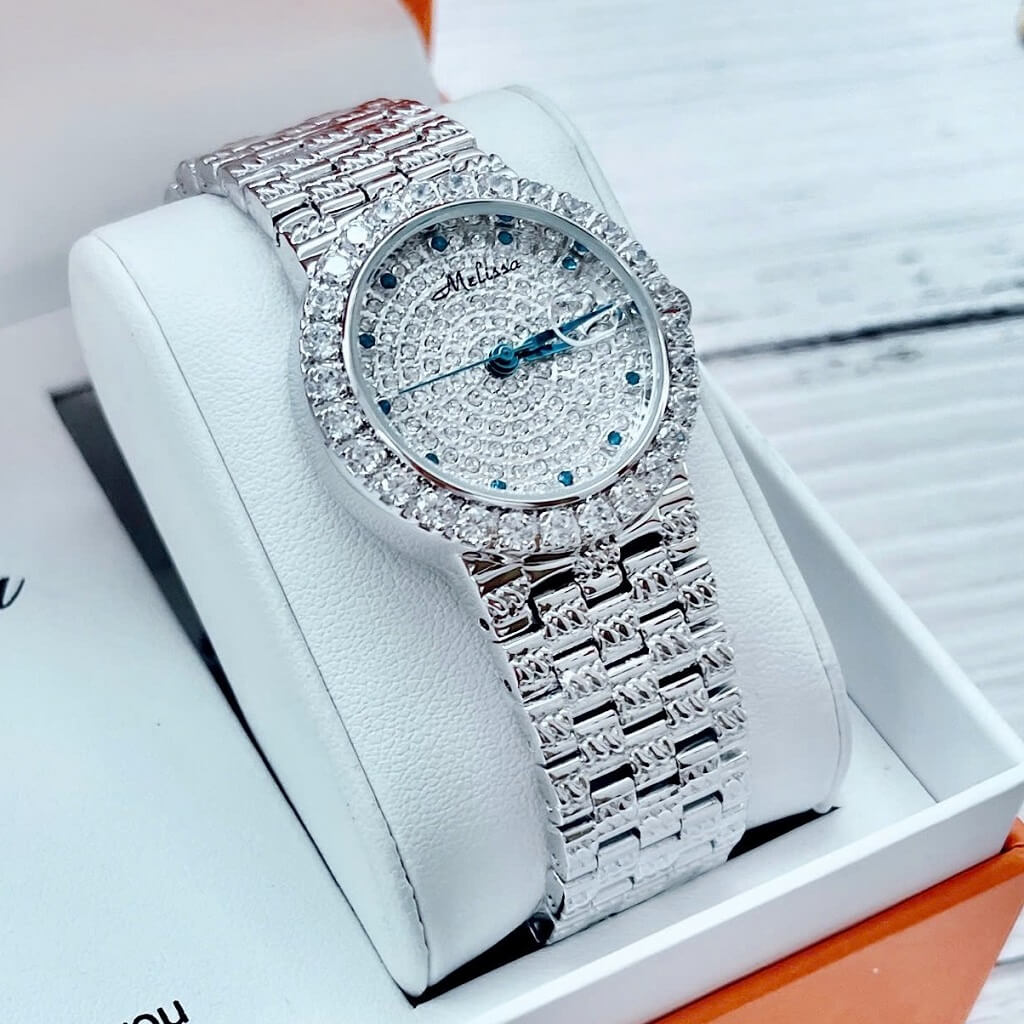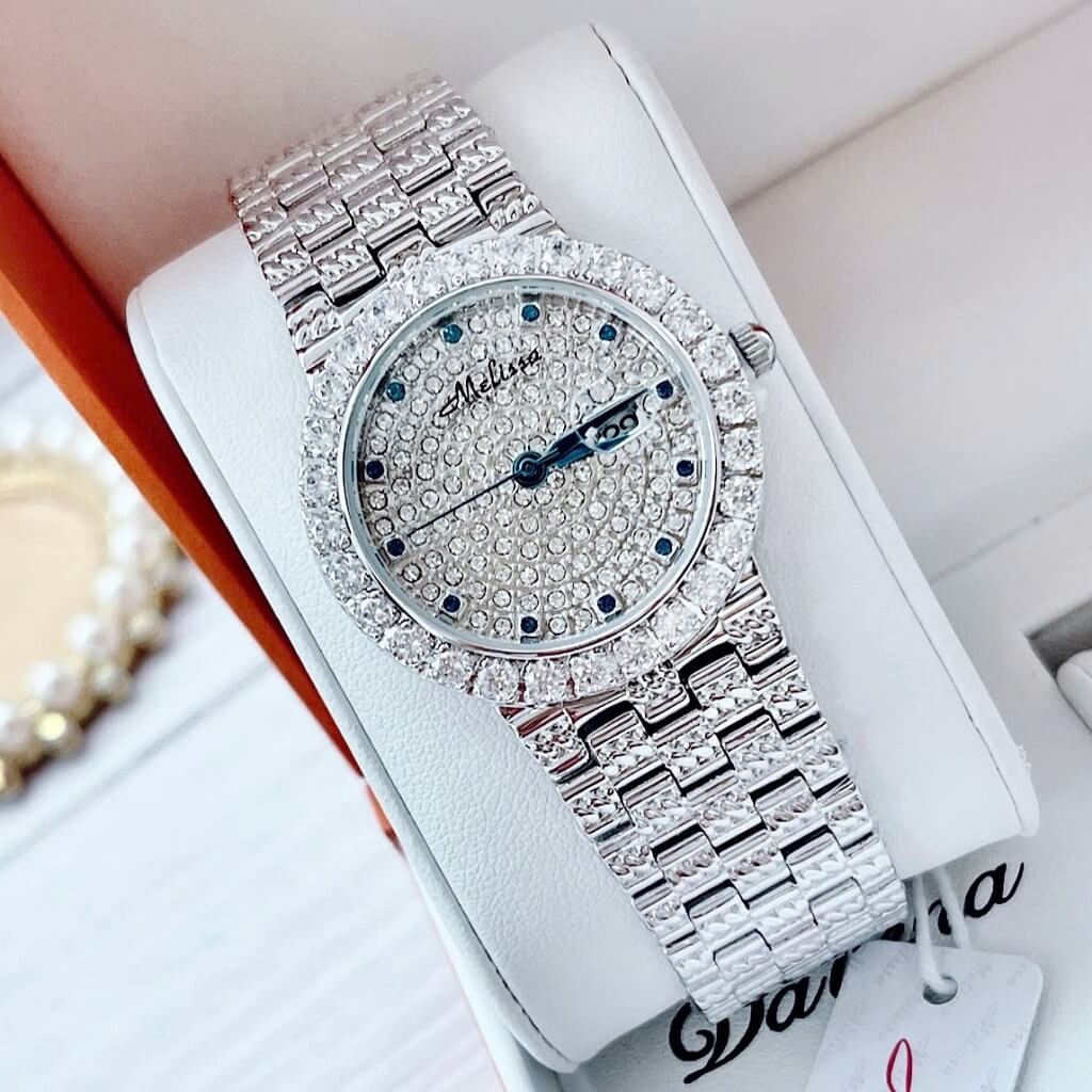 Melissa F8139 - tưởng đâu là Piaget tiền tỷ đẳng cấp. Mặt full đá, cọc chia giờ rõ ràng, viền được gắn đá cực sáng. Dây hoa văn sáng lấp lánh