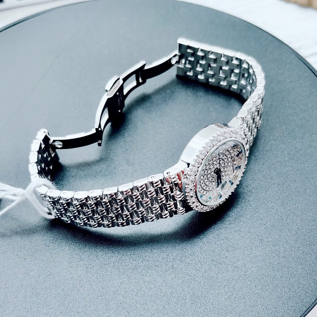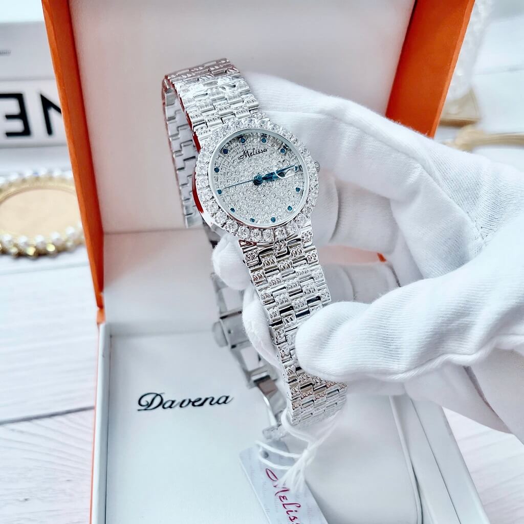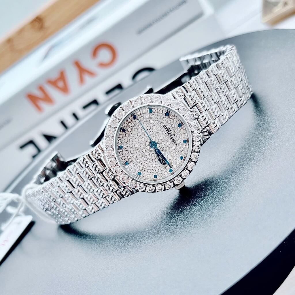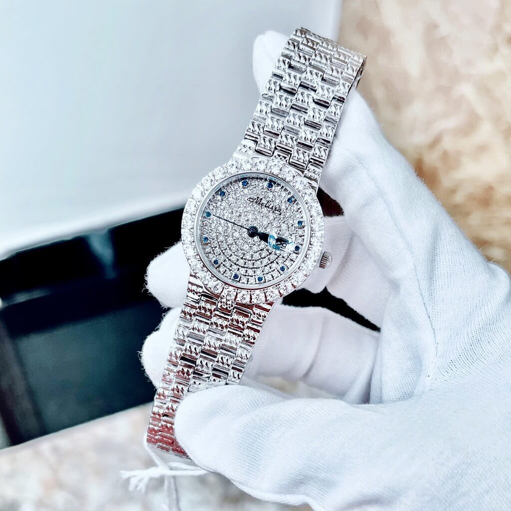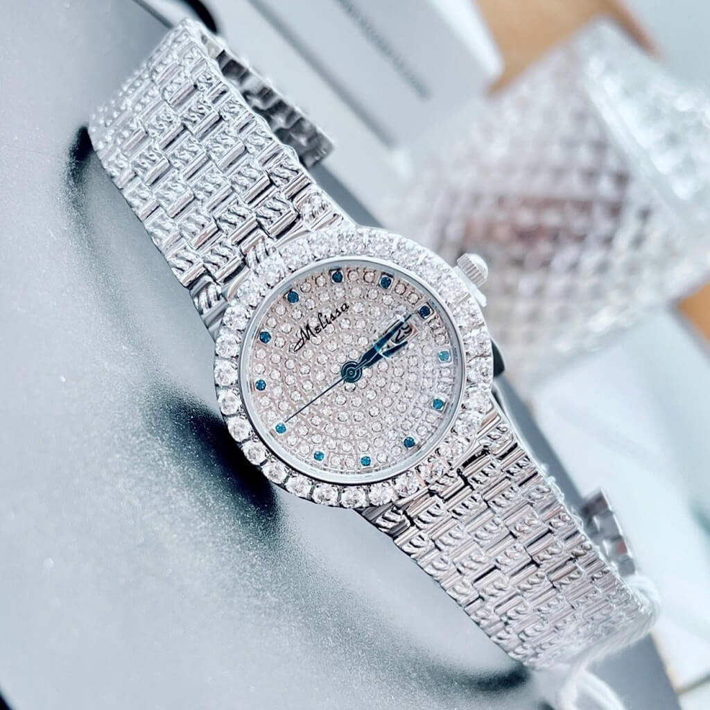 Melissa F8139 - tưởng đâu là Piaget tiền tỷ đẳng cấp. Mặt full đá, cọc chia giờ rõ ràng, viền được gắn đá cực sáng. Dây hoa văn sáng lấp lánh
