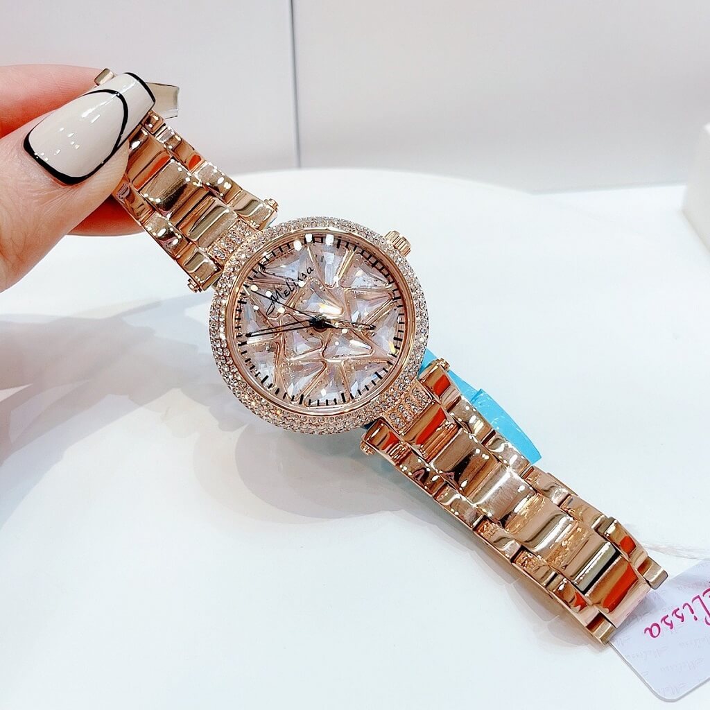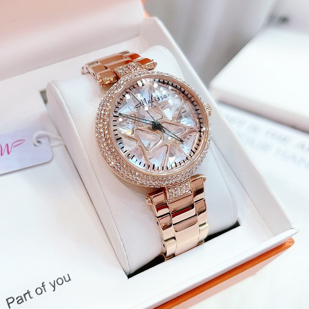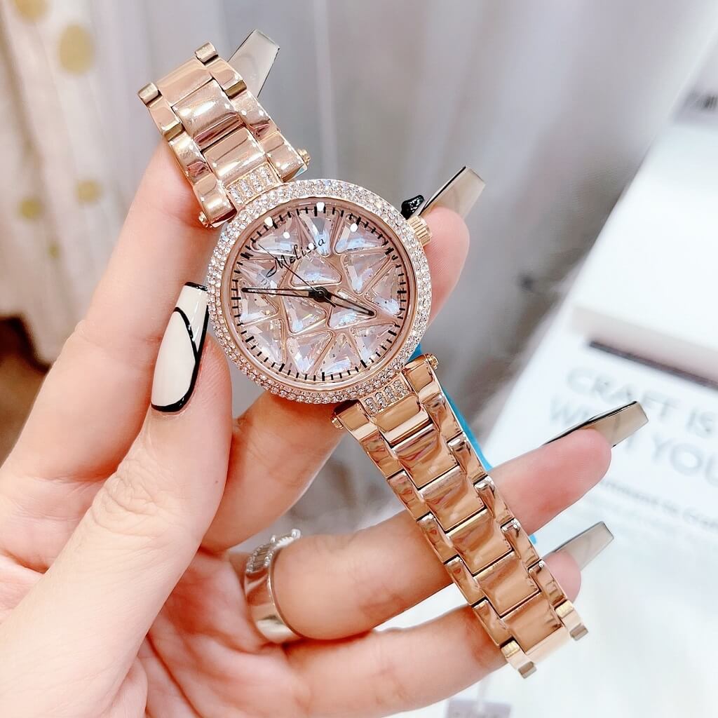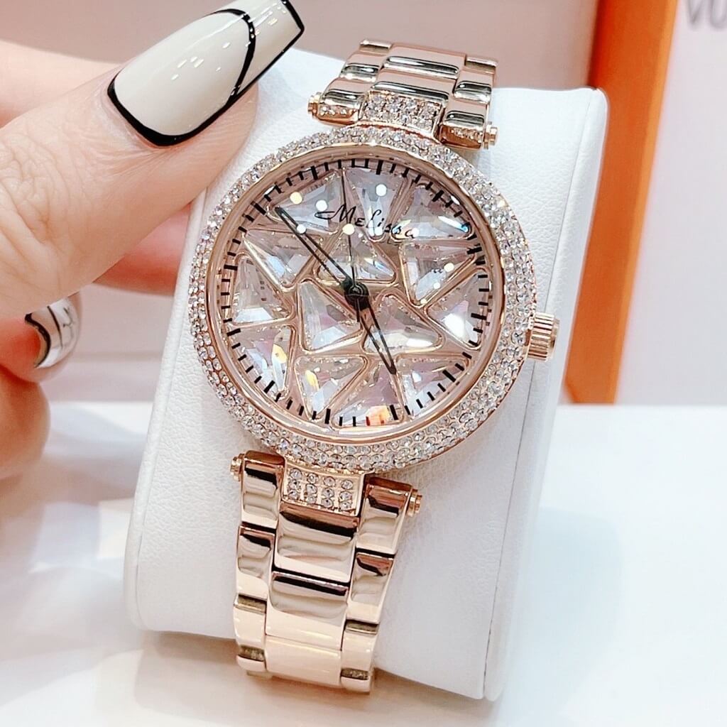 Chị em nào team pha lê thì vô ngay mẫu đồng hồ này ạ. Điểm nổi bật nhất là hoạ tiết pha lê cắt vát full mặt đồng hồ xoay theo chuyển động tay tạo nên sự cá tính, độc lạ