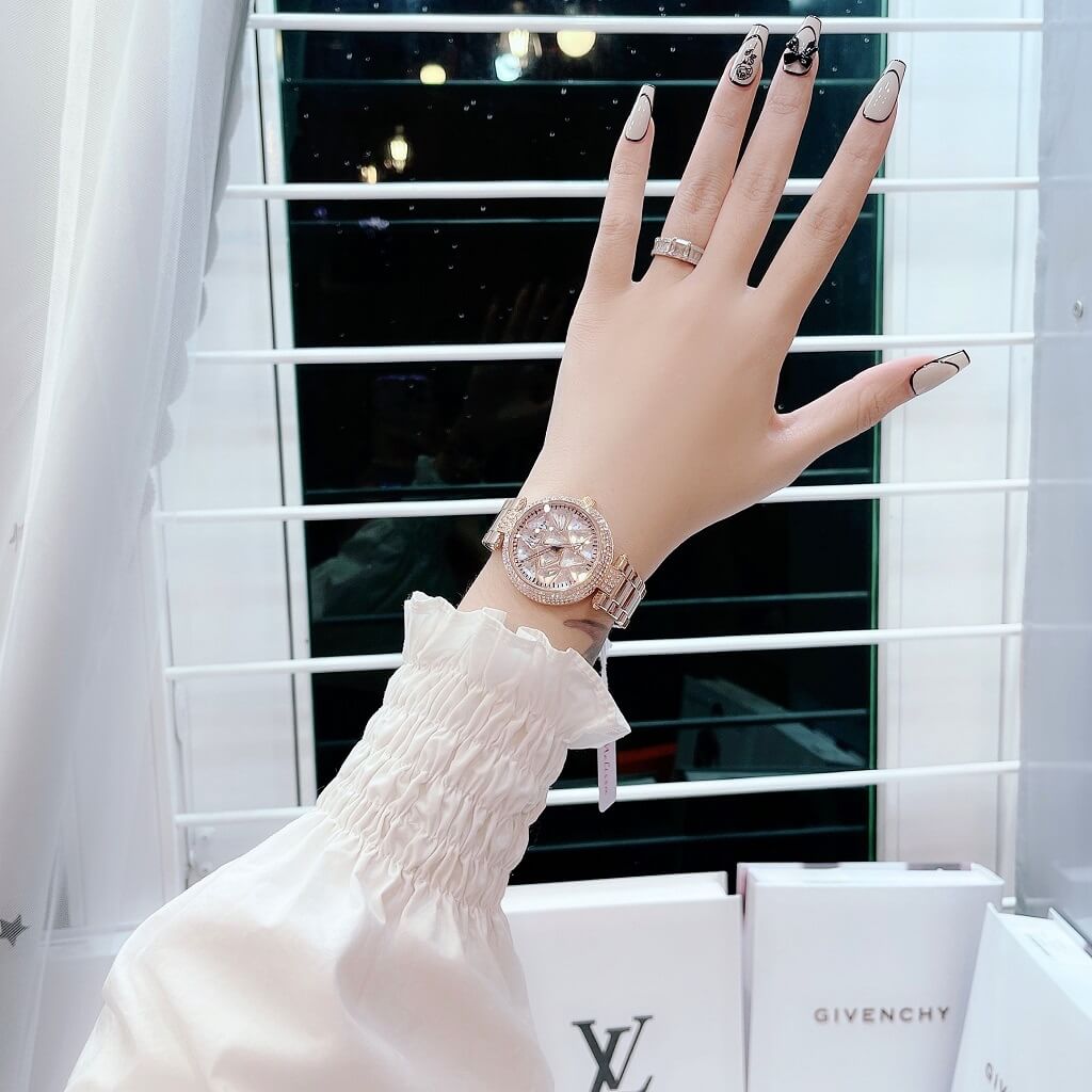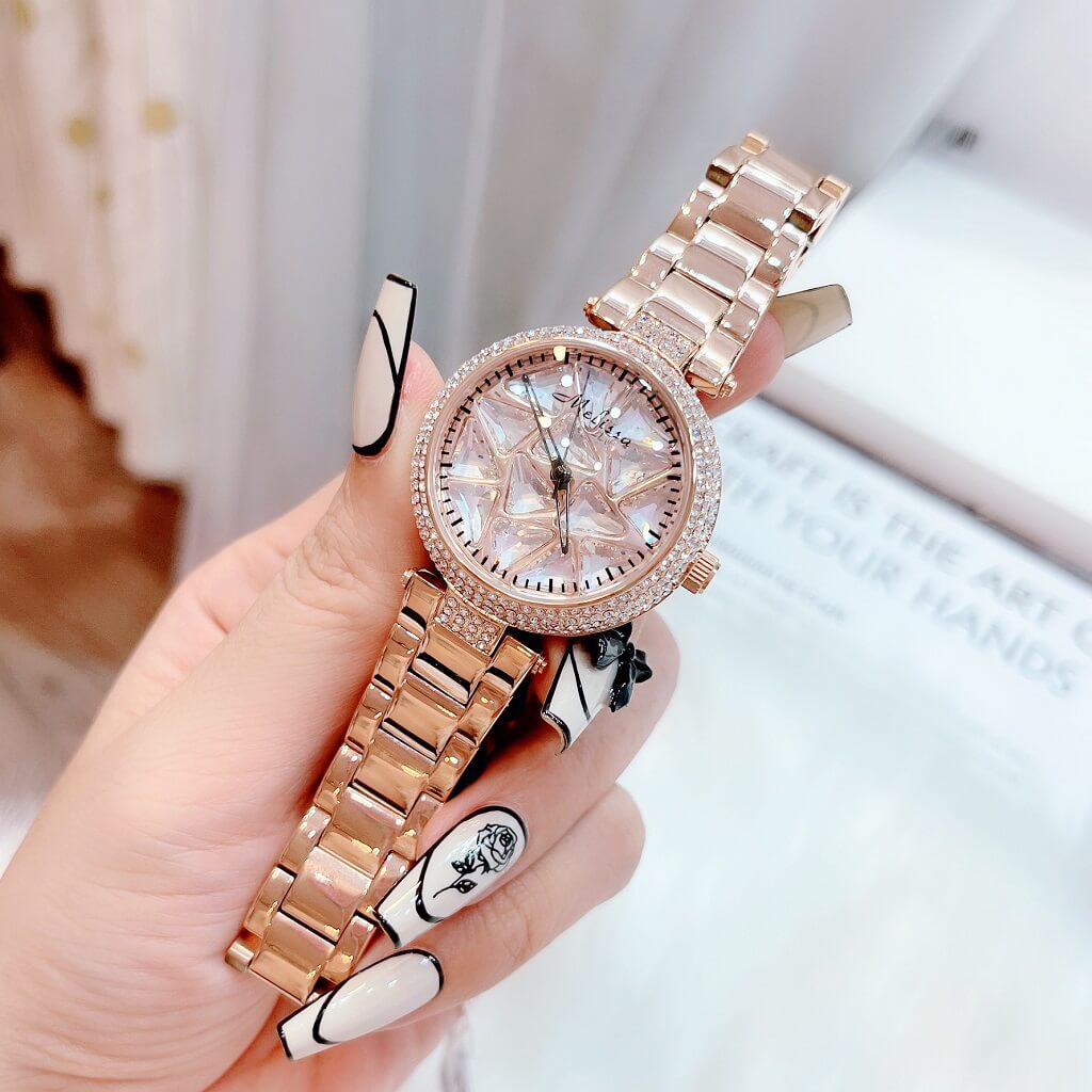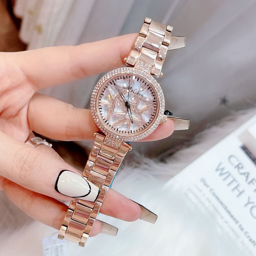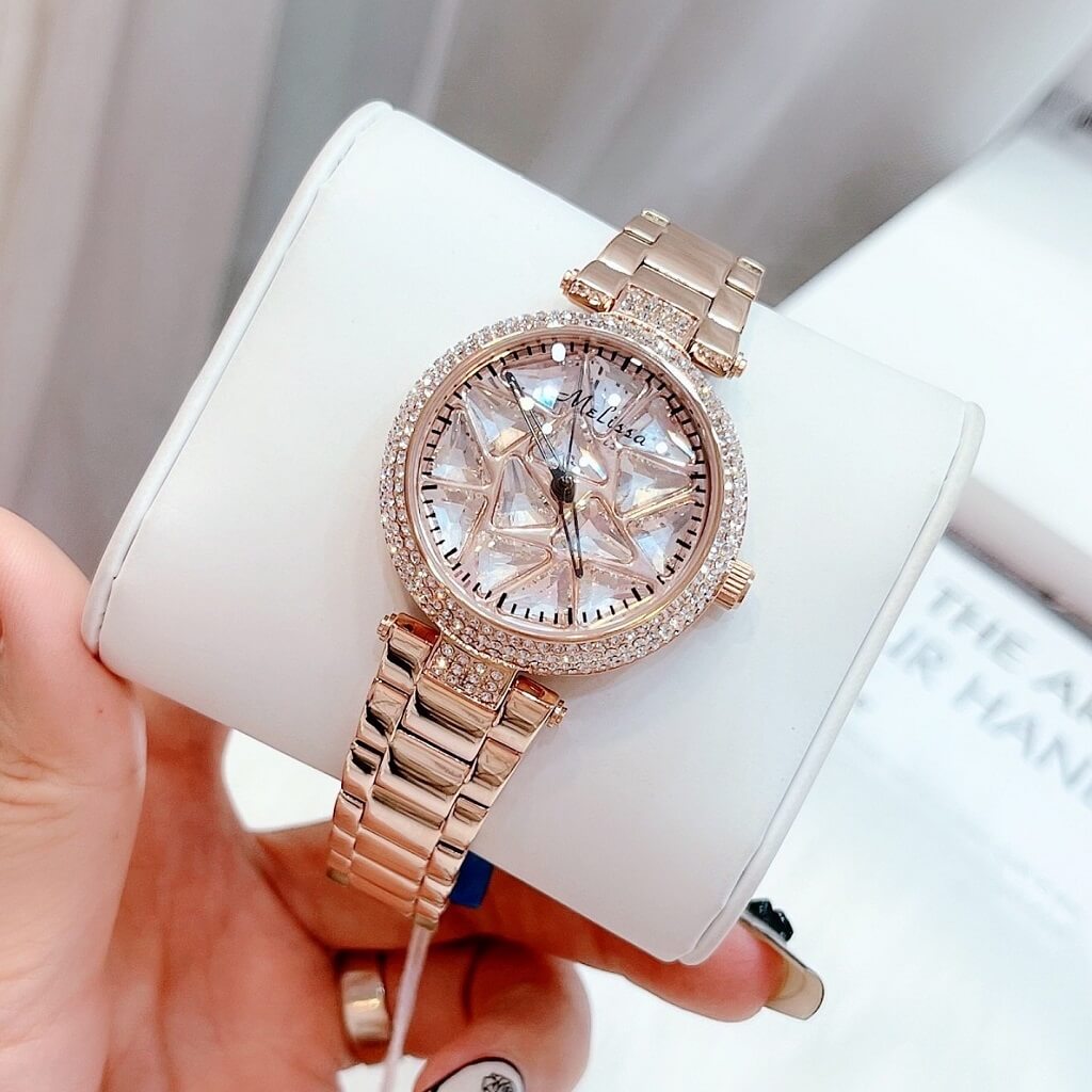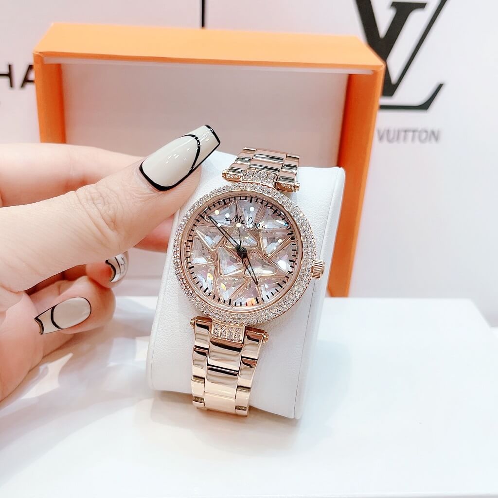 Chị em nào team pha lê thì vô ngay mẫu đồng hồ này ạ. Điểm nổi bật nhất là hoạ tiết pha lê cắt vát full mặt đồng hồ xoay theo chuyển động tay tạo nên sự cá tính, độc lạ