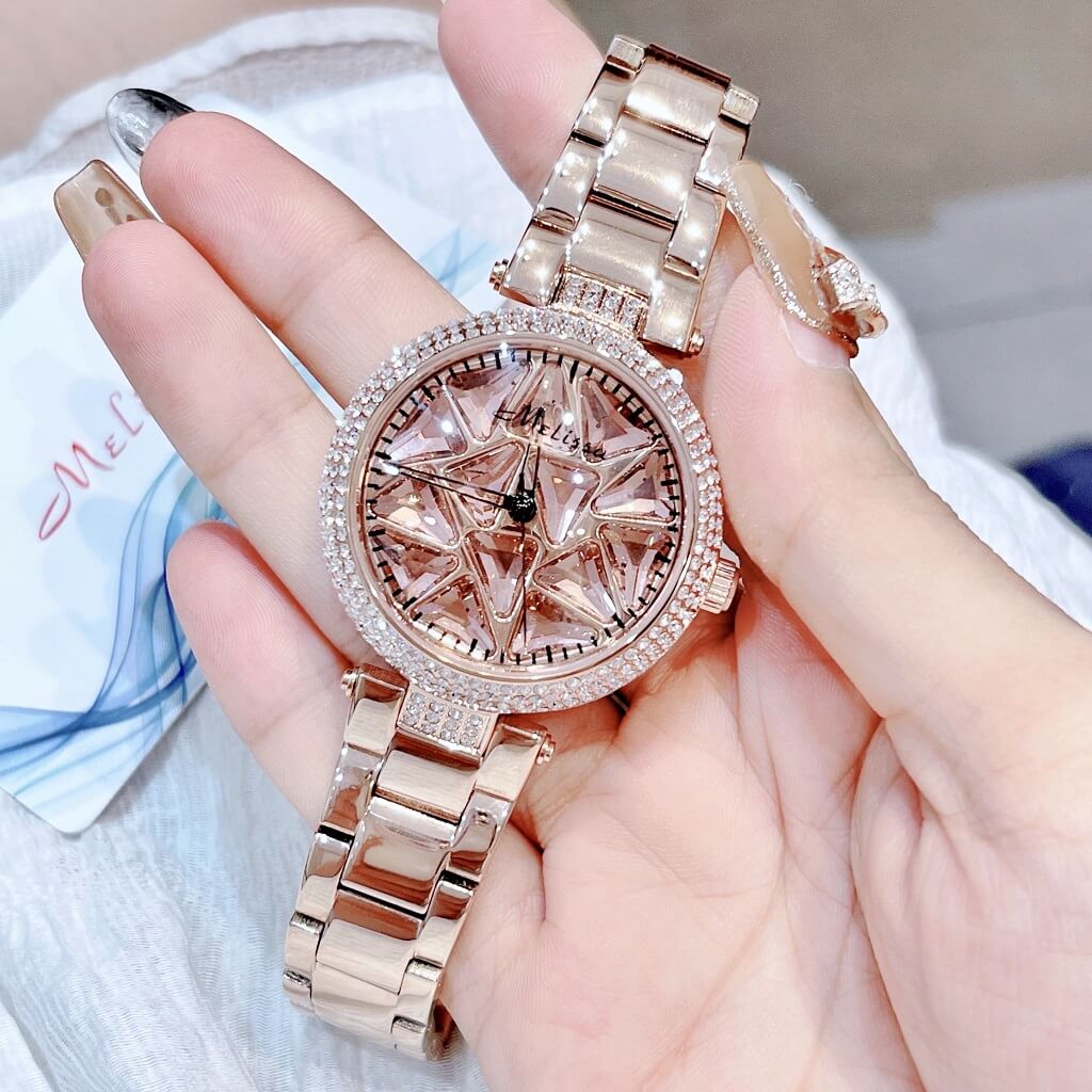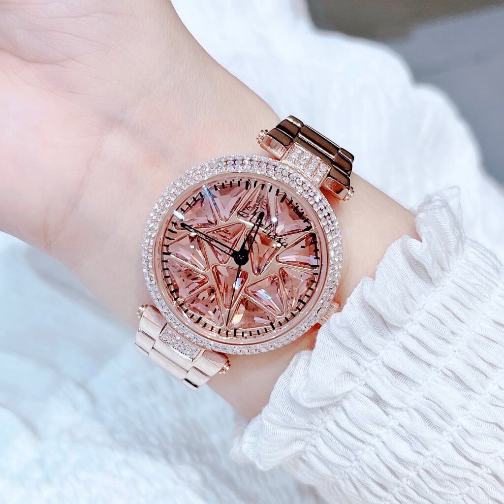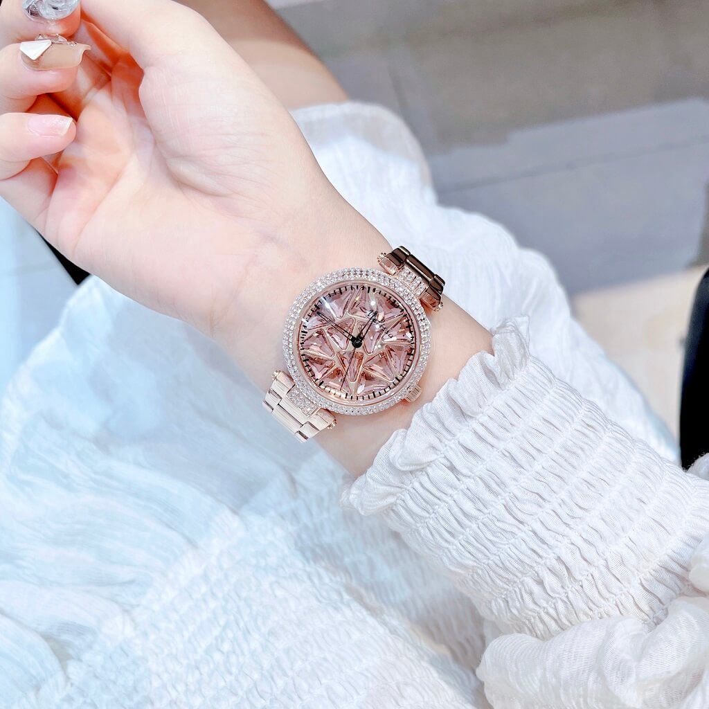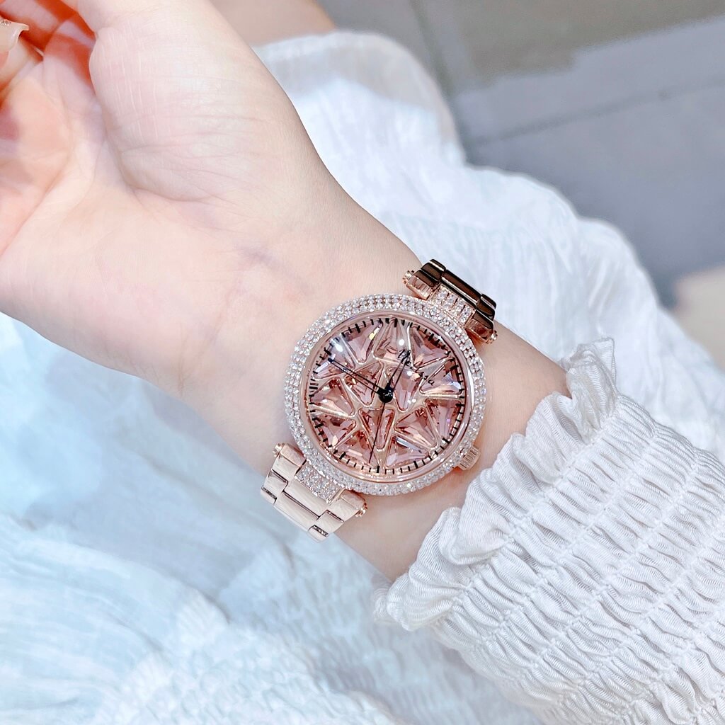 Chị em nào team pha lê thì vô ngay mẫu đồng hồ này ạ. Điểm nổi bật nhất là hoạ tiết pha lê cắt vát full mặt đồng hồ xoay theo chuyển động tay tạo nên sự cá tính, độc lạ