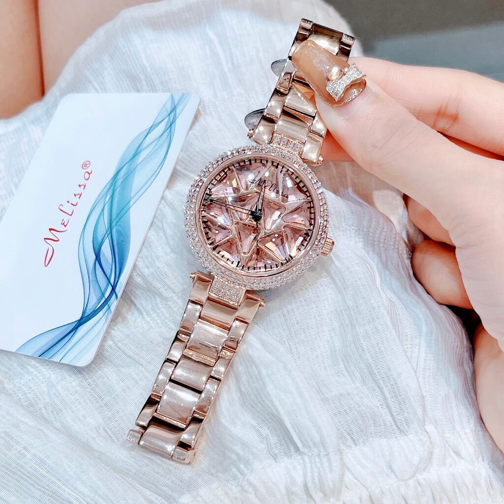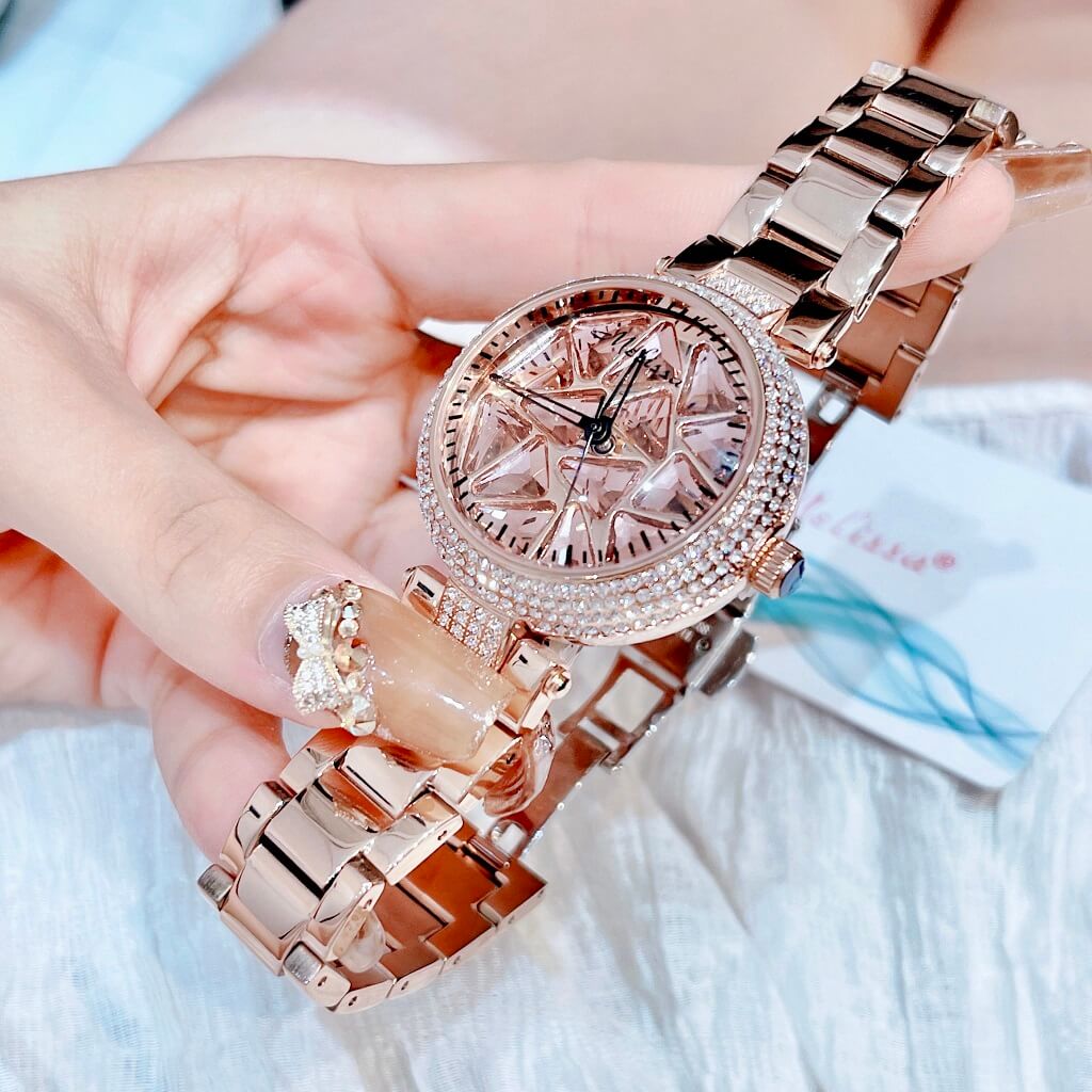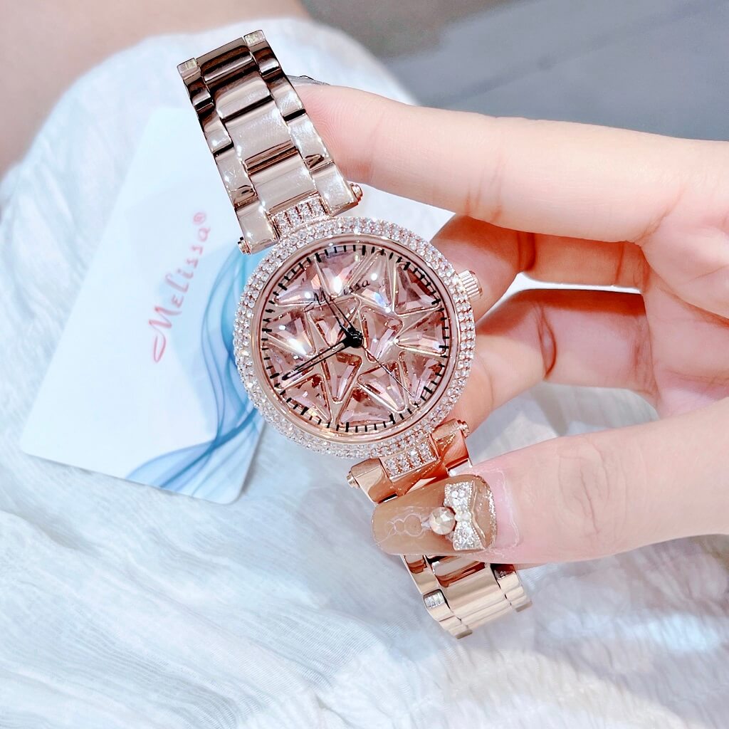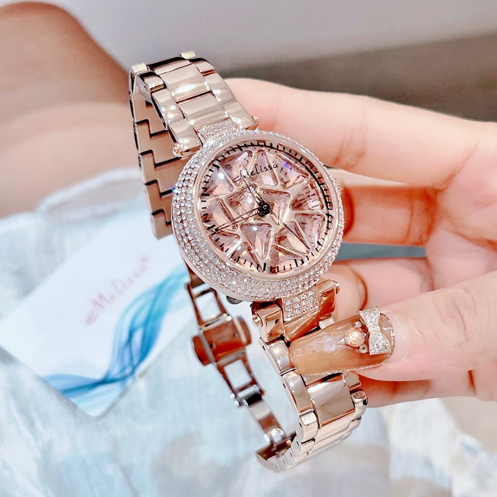 Chị em nào team pha lê thì vô ngay mẫu đồng hồ này ạ. Điểm nổi bật nhất là hoạ tiết pha lê cắt vát full mặt đồng hồ xoay theo chuyển động tay tạo nên sự cá tính, độc lạ