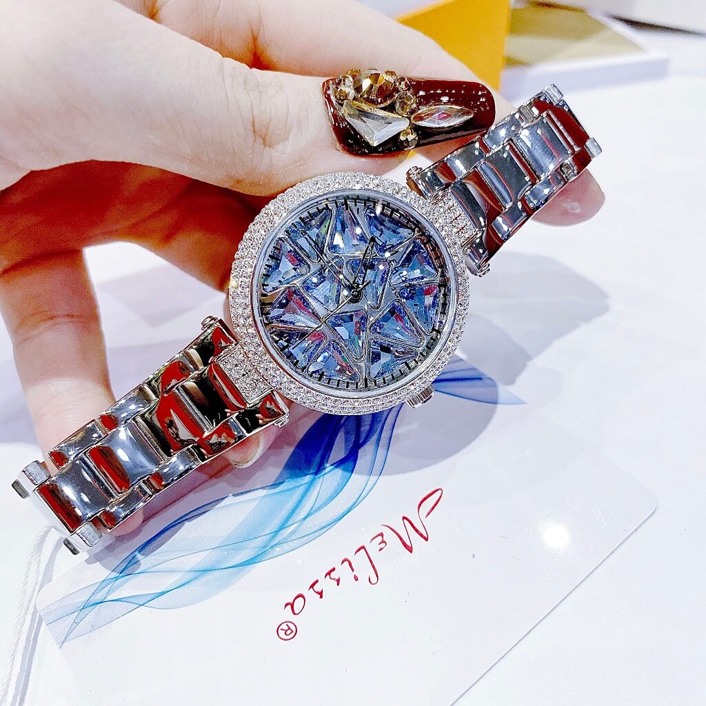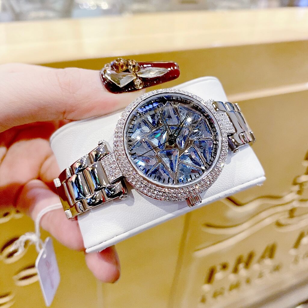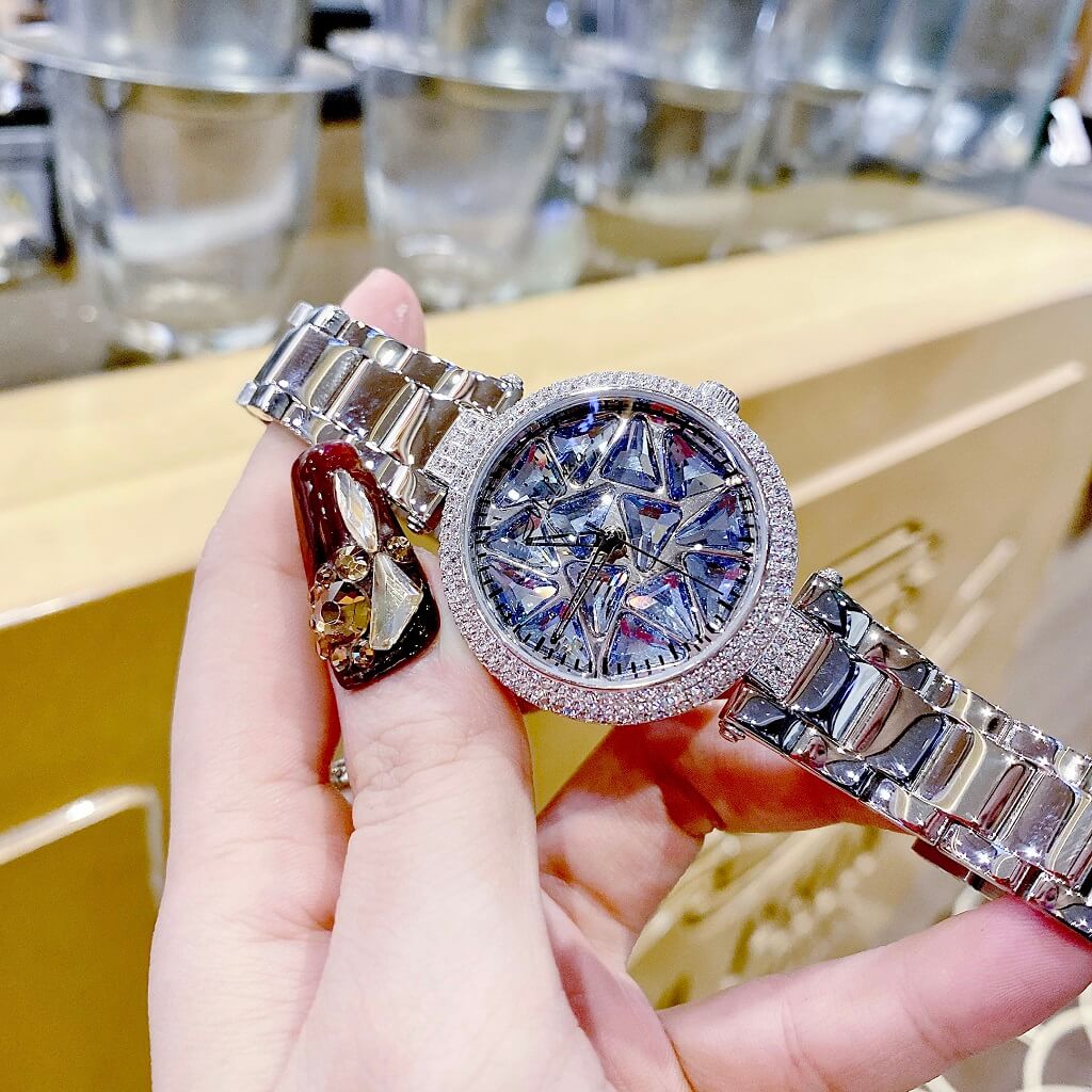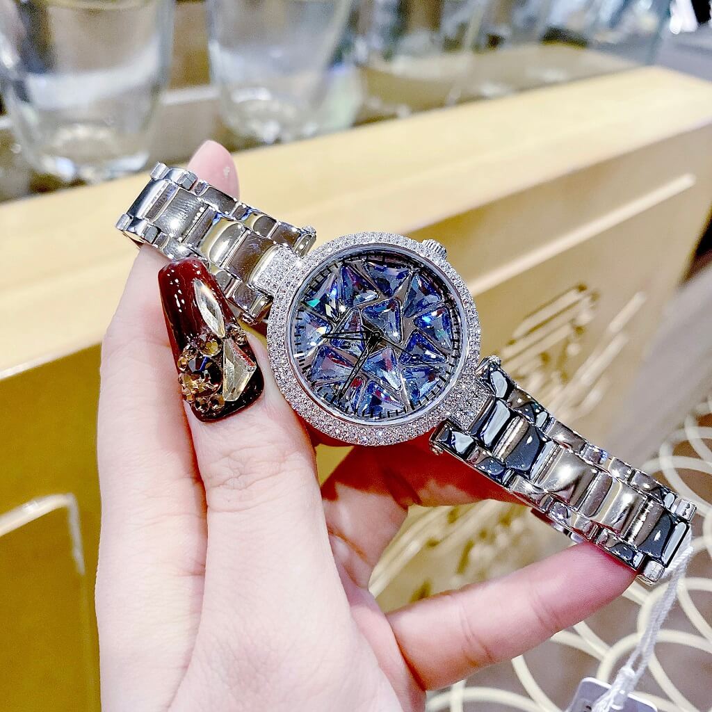 Chị em nào team pha lê thì vô ngay mẫu đồng hồ này ạ. Điểm nổi bật nhất là hoạ tiết pha lê cắt vát full mặt đồng hồ xoay theo chuyển động tay tạo nên sự cá tính, độc lạ