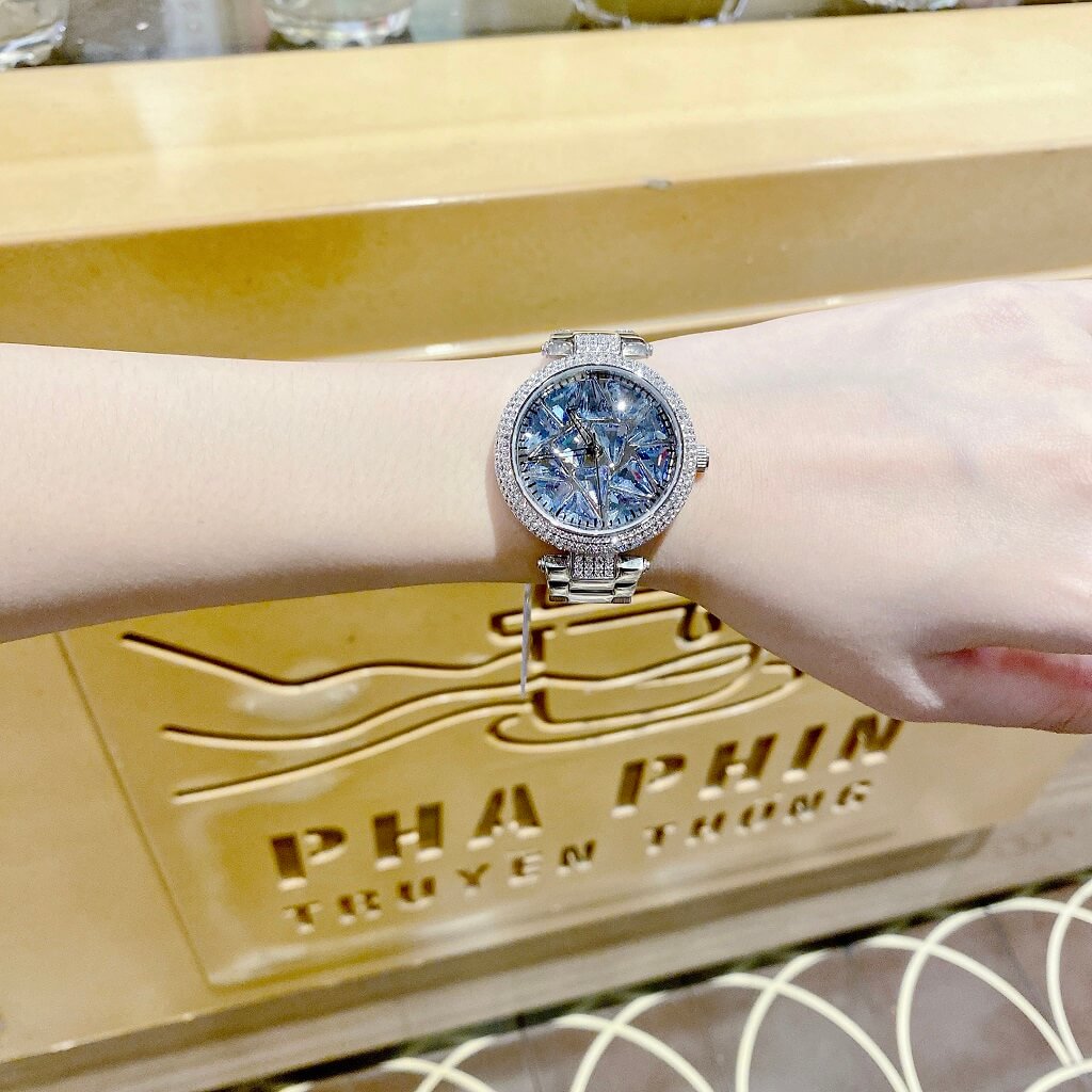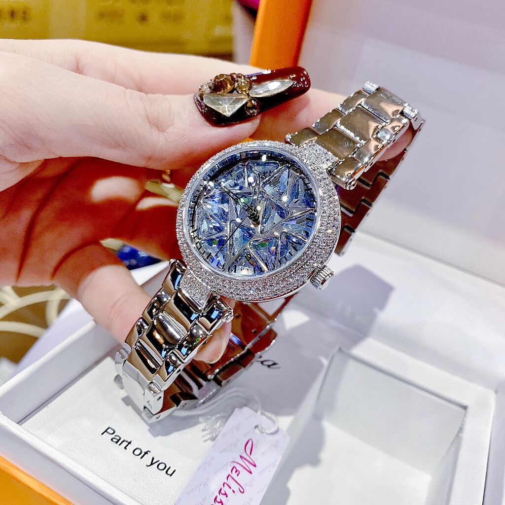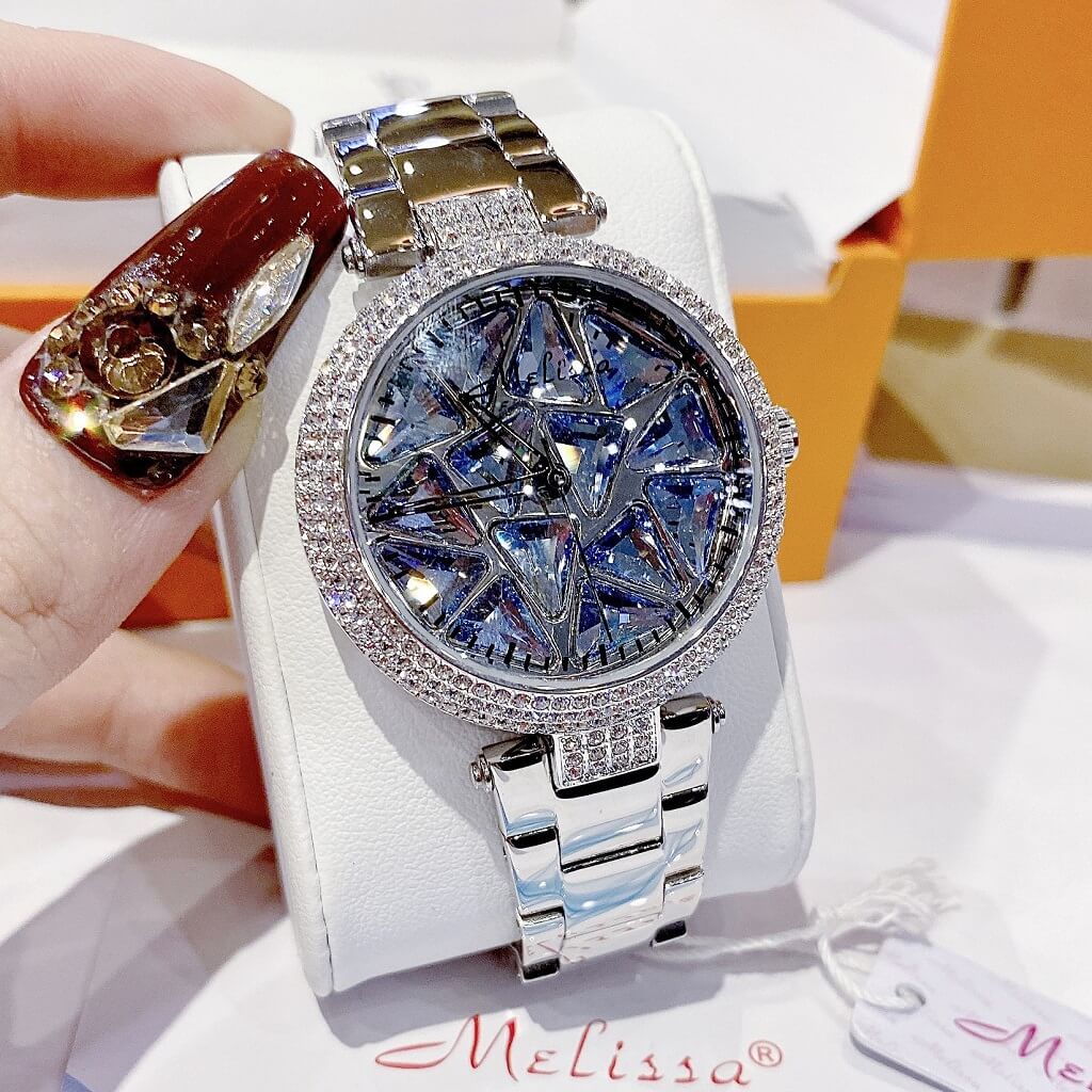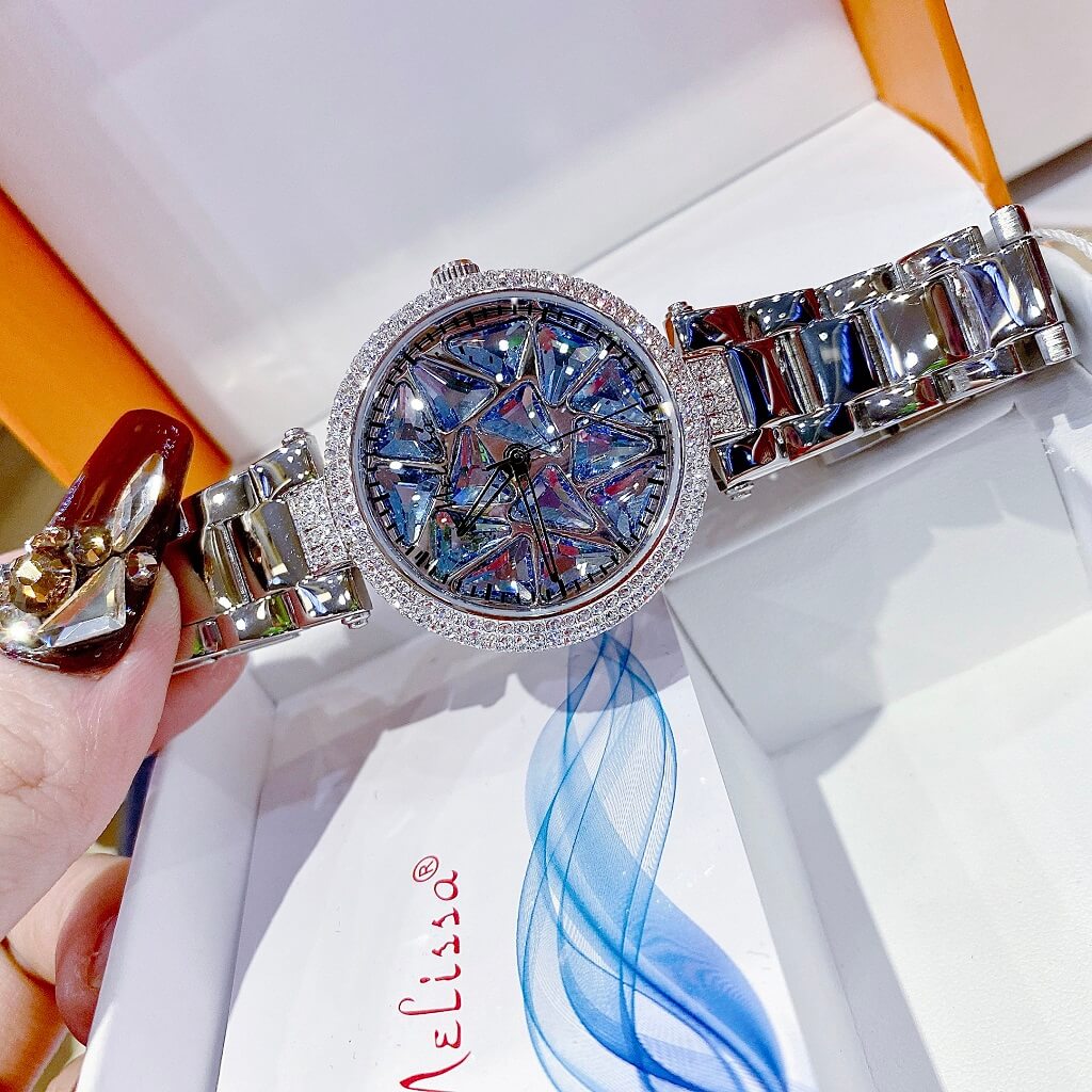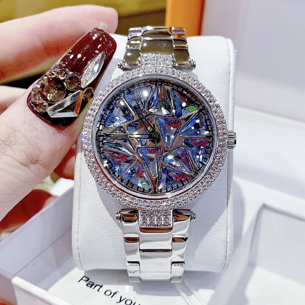 Chị em nào team pha lê thì vô ngay mẫu đồng hồ này ạ. Điểm nổi bật nhất là hoạ tiết pha lê cắt vát full mặt đồng hồ xoay theo chuyển động tay tạo nên sự cá tính, độc lạ