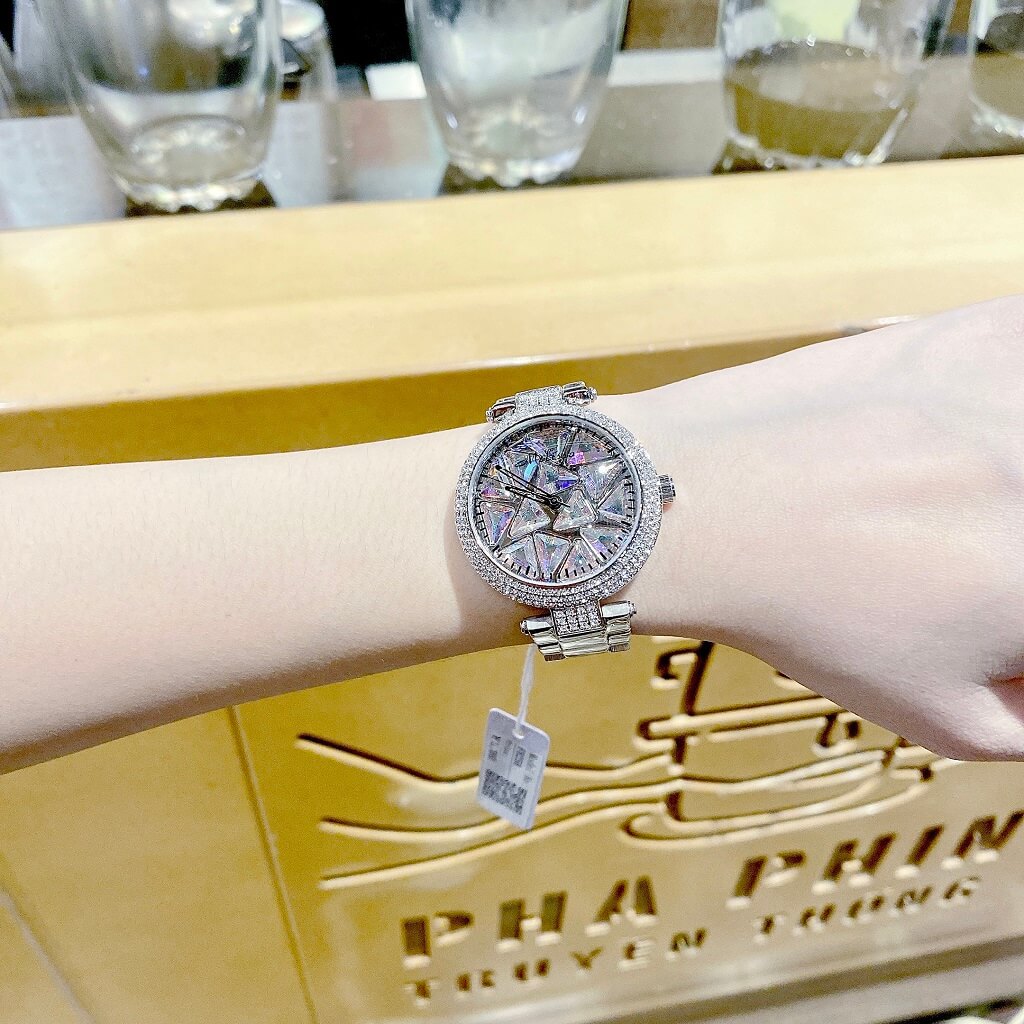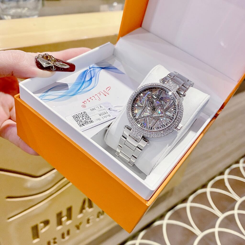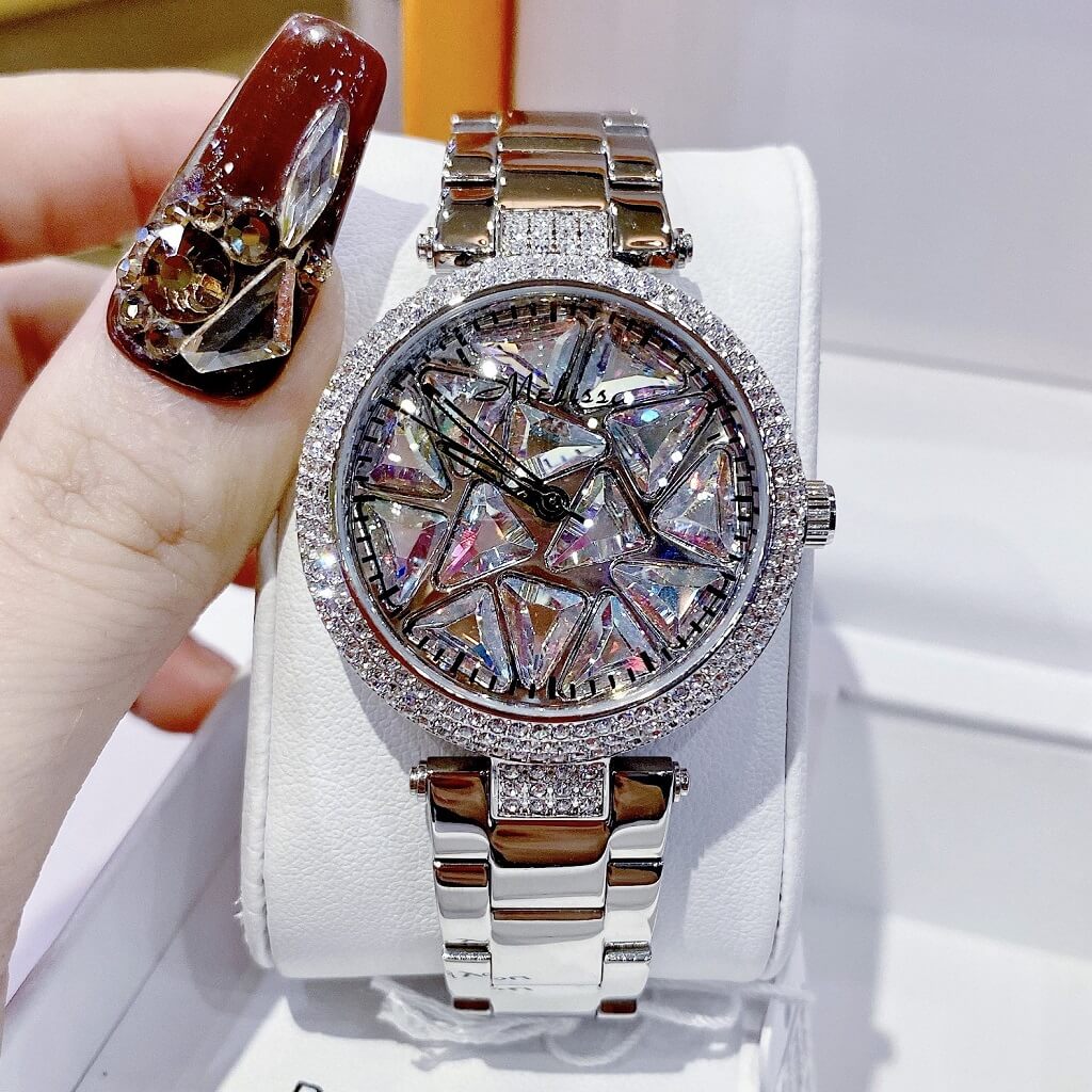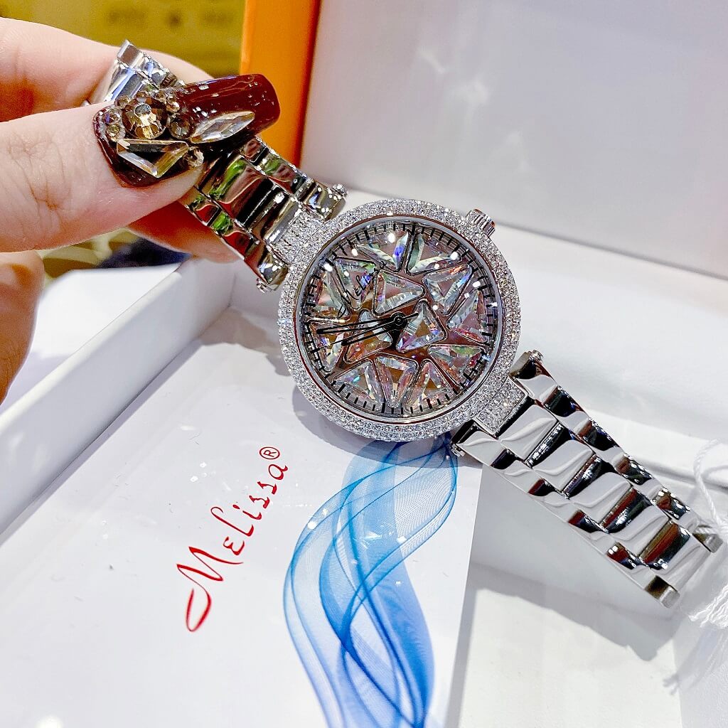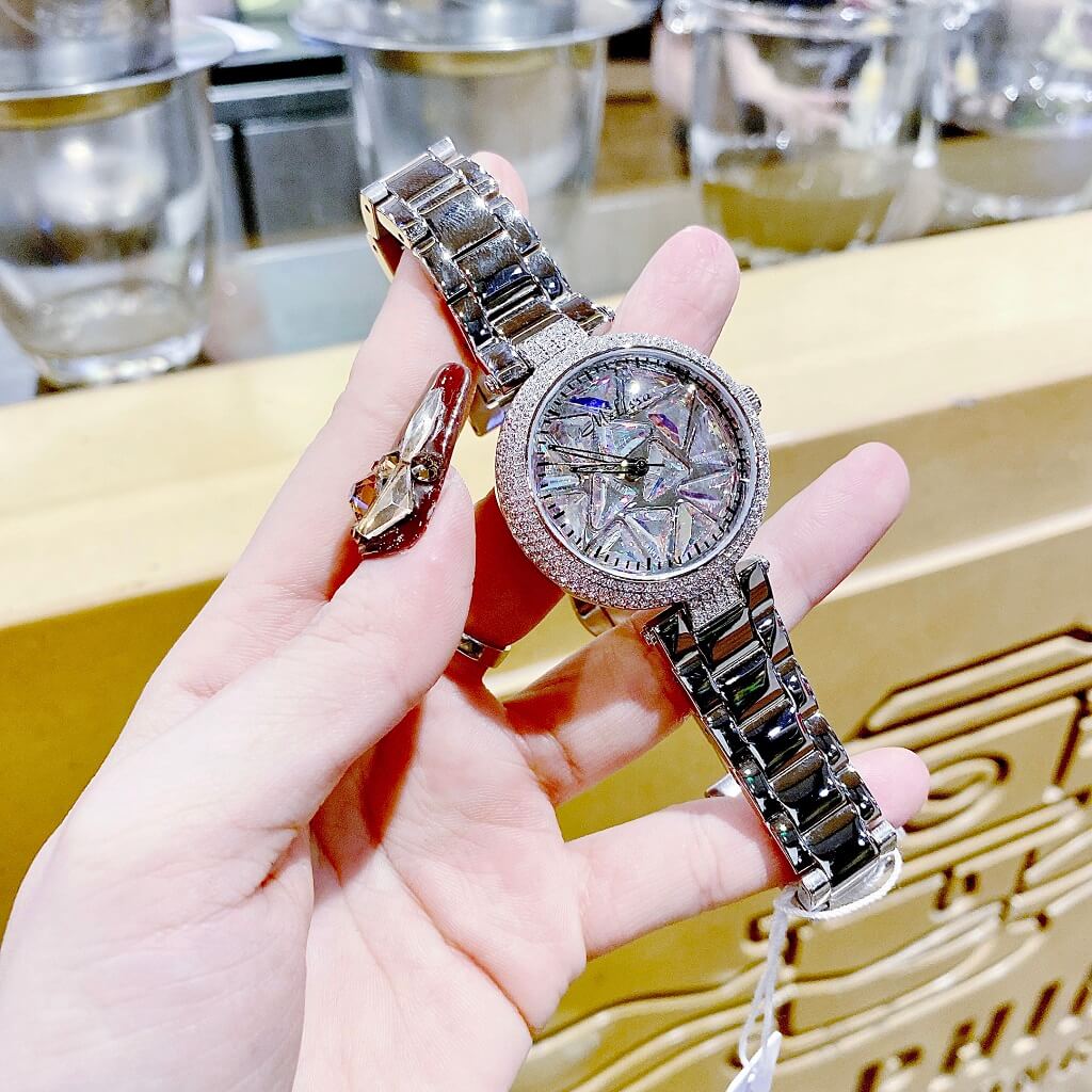 Chị em nào team pha lê thì vô ngay mẫu đồng hồ này ạ. Điểm nổi bật nhất là hoạ tiết pha lê cắt vát full mặt đồng hồ xoay theo chuyển động tay tạo nên sự cá tính, độc lạ