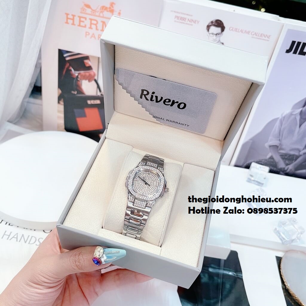 - Đồng hồ RIVERO với thiết kế bắt mắt, toàn bộ phần mặt full đá sáng long lanh, công nghệ đính đá đỉnh cao ít thương hiệu nào có được