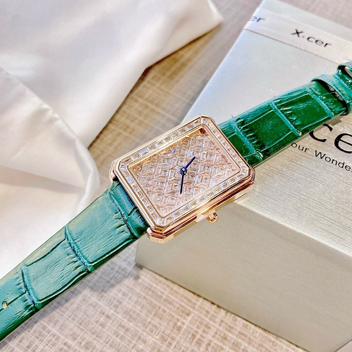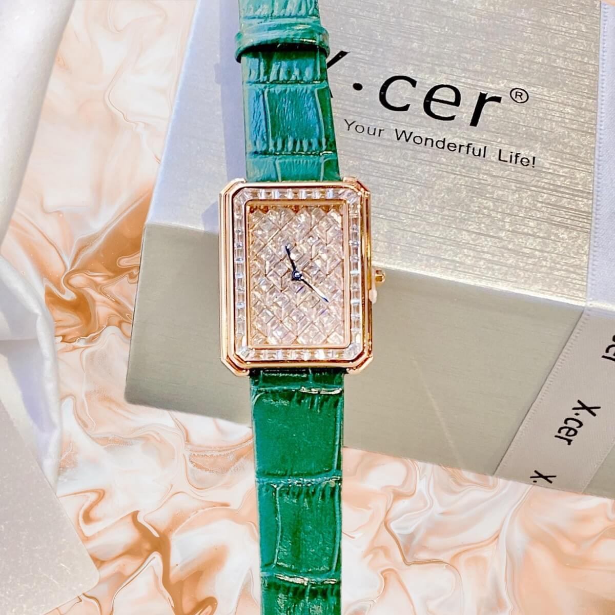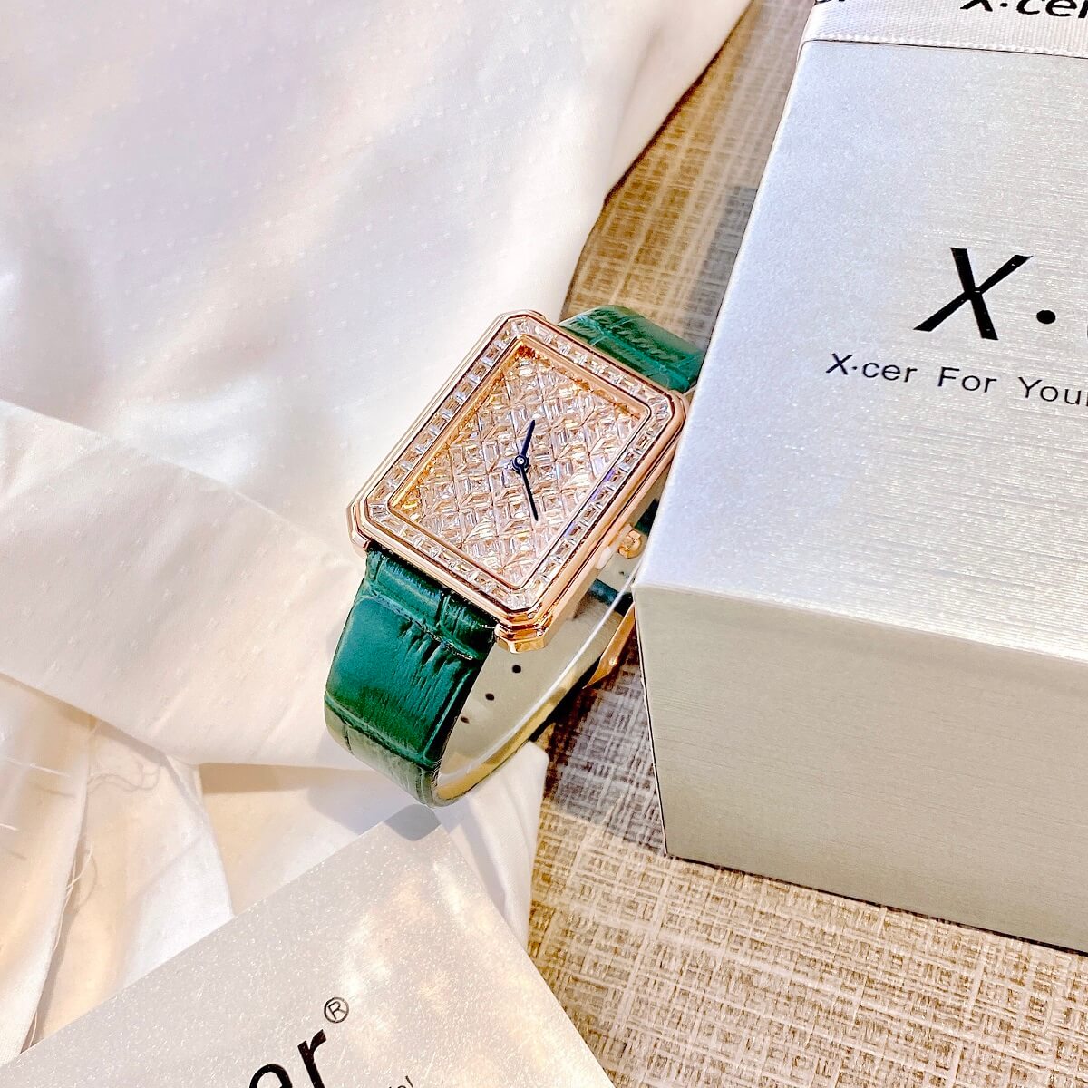 Đồng Hồ Nữ X-cer B0642 Dây Da Green Rose 34mm chính hãng máy Nhật - Phong cách của những quý cô ghiền kim cương