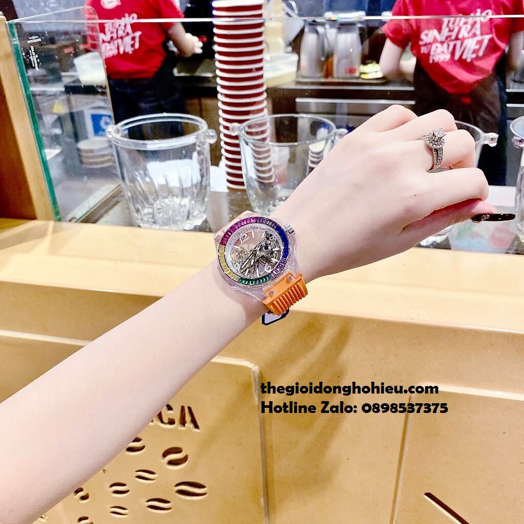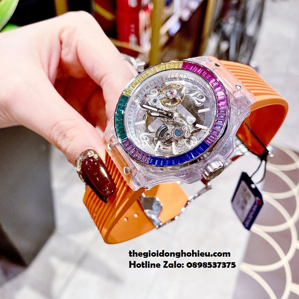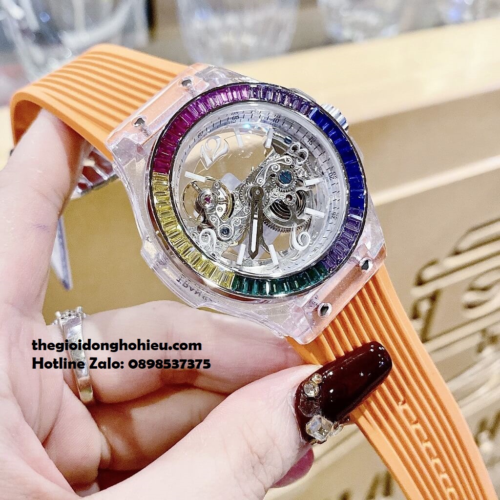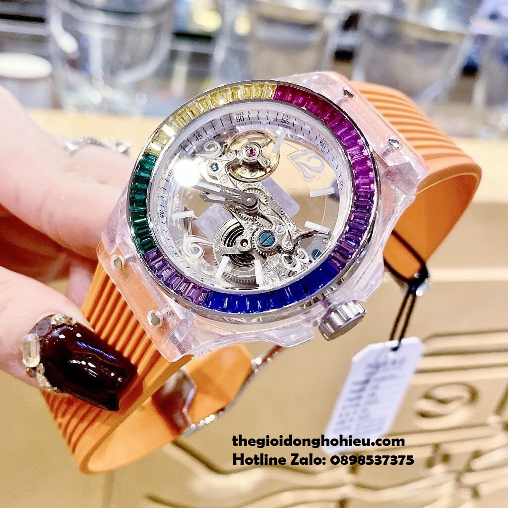 - Thiết kế kiểu dáng Hub.lot với viền đá 7 sắc cầu vồng rực rỡ, có thể xoay được